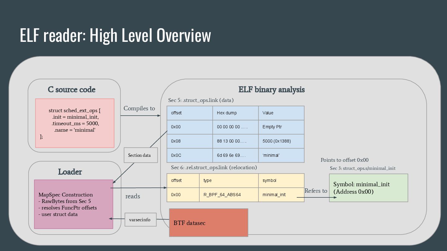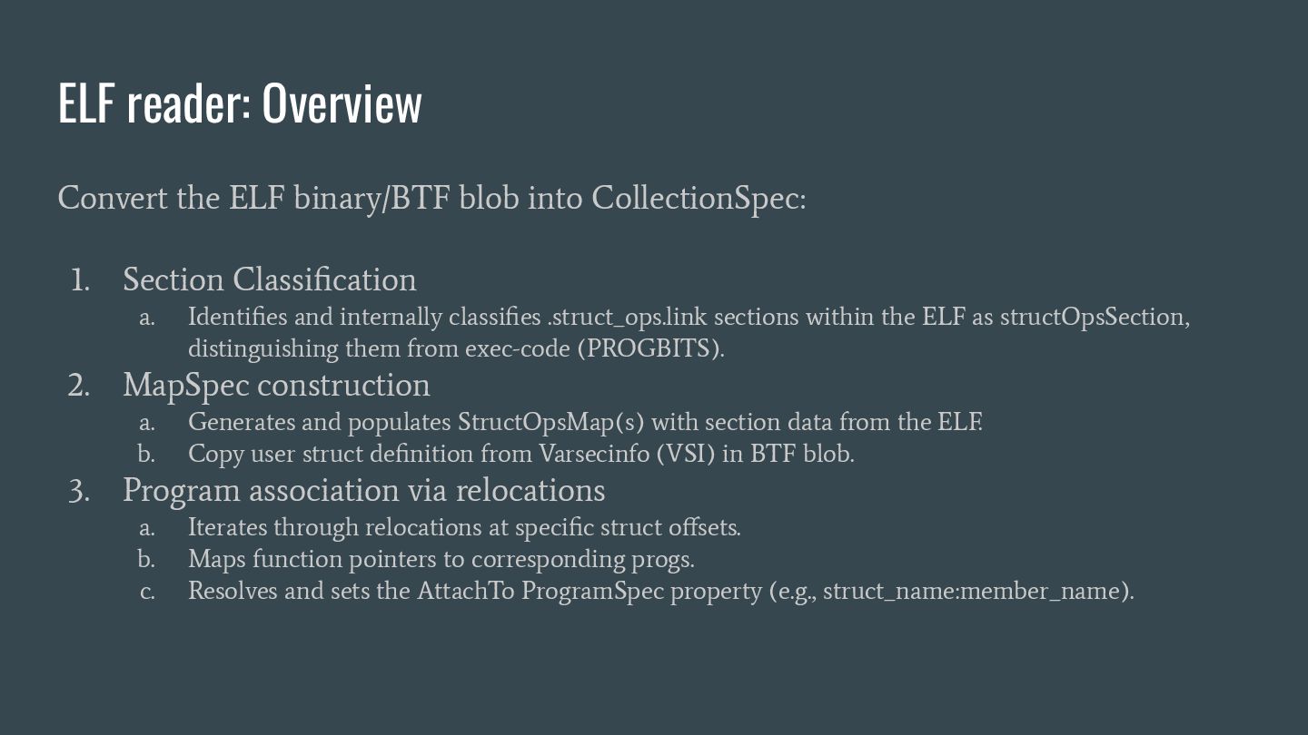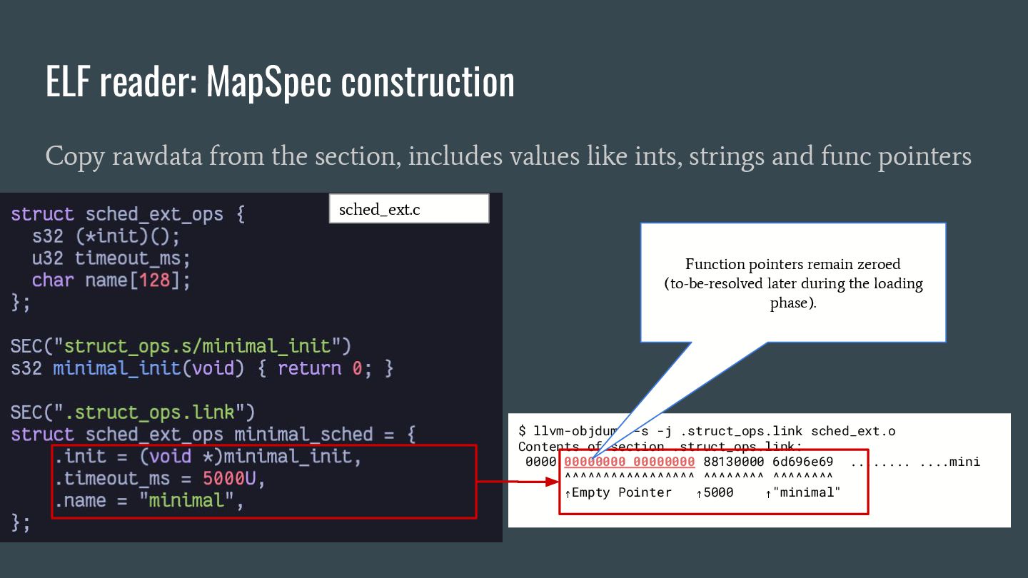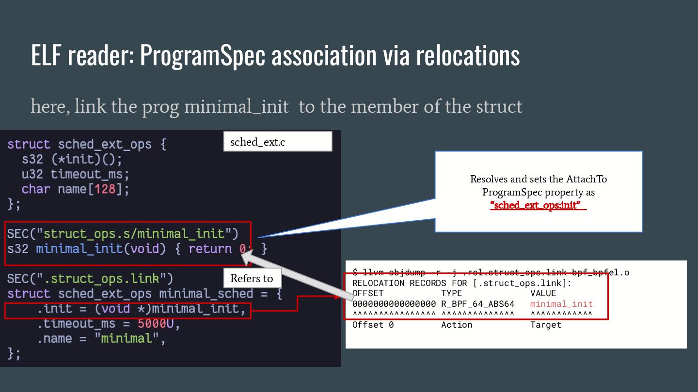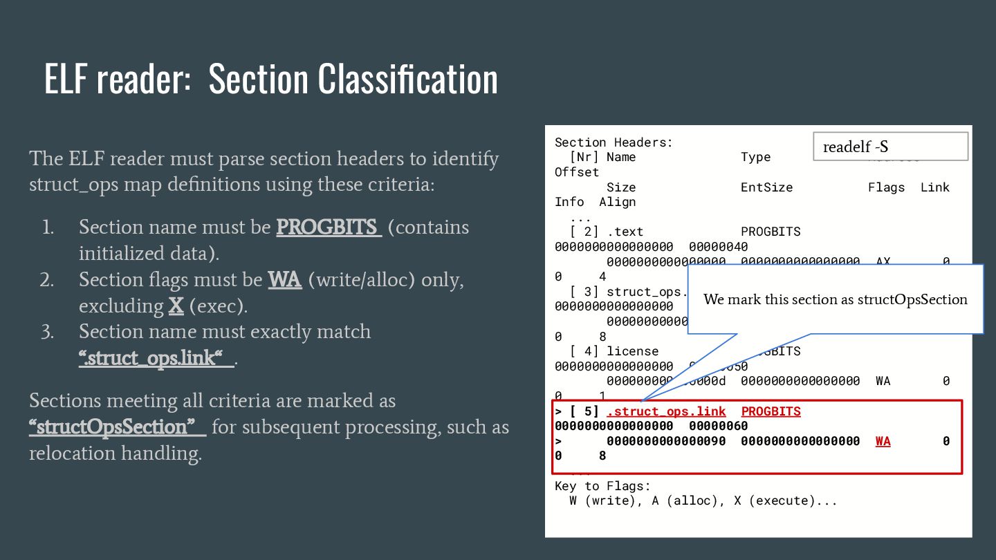 headers to identify struct_ops map definitions using these criteria: 1. Section name must be PROGBITS (contains initialized data). 2. Section flags must be WA (write/alloc) only, excluding X (exec). 3. Section name must exactly match “.struct_ops.link“ . Sections meeting all criteria are marked as “structOpsSection” for subsequent processing, such as relocation handling. Section Headers: [Nr] Name Type Address Offset Size EntSize Flags Link Info Align ... [ 2] .text PROGBITS 0000000000000000 00000040 0000000000000000 0000000000000000 AX 0 0 4 [ 3] struct_ops.s[...] PROGBITS 0000000000000000 00000040 0000000000000010 0000000000000000 AX 0 0 8 [ 4] license PROGBITS 0000000000000000 00000050 000000000000000d 0000000000000000 WA 0 0 1 > [ 5] .struct_ops.link PROGBITS 0000000000000000 00000060 > 0000000000000090 0000000000000000 WA 0 0 8 ... Key to Flags: W (write), A (alloc), X (execute)... readelf -S We mark this section as structOpsSection