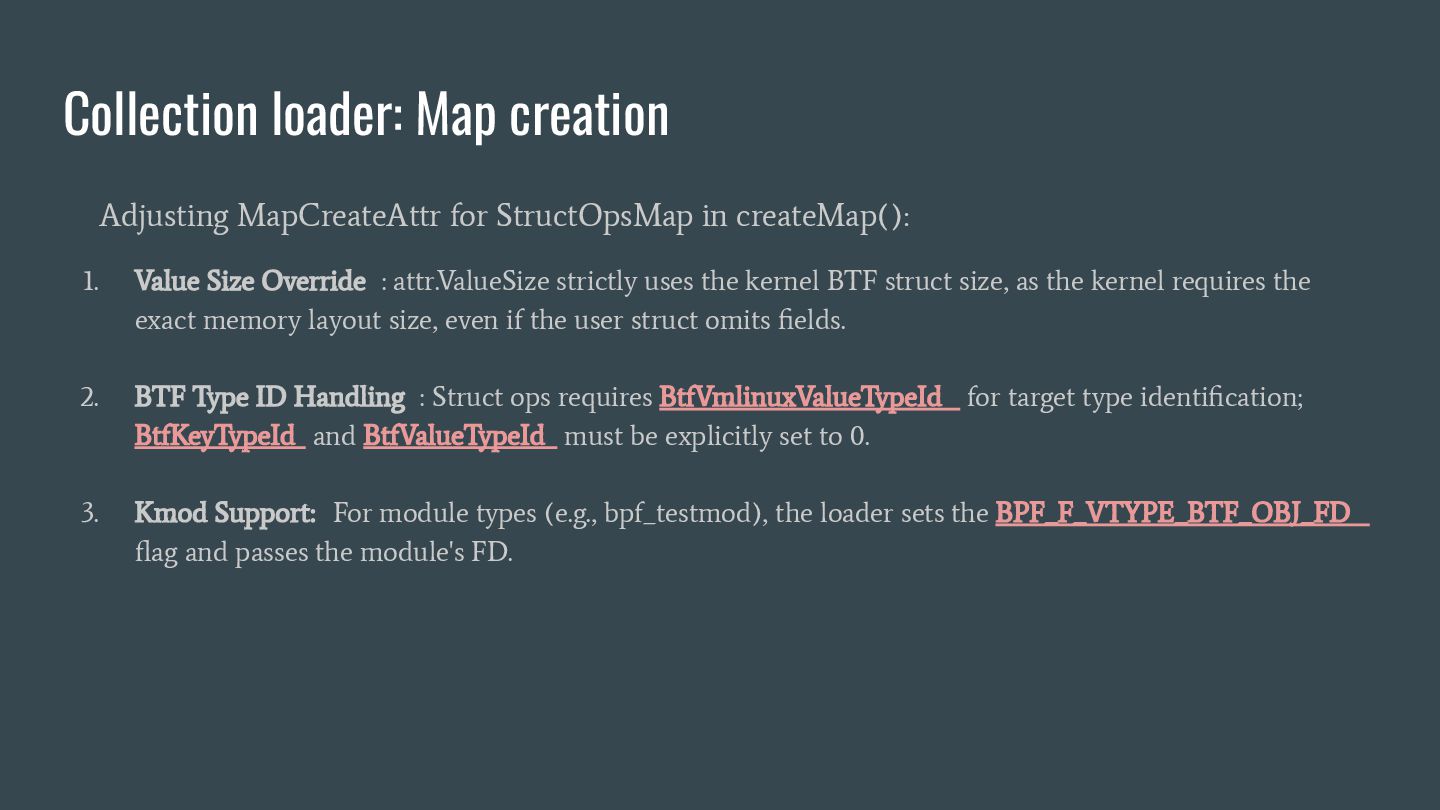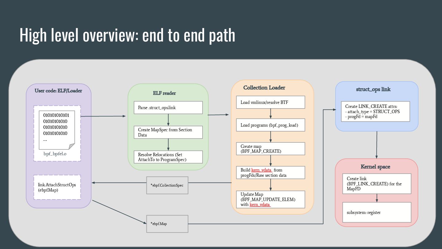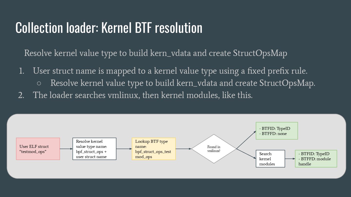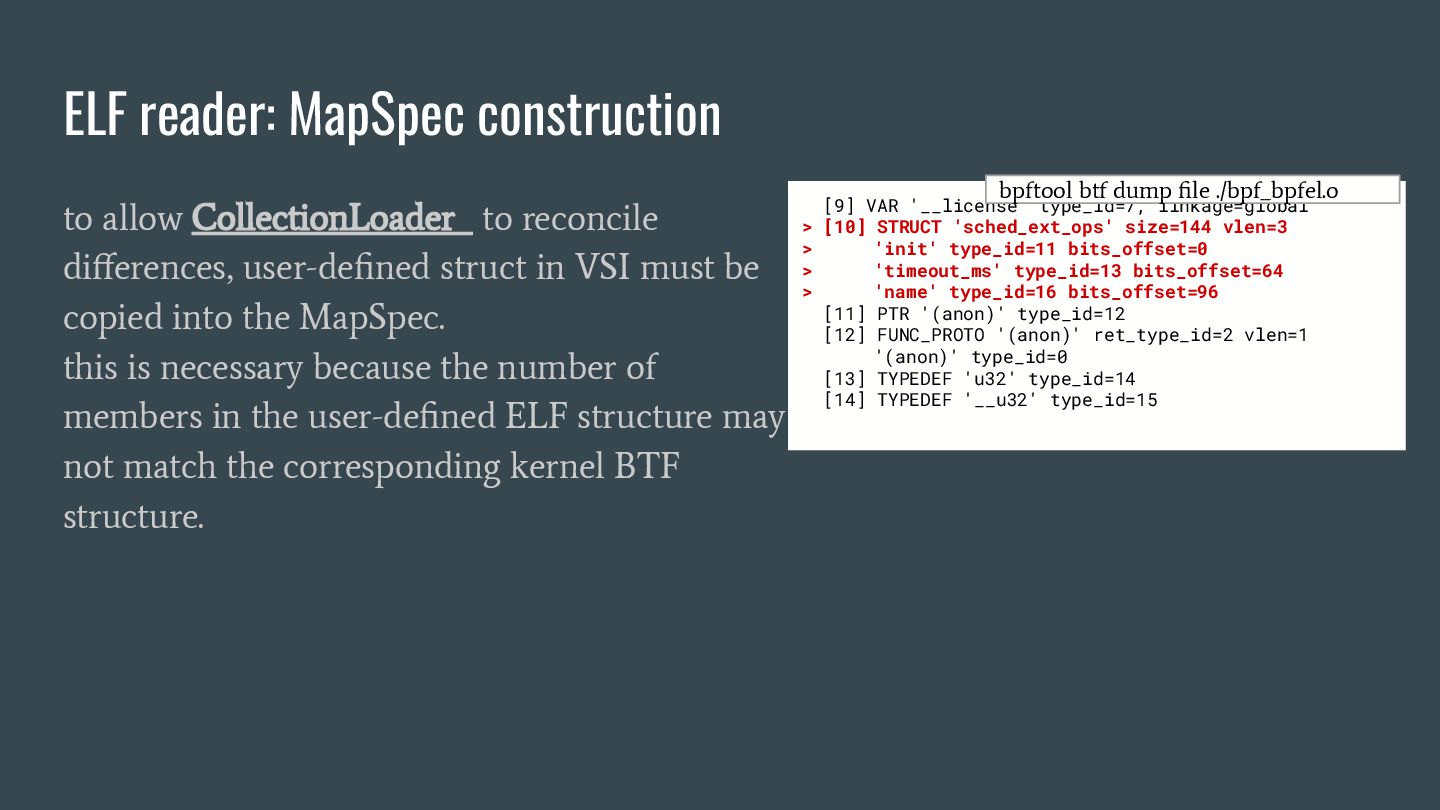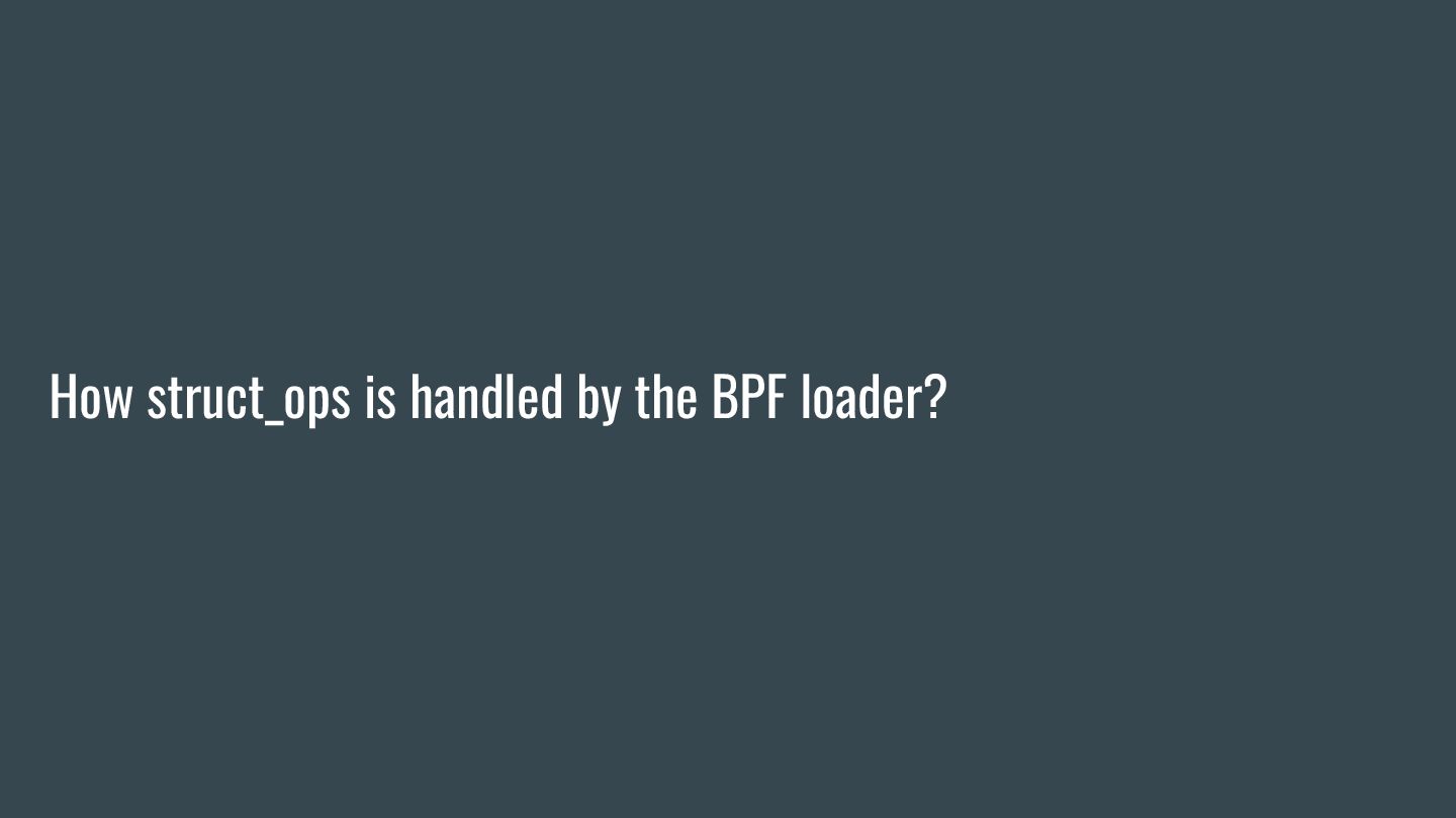 headers to identify struct_ops map definitions using these criteria: 1. Section name must be PROGBITS (contains initialized data). 2. Section flags must be WA (write/alloc) only, excluding X (exec). 3. Section name must exactly match “.struct_ops.link“ . Sections meeting all criteria are marked as “structOpsSection” for subsequent processing, such as relocation handling. Section Headers: [Nr] Name Type Address Offset Size EntSize Flags Link Info Align ... [ 2] .text PROGBITS 0000000000000000 00000040 0000000000000000 0000000000000000 AX 0 0 4 [ 3] struct_ops.s[...] PROGBITS 0000000000000000 00000040 0000000000000010 0000000000000000 AX 0 0 8 [ 4] license PROGBITS 0000000000000000 00000050 000000000000000d 0000000000000000 WA 0 0 1 > [ 5] .struct_ops.link PROGBITS 0000000000000000 00000060 > 0000000000000090 0000000000000000 WA 0 0 8 ... Key to Flags: W (write), A (alloc), X (execute)... readelf -S We mark this section as structOpsSection