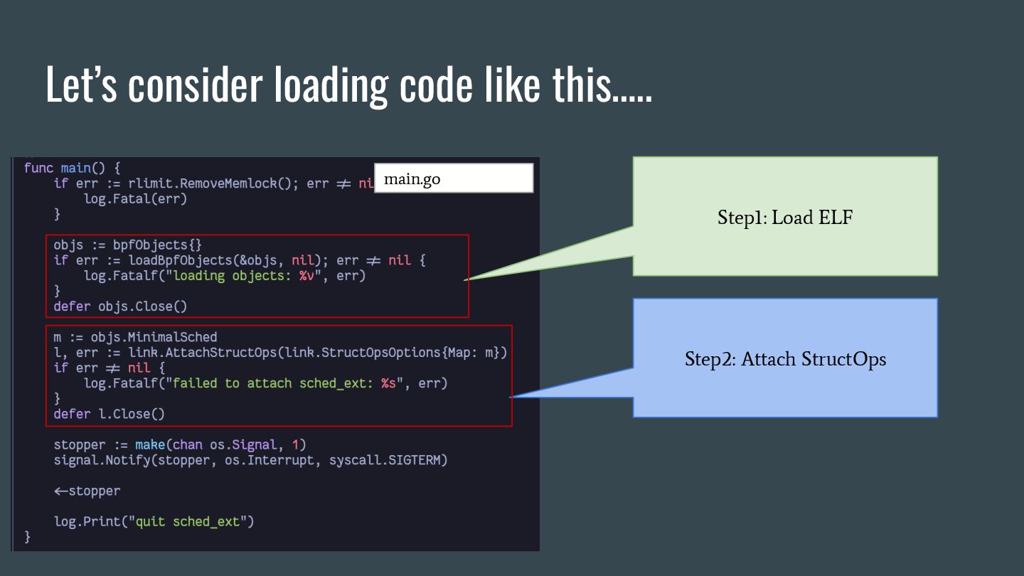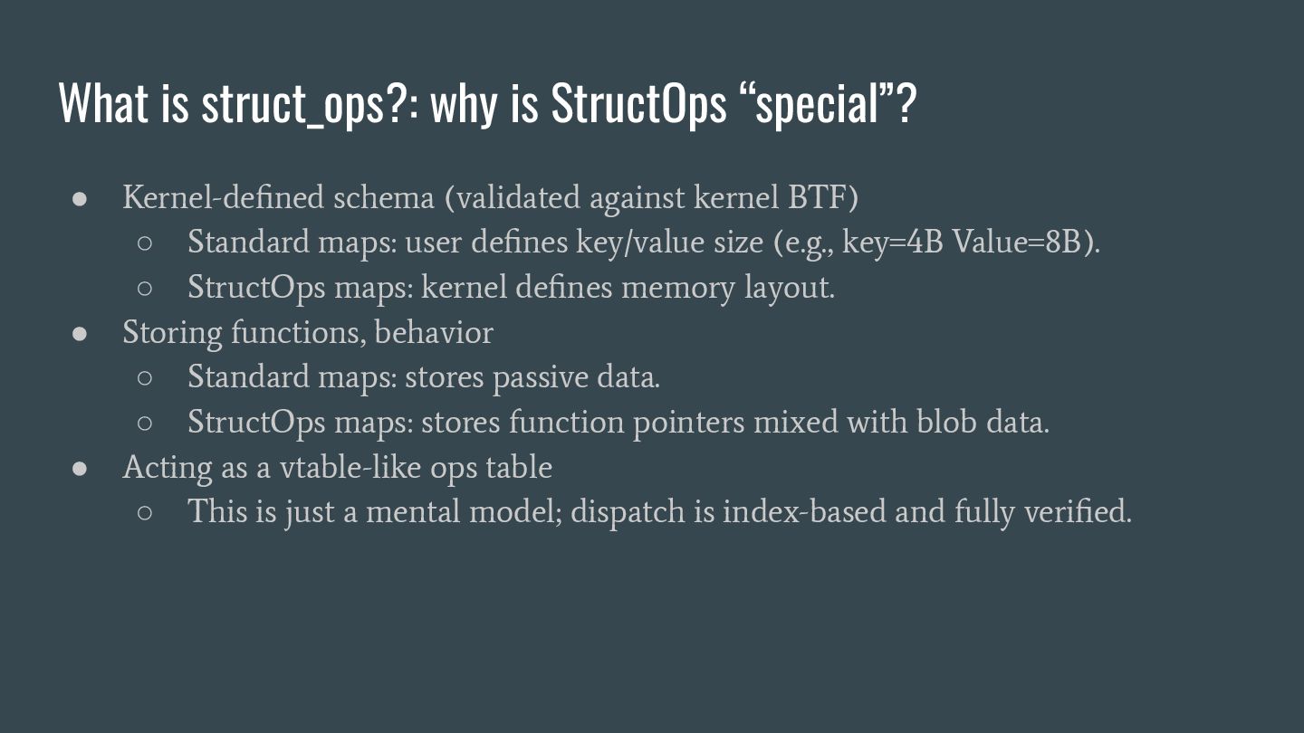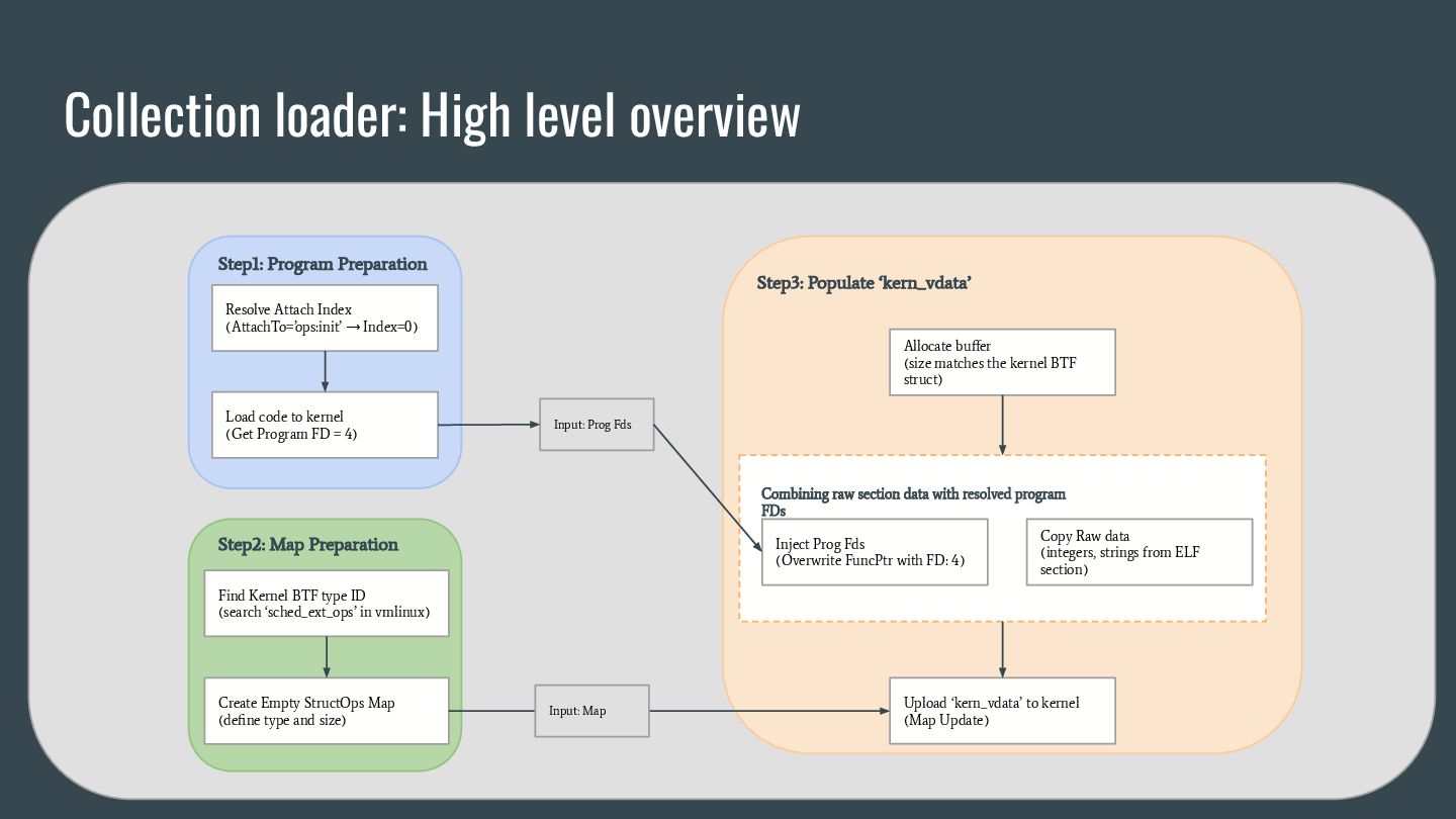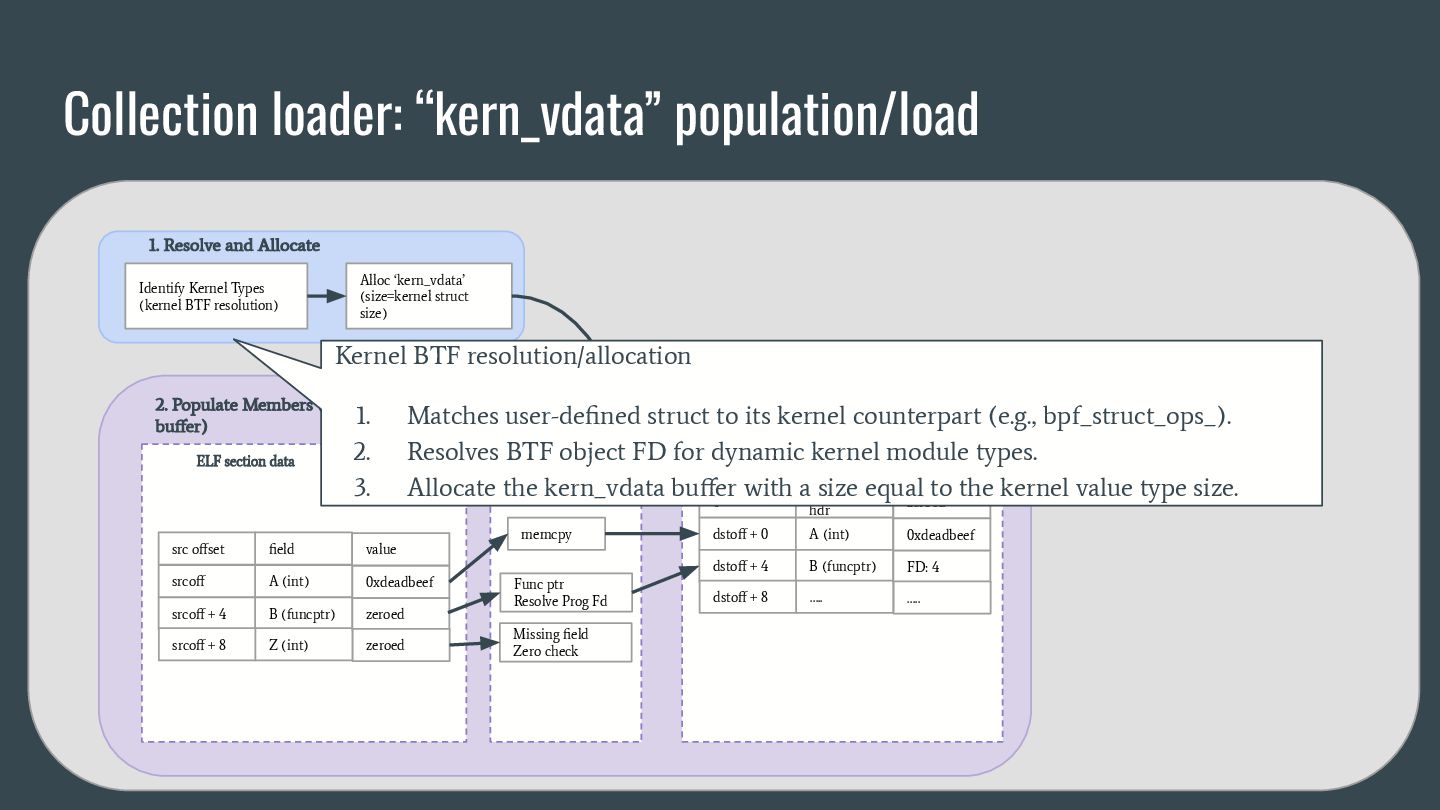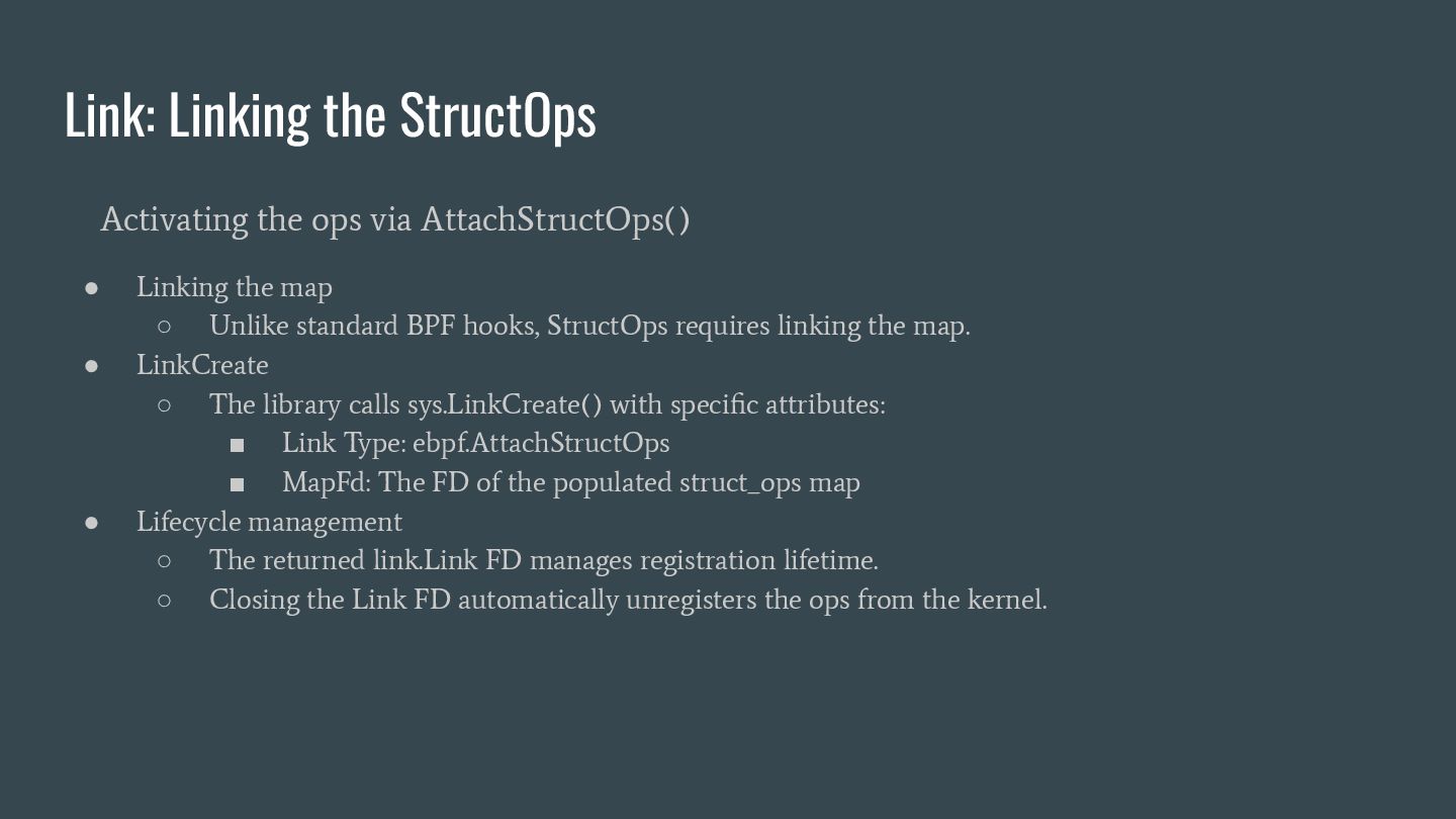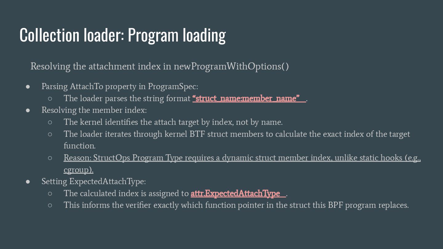 headers to identify struct_ops map definitions using these criteria: 1. Section name must be PROGBITS (contains initialized data). 2. Section flags must be WA (write/alloc) only, excluding X (exec). 3. Section name must exactly match “.struct_ops.link“ . Sections meeting all criteria are marked as “structOpsSection” for subsequent processing, such as relocation handling. Section Headers: [Nr] Name Type Address Offset Size EntSize Flags Link Info Align ... [ 2] .text PROGBITS 0000000000000000 00000040 0000000000000000 0000000000000000 AX 0 0 4 [ 3] struct_ops.s[...] PROGBITS 0000000000000000 00000040 0000000000000010 0000000000000000 AX 0 0 8 [ 4] license PROGBITS 0000000000000000 00000050 000000000000000d 0000000000000000 WA 0 0 1 > [ 5] .struct_ops.link PROGBITS 0000000000000000 00000060 > 0000000000000090 0000000000000000 WA 0 0 8 ... Key to Flags: W (write), A (alloc), X (execute)... readelf -S We mark this section as structOpsSection