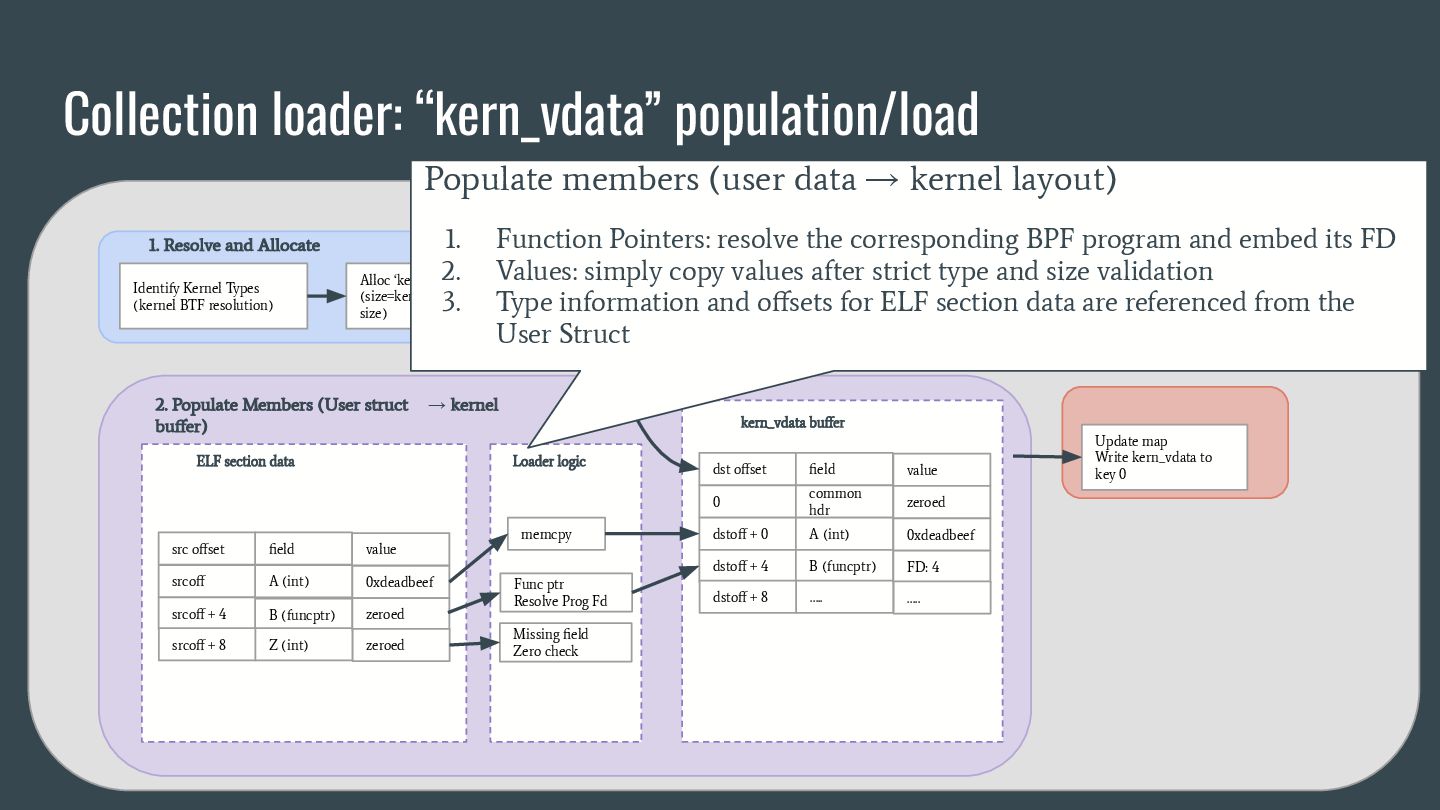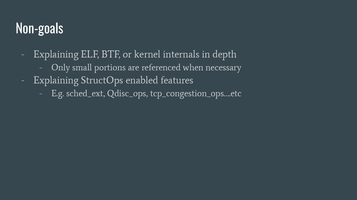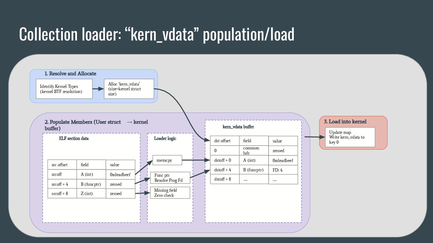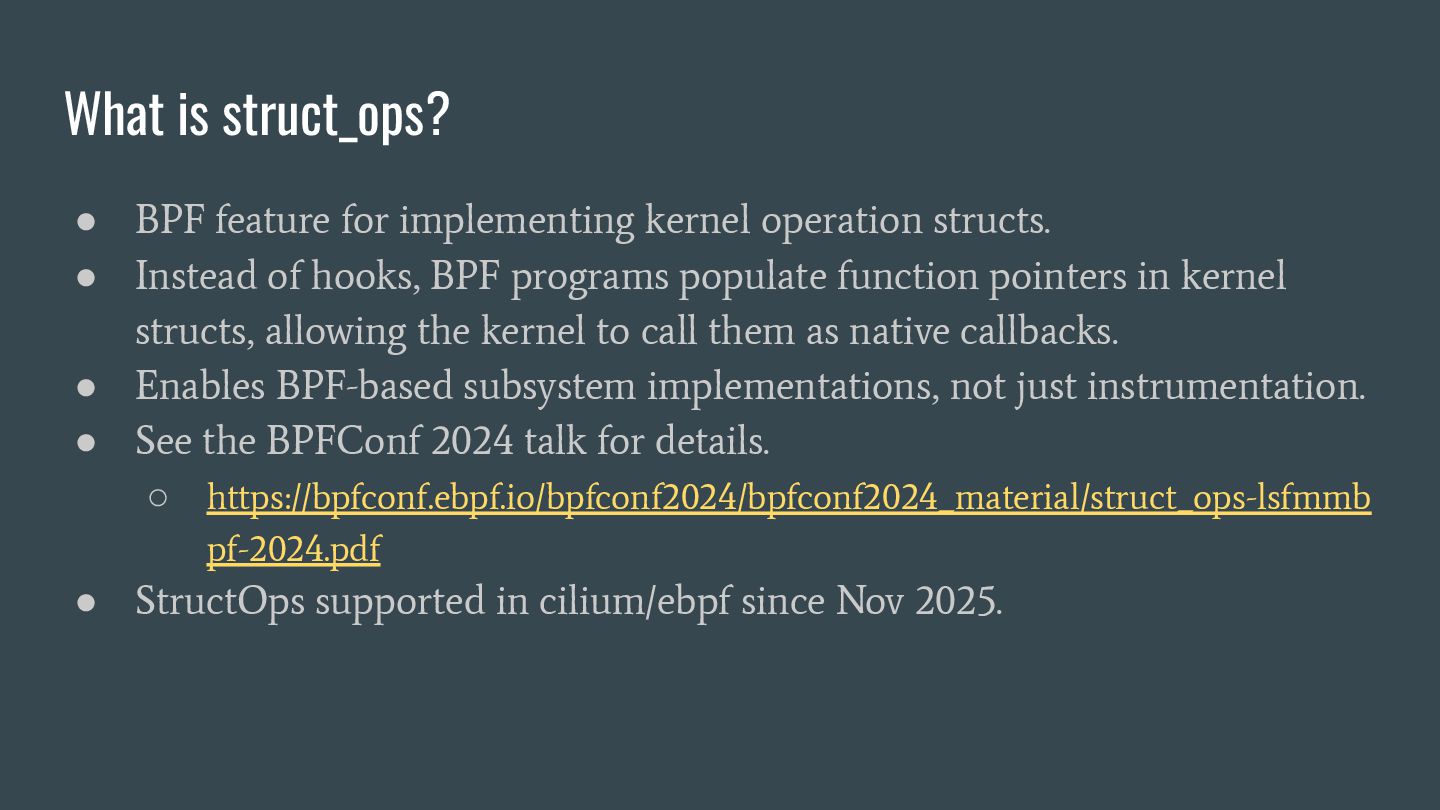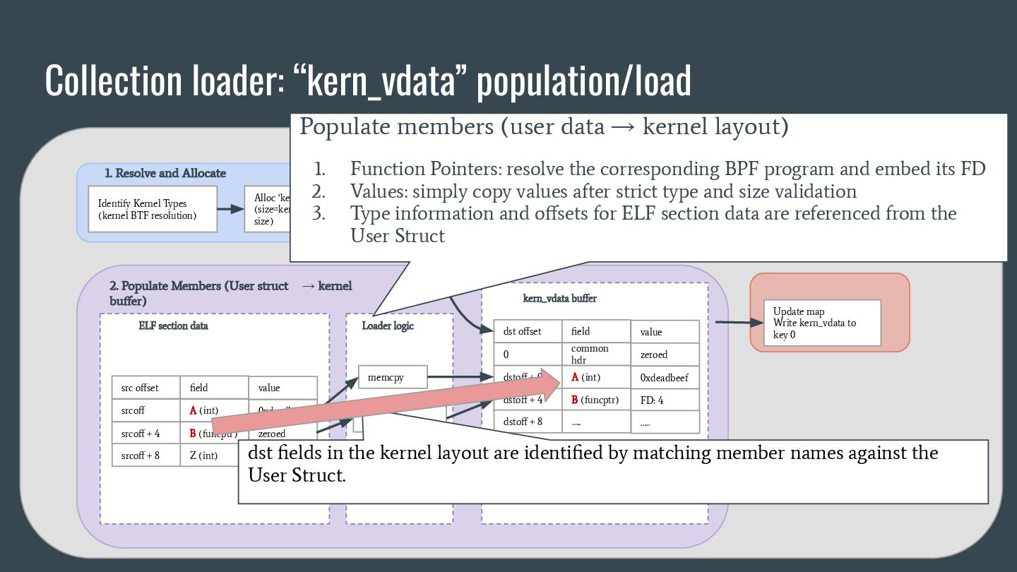 headers to identify struct_ops map definitions using these criteria: 1. Section name must be PROGBITS (contains initialized data). 2. Section flags must be WA (write/alloc) only, excluding X (exec). 3. Section name must exactly match “.struct_ops.link“ . Sections meeting all criteria are marked as “structOpsSection” for subsequent processing, such as relocation handling. Section Headers: [Nr] Name Type Address Offset Size EntSize Flags Link Info Align ... [ 2] .text PROGBITS 0000000000000000 00000040 0000000000000000 0000000000000000 AX 0 0 4 [ 3] struct_ops.s[...] PROGBITS 0000000000000000 00000040 0000000000000010 0000000000000000 AX 0 0 8 [ 4] license PROGBITS 0000000000000000 00000050 000000000000000d 0000000000000000 WA 0 0 1 > [ 5] .struct_ops.link PROGBITS 0000000000000000 00000060 > 0000000000000090 0000000000000000 WA 0 0 8 ... Key to Flags: W (write), A (alloc), X (execute)... readelf -S We mark this section as structOpsSection