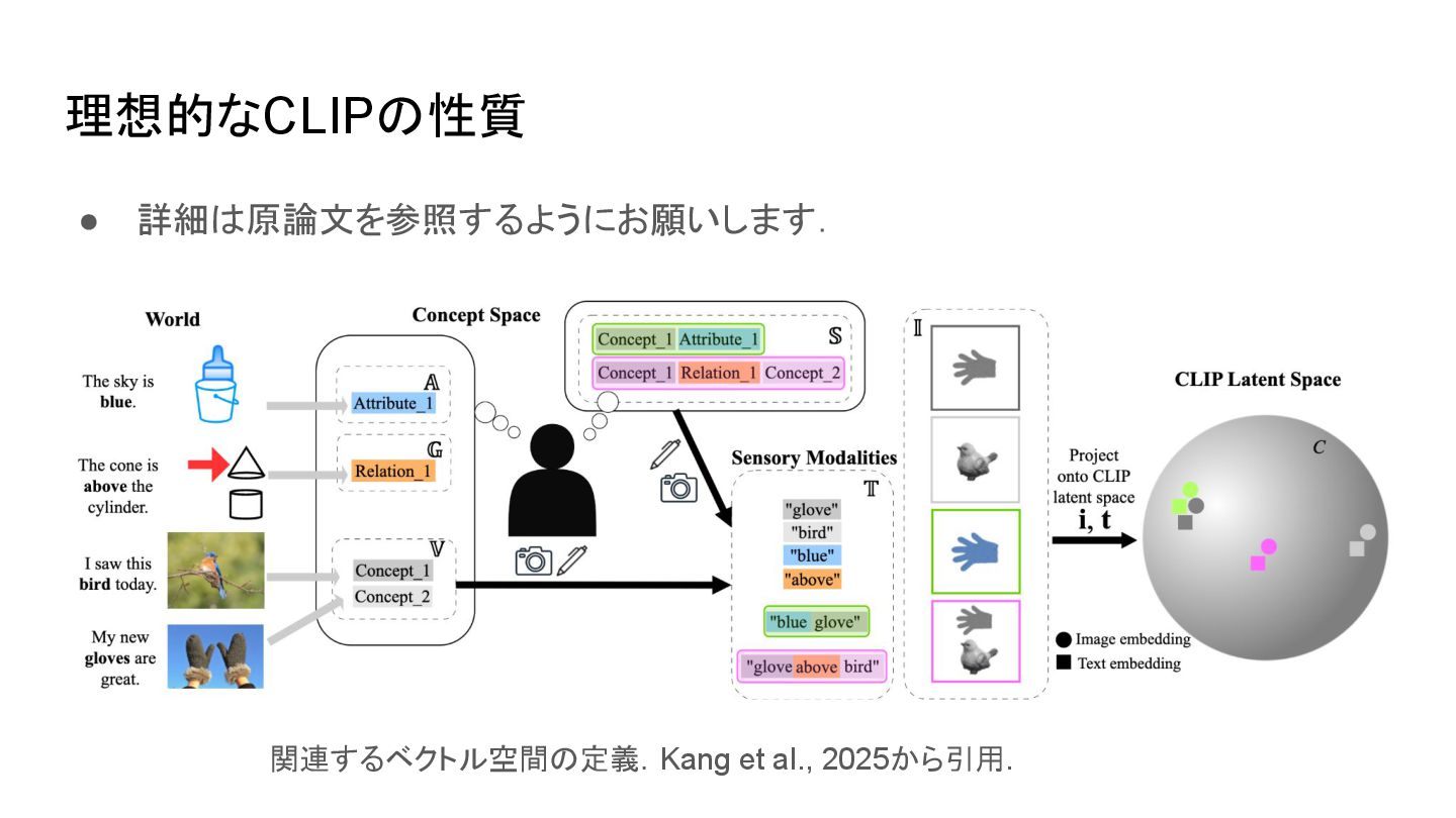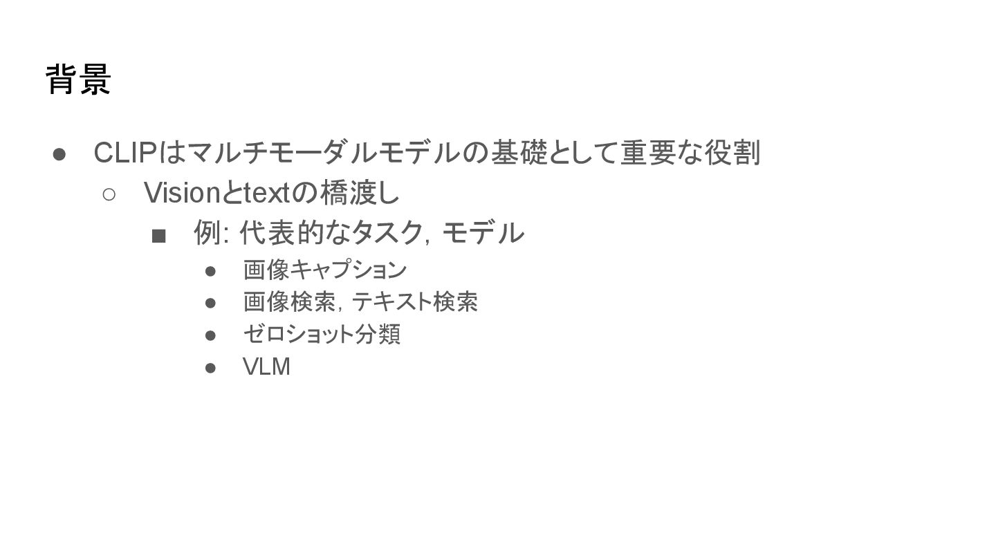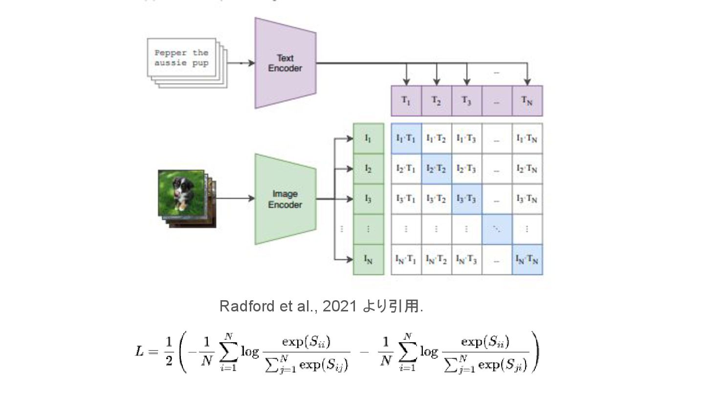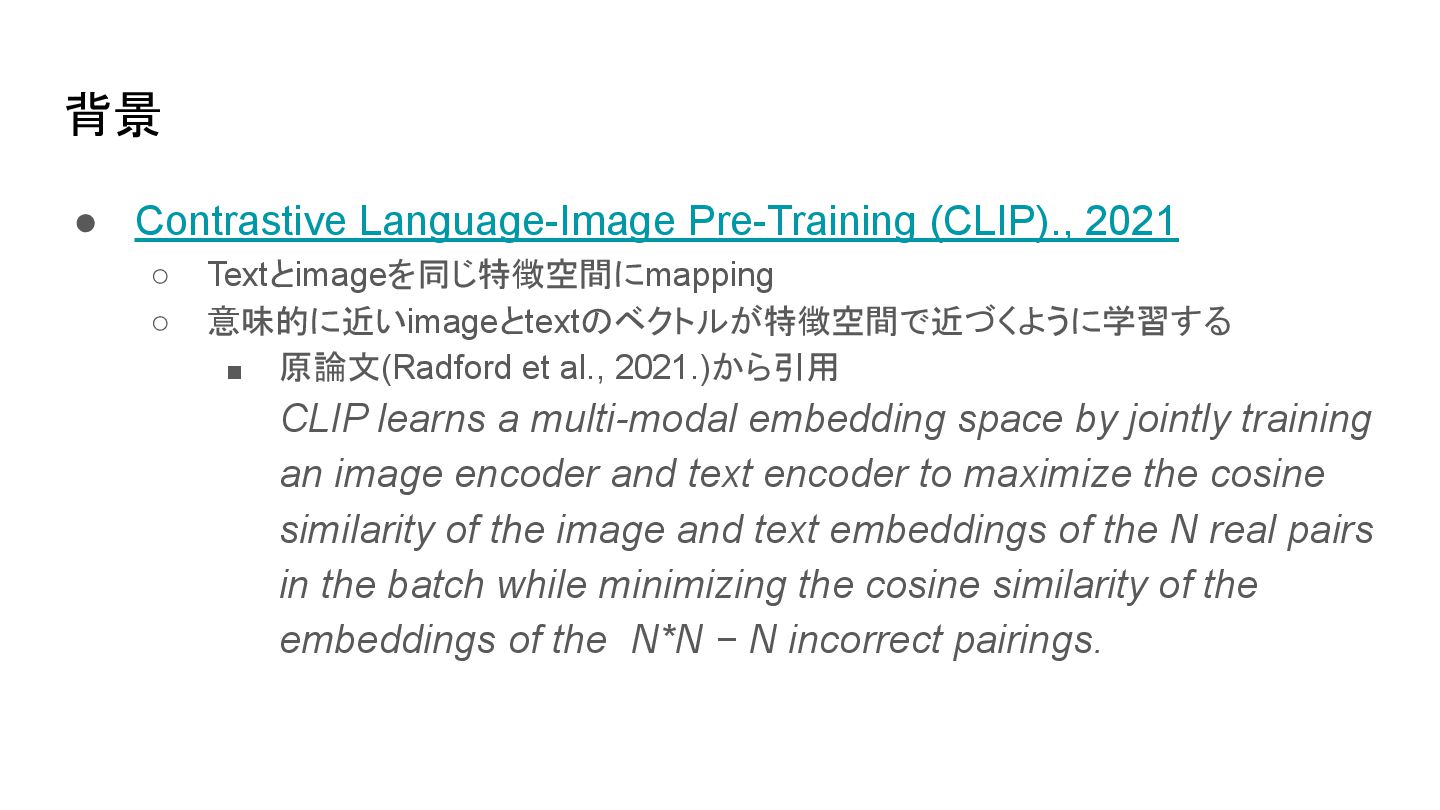 ▪ 原論文(Radford et al., 2021.)から引用 CLIP learns a multi-modal embedding space by jointly training an image encoder and text encoder to maximize the cosine similarity of the image and text embeddings of the N real pairs in the batch while minimizing the cosine similarity of the embeddings of the N*N − N incorrect pairings. 背景