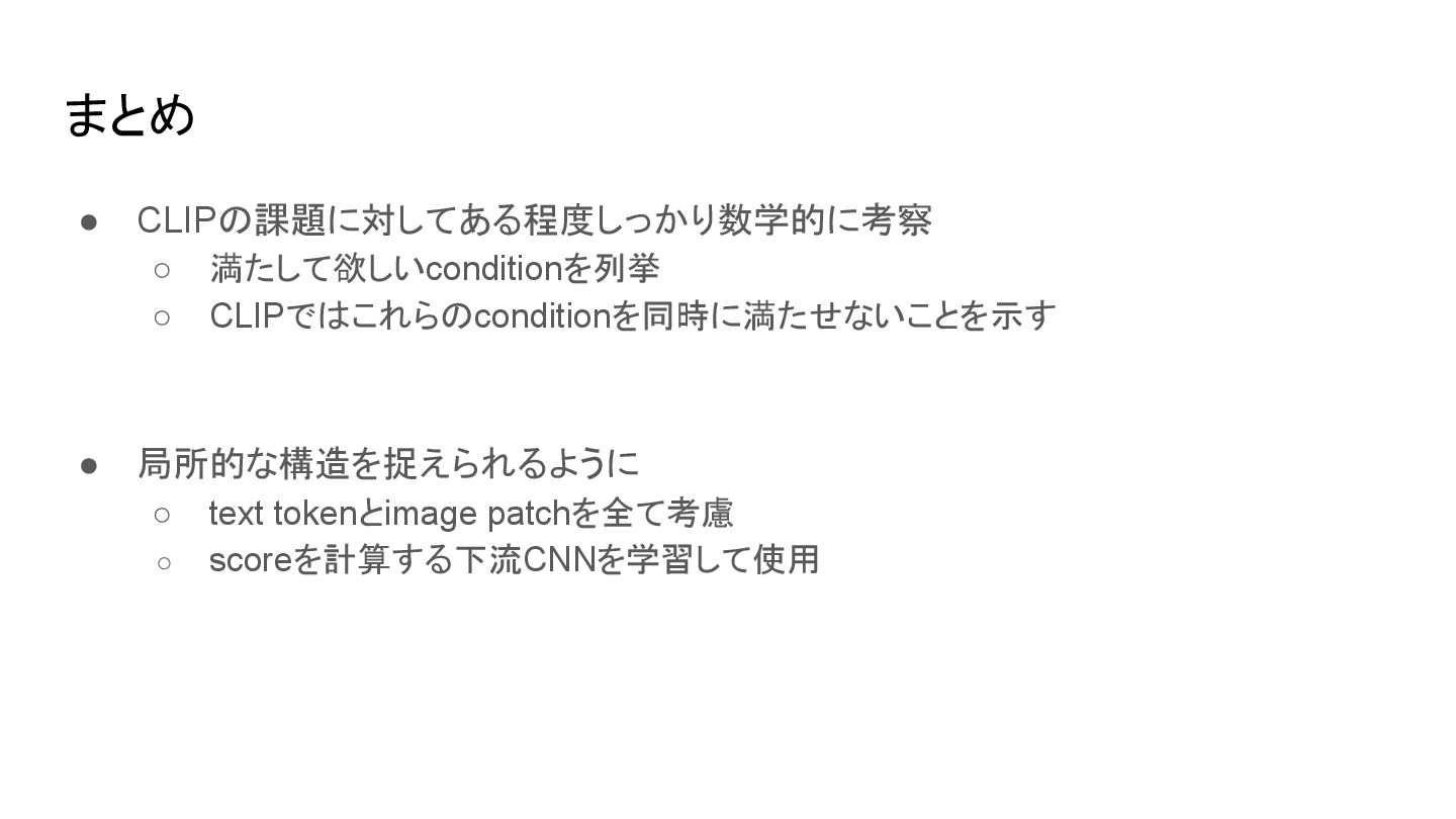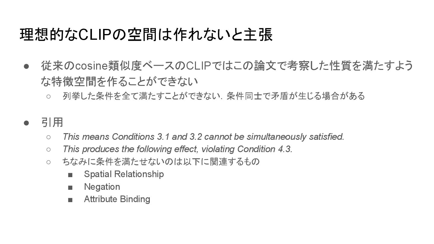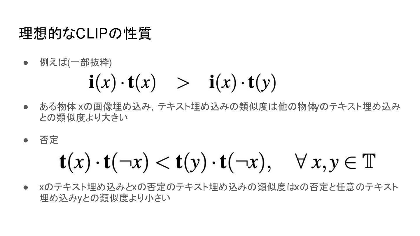 ▪ 原論文(Radford et al., 2021.)から引用 CLIP learns a multi-modal embedding space by jointly training an image encoder and text encoder to maximize the cosine similarity of the image and text embeddings of the N real pairs in the batch while minimizing the cosine similarity of the embeddings of the N*N − N incorrect pairings. 背景