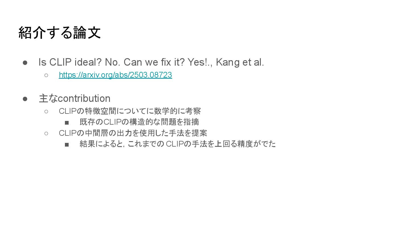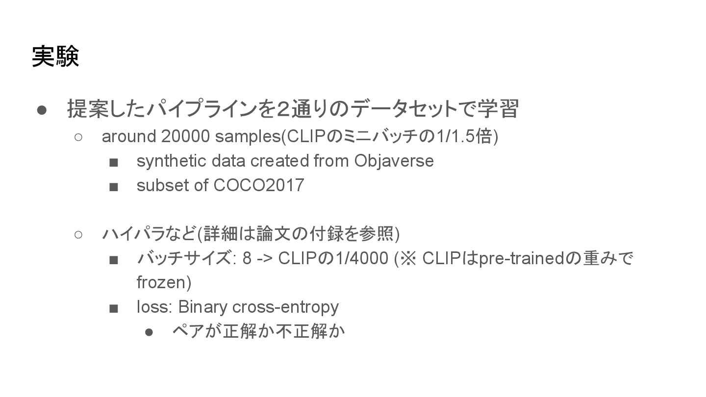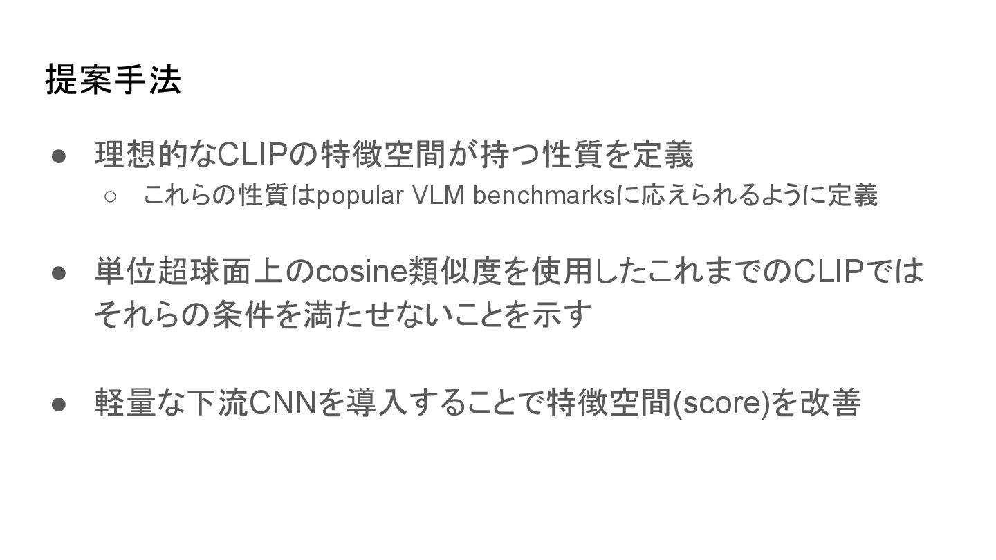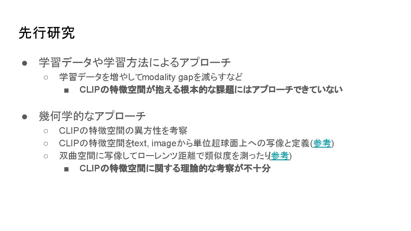 ▪ 原論文(Radford et al., 2021.)から引用 CLIP learns a multi-modal embedding space by jointly training an image encoder and text encoder to maximize the cosine similarity of the image and text embeddings of the N real pairs in the batch while minimizing the cosine similarity of the embeddings of the N*N − N incorrect pairings. 背景