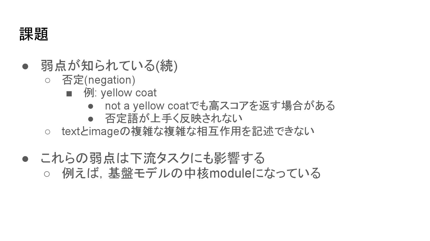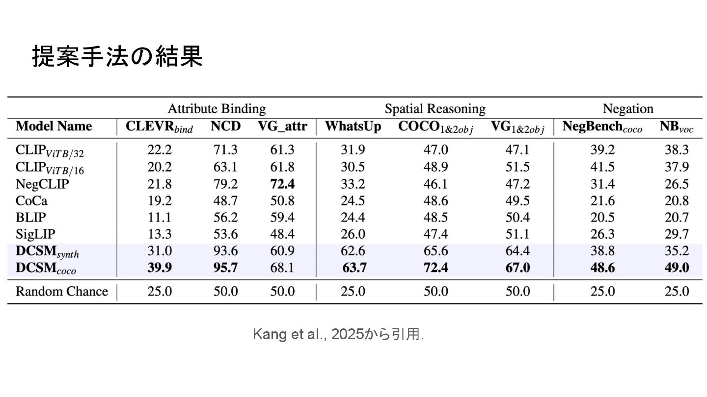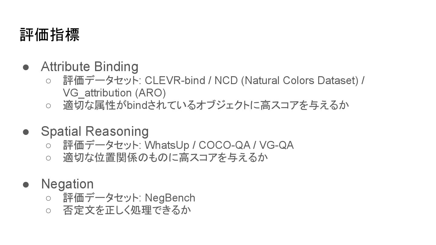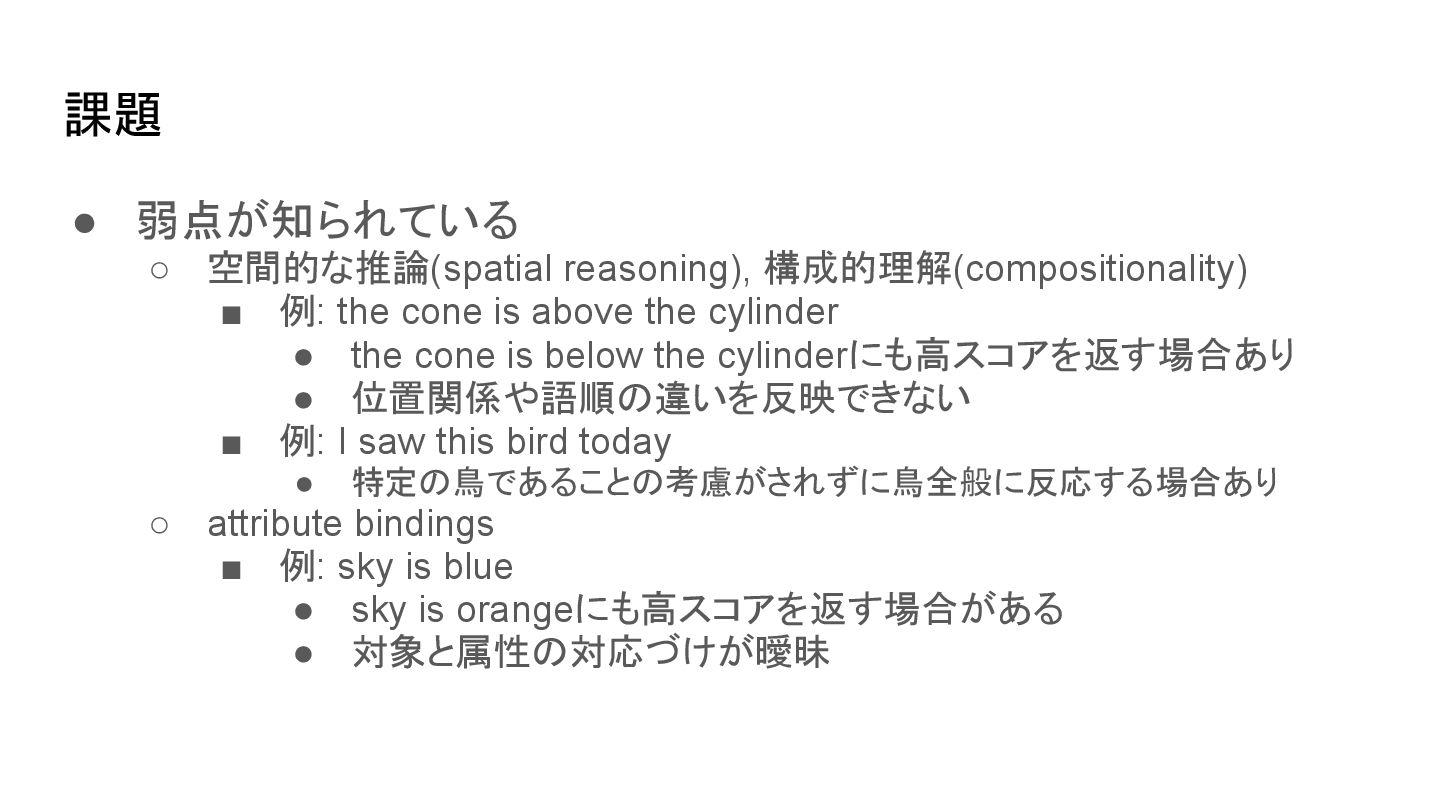 cone is above the cylinder • the cone is below the cylinderにも高スコアを返す場合あり • 位置関係や語順の違いを反映できない ▪ 例: I saw this bird today • 特定の鳥であることの考慮がされずに鳥全般に反応する場合あり ◦ attribute bindings ▪ 例: sky is blue • sky is orangeにも高スコアを返す場合がある • 対象と属性の対応づけが曖昧
