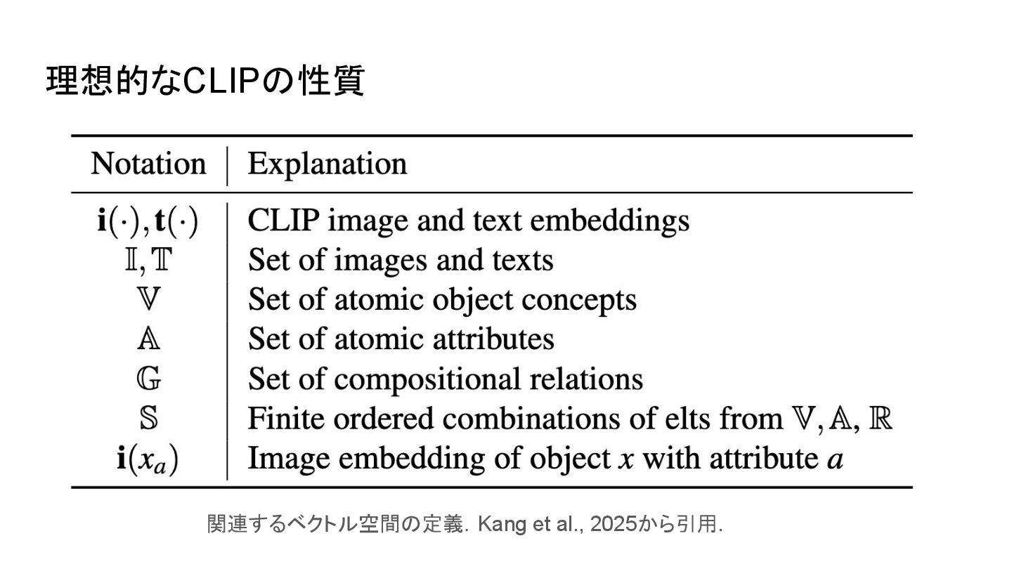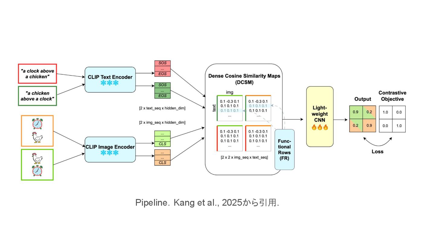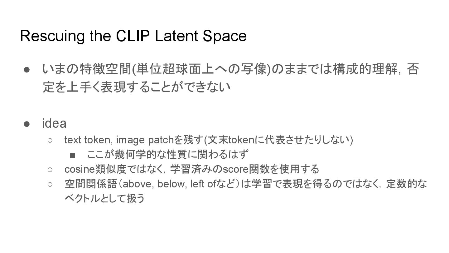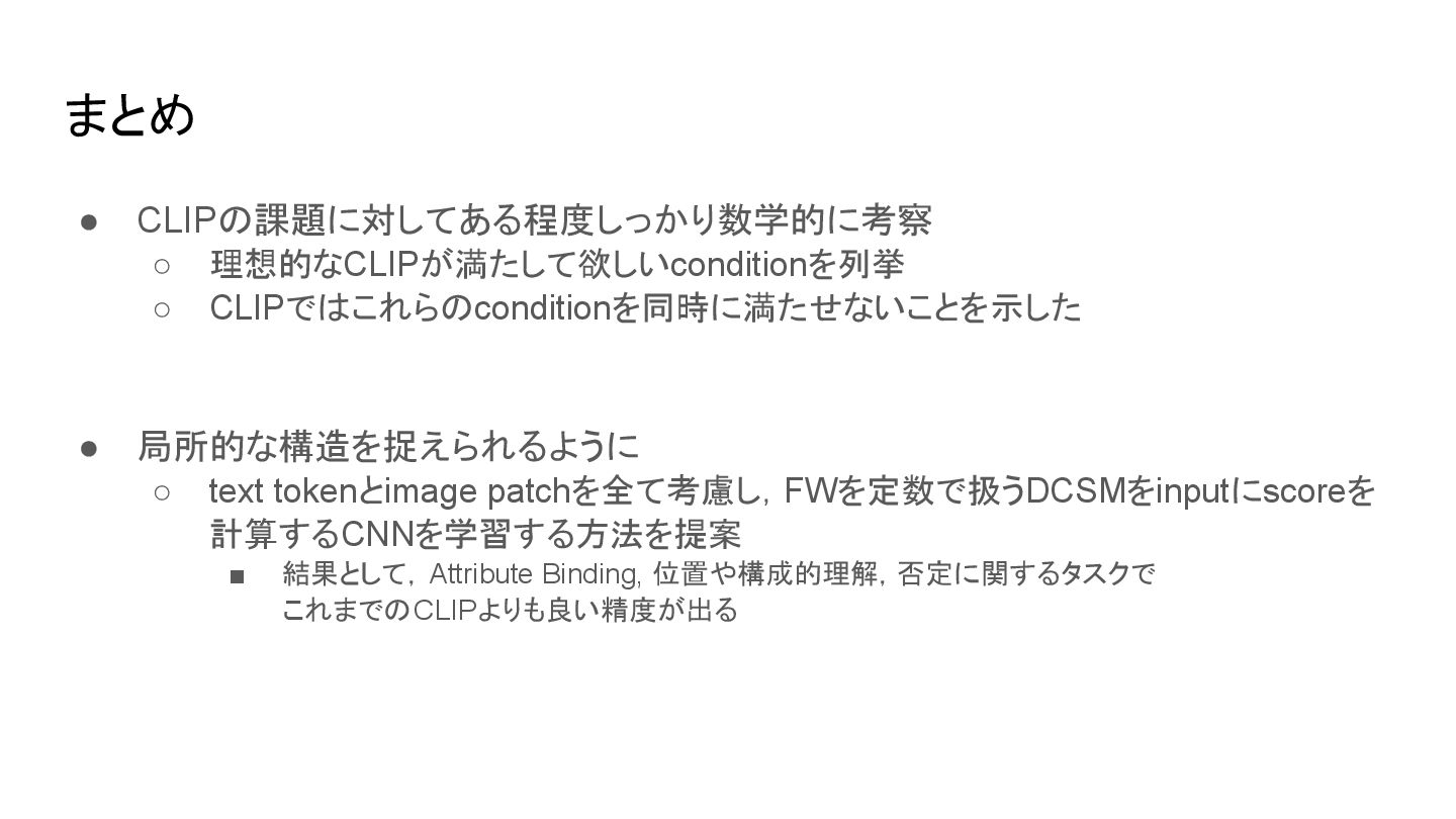 cone is above the cylinder • the cone is below the cylinderにも高スコアを返す場合あり • 位置関係や語順の違いを反映できない ▪ 例: I saw this bird today • 特定の鳥であることの考慮がされずに鳥全般に反応する場合あり ◦ attribute bindings ▪ 例: sky is blue • sky is orangeにも高スコアを返す場合がある • 対象と属性の対応づけが曖昧