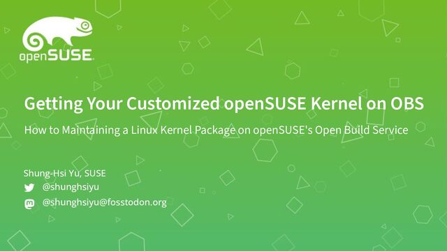 Build Service Getting Your Customized openSUSE Kernel on OBS Shung-Hsi Yu, SUSE @shunghsiyu @