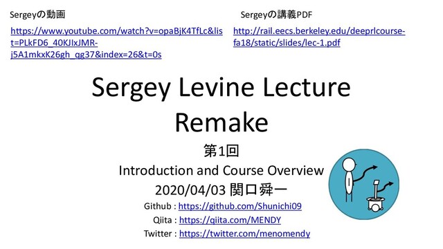 関口舜一 Twitter : https://twitter.com/menomendy Github : https://github.com/Shunichi09 Qiita : https://qiita.com/MENDY https://www.youtube.com/watch?v=opaBjK4TfLc&lis t=PLkFD6_40KJIxJMR- j5A1mkxK26gh_qg37&index=26&t=0s Sergeyの動画 Sergeyの講義PDF http://rail.eecs.berkeley.edu/deeprlcourse- fa18/static/slides/lec-1.pdf