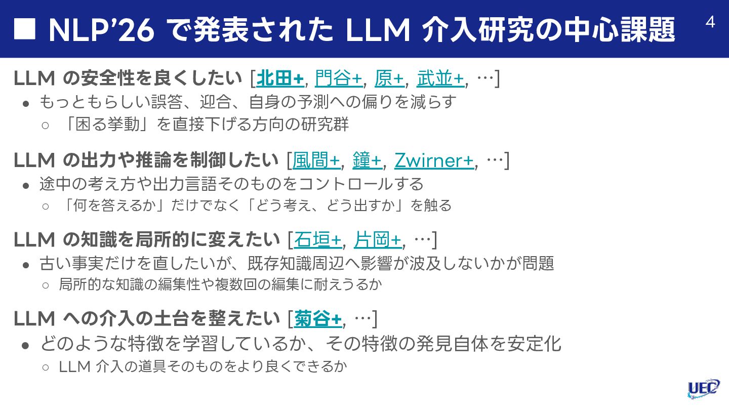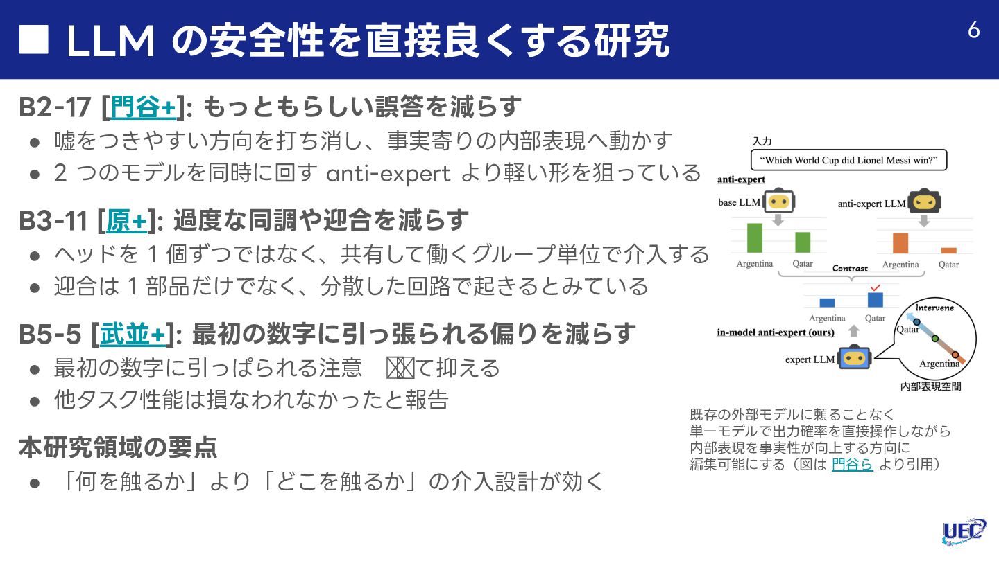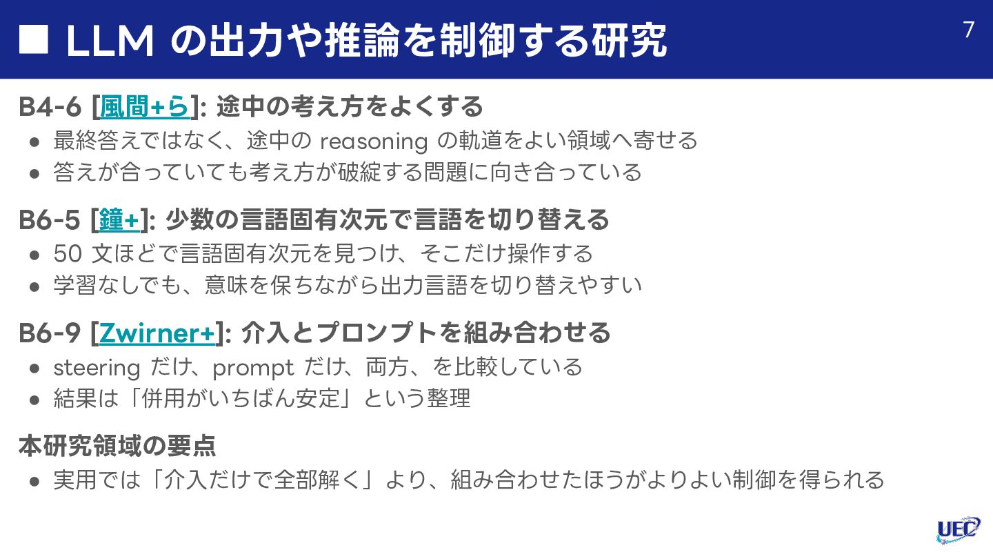 大規模言語モデル(LLM)に対する内部介入(steering / intervention)は、重み更新を伴わずに推論時の振る舞いを制御できる手法として、近年急速に注目を集めています。本発表では、この軽量かつ柔軟な制御パラダイムの可能性と限界について、言語処理学会 2026 における関連研究を体系的に整理しながら概観します。特に、北田+「ステアリングベクトルは日本語LLMを堅牢に制御できるか?」を中心に、評価・安全性・多言語制御・表現学習といった観点から、内部介入がどこまで信頼できる制御として機能するのかを議論します。
