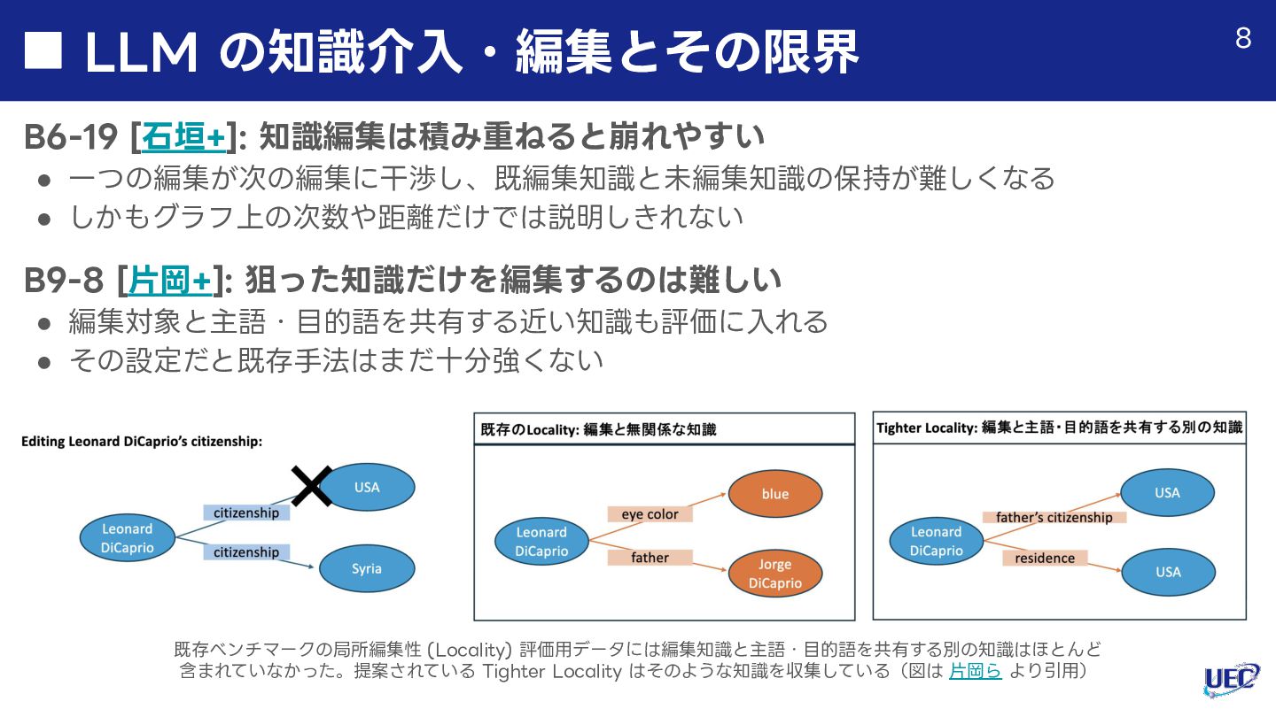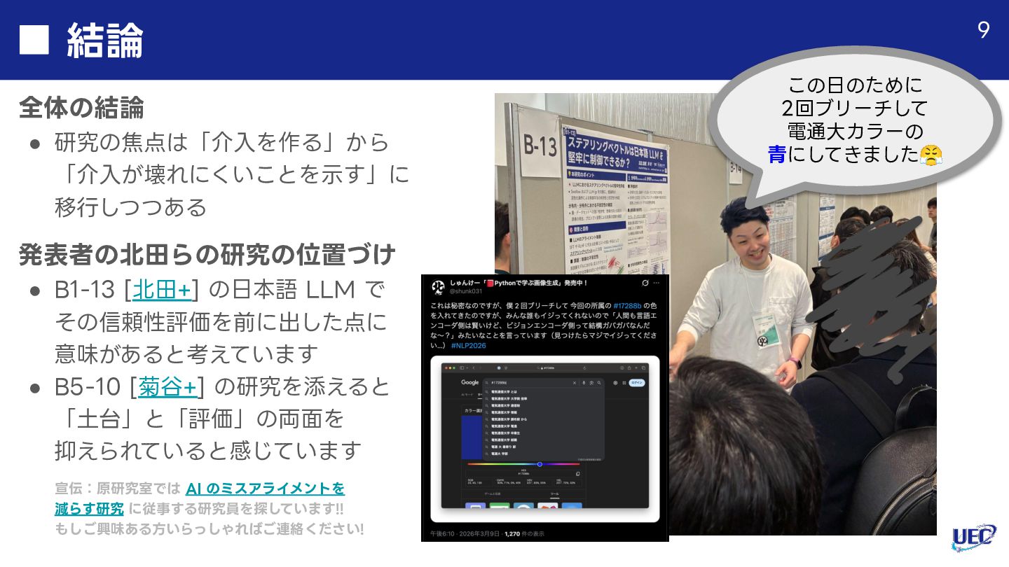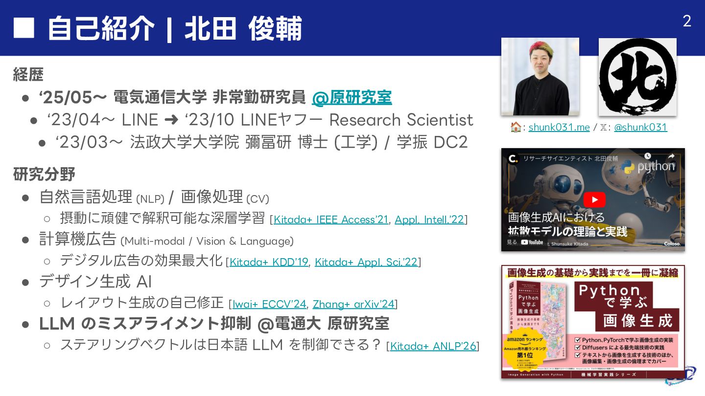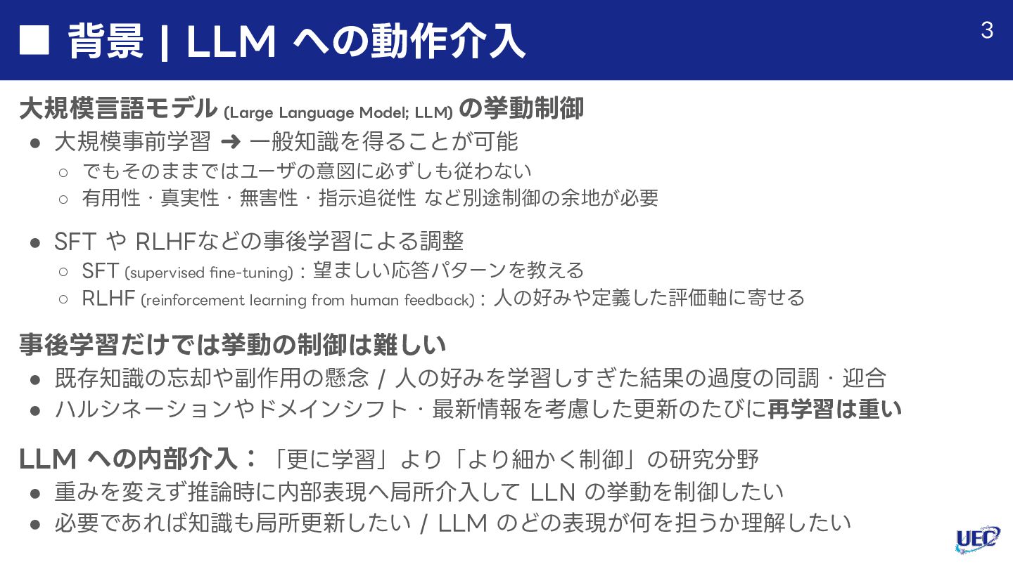 大規模言語モデル(LLM)に対する内部介入(steering / intervention)は、重み更新を伴わずに推論時の振る舞いを制御できる手法として、近年急速に注目を集めています。本発表では、この軽量かつ柔軟な制御パラダイムの可能性と限界について、言語処理学会 2026 における関連研究を体系的に整理しながら概観します。特に、北田+「ステアリングベクトルは日本語LLMを堅牢に制御できるか?」を中心に、評価・安全性・多言語制御・表現学習といった観点から、内部介入がどこまで信頼できる制御として機能するのかを議論します。