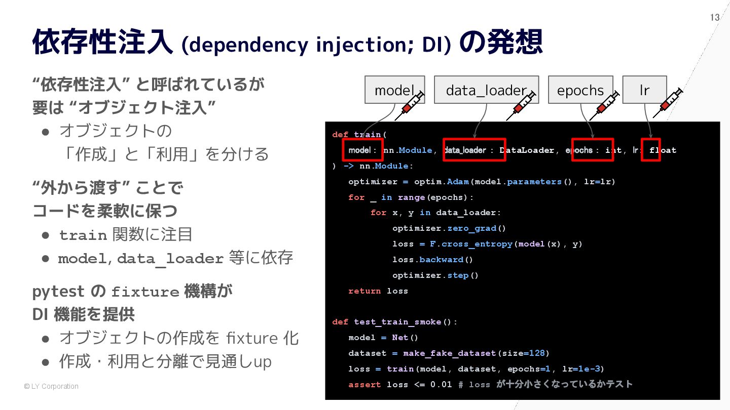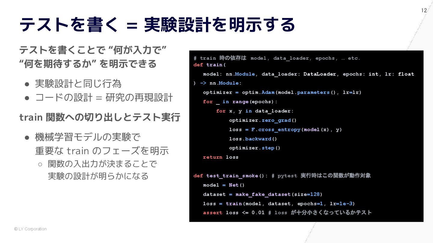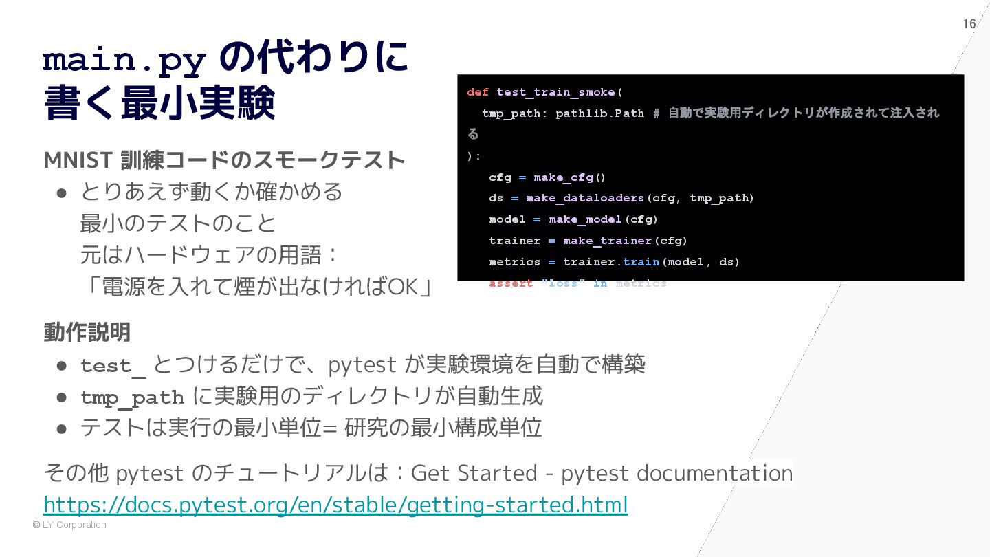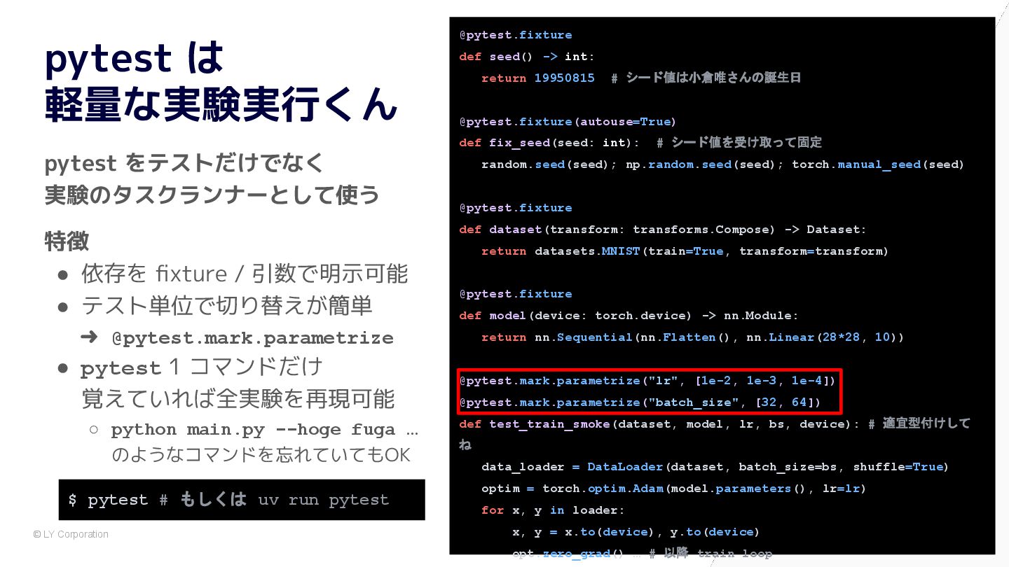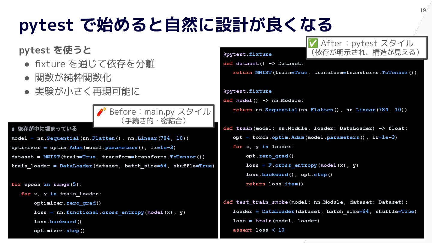 pytest で始めると自然に設計が良くなる # 依存が中に埋まっている model = nn.Sequential(nn.Flatten(), nn.Linear(784, 10)) optimizer = optim.Adam(model.parameters(), lr=1e-3) dataset = MNIST(train=True, transform=transforms.ToTensor()) train_loader = DataLoader(dataset, batch_size=64, shuffle=True) for epoch in range(5): for x, y in train_loader: optimizer.zero_grad() loss = nn.functional.cross_entropy(model(x), y) loss.backward() optimizer.step() @pytest.fixture def dataset() -> Dataset: return MNIST(train=True, transform=transforms.ToTensor()) @pytest.fixture def model() -> nn.Module: return nn.Sequential(nn.Flatten(), nn.Linear(784, 10)) def train(model: nn.Module, loader: DataLoader) -> float: opt = torch.optim.Adam(model.parameters(), lr=1e-3) for x, y in loader: opt.zero_grad() loss = F.cross_entropy(model(x), y) loss.backward(); opt.step() return loss.item() def test_train_smoke(model: nn.Module, dataset: Dataset): loader = DataLoader(dataset, batch_size=64, shuffle=True) loss = train(model, loader) assert loss < 10 ✅ After:pytest スタイル (依存が明示され、構造が見える) 🧨 Before:main.py スタイル (手続き的・密結合)