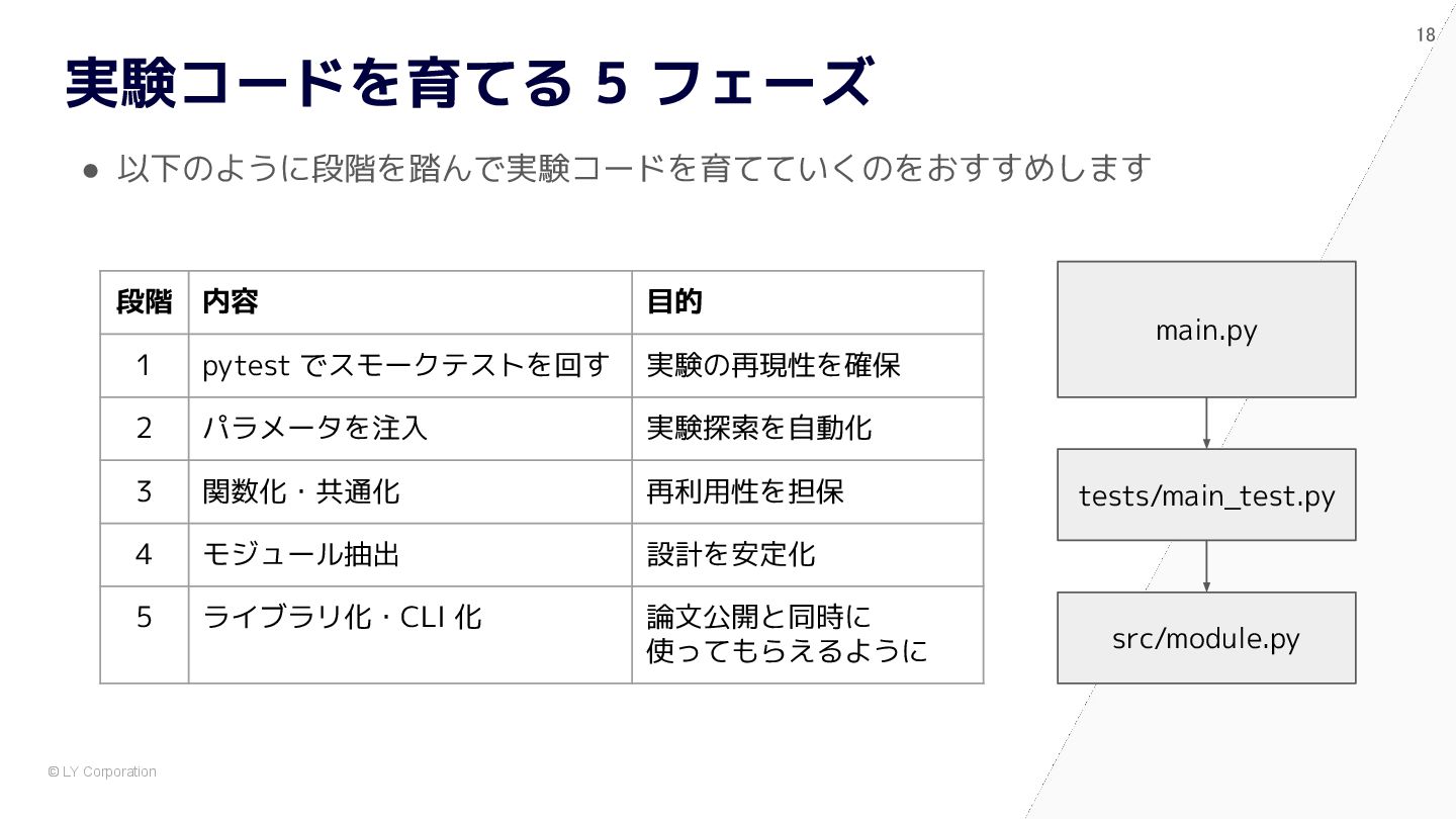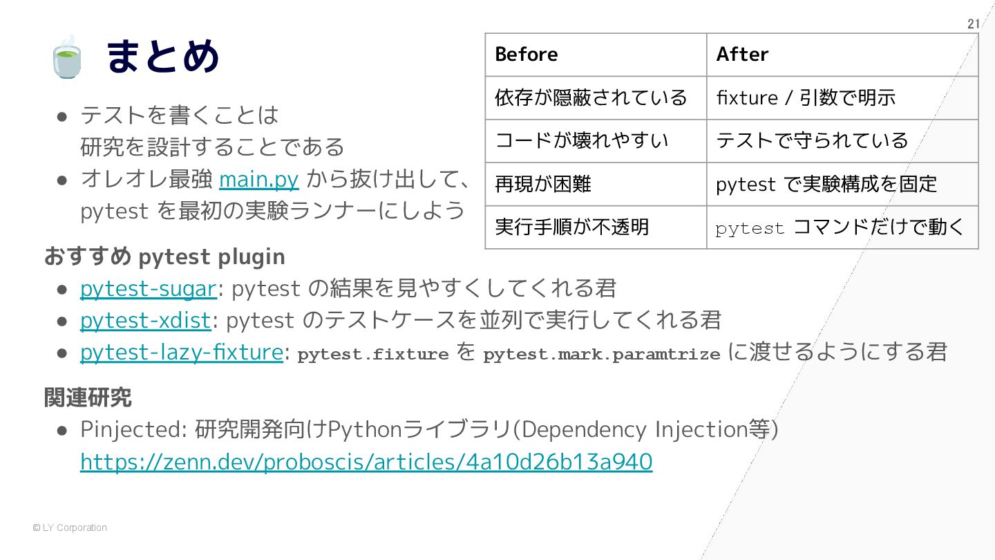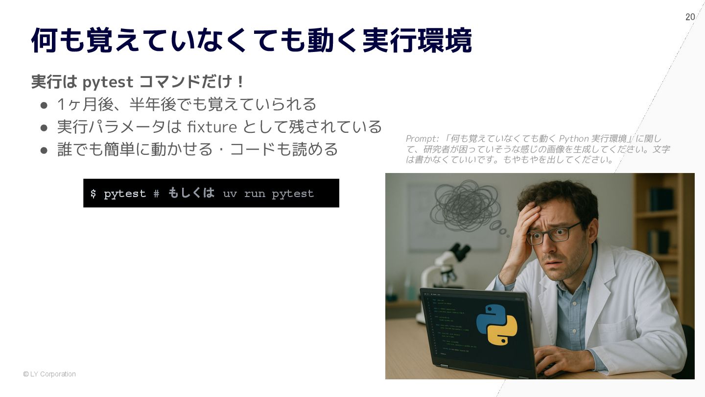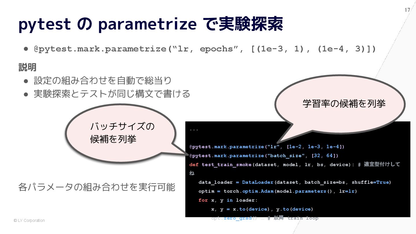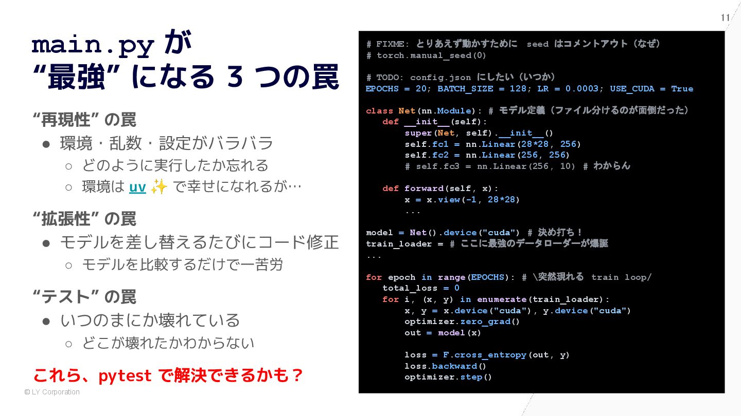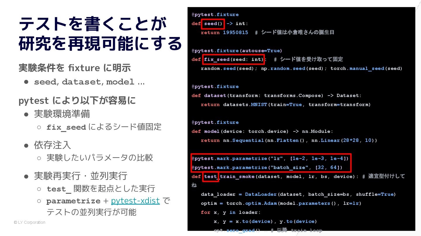 pytest で始めると自然に設計が良くなる # 依存が中に埋まっている model = nn.Sequential(nn.Flatten(), nn.Linear(784, 10)) optimizer = optim.Adam(model.parameters(), lr=1e-3) dataset = MNIST(train=True, transform=transforms.ToTensor()) train_loader = DataLoader(dataset, batch_size=64, shuffle=True) for epoch in range(5): for x, y in train_loader: optimizer.zero_grad() loss = nn.functional.cross_entropy(model(x), y) loss.backward() optimizer.step() @pytest.fixture def dataset() -> Dataset: return MNIST(train=True, transform=transforms.ToTensor()) @pytest.fixture def model() -> nn.Module: return nn.Sequential(nn.Flatten(), nn.Linear(784, 10)) def train(model: nn.Module, loader: DataLoader) -> float: opt = torch.optim.Adam(model.parameters(), lr=1e-3) for x, y in loader: opt.zero_grad() loss = F.cross_entropy(model(x), y) loss.backward(); opt.step() return loss.item() def test_train_smoke(model: nn.Module, dataset: Dataset): loader = DataLoader(dataset, batch_size=64, shuffle=True) loss = train(model, loader) assert loss < 10 ✅ After:pytest スタイル (依存が明示され、構造が見える) 🧨 Before:main.py スタイル (手続き的・密結合)