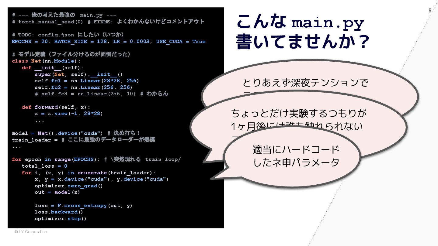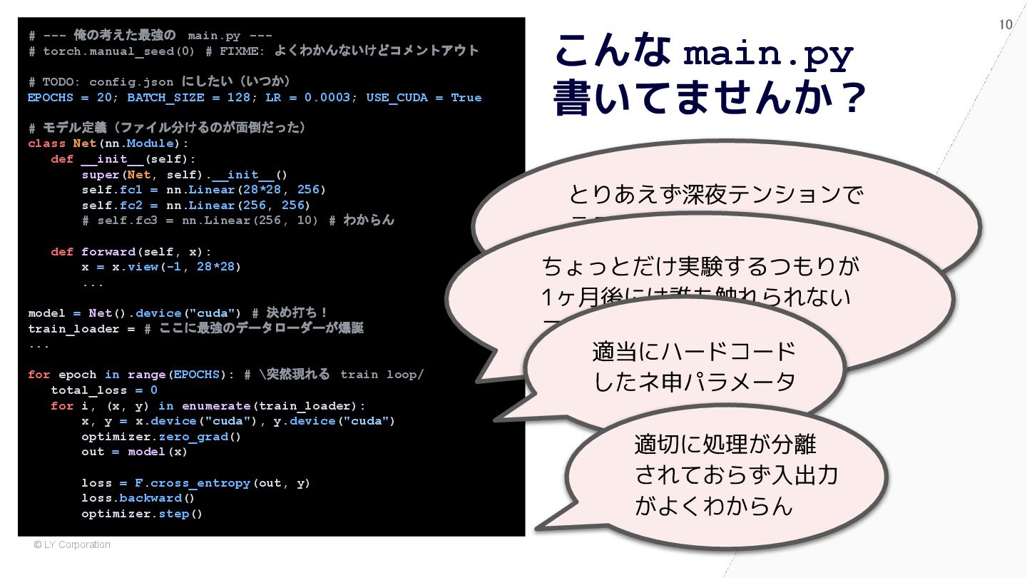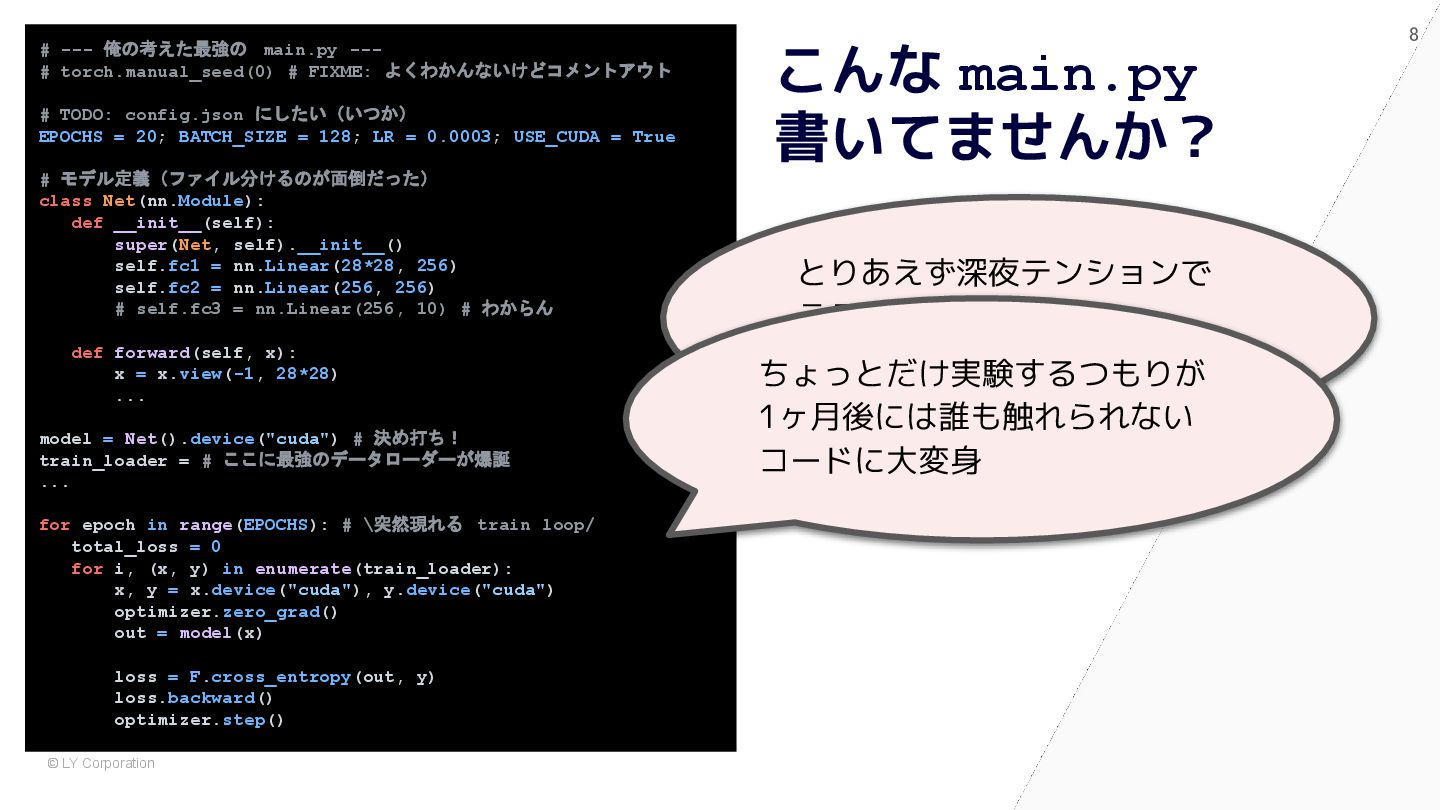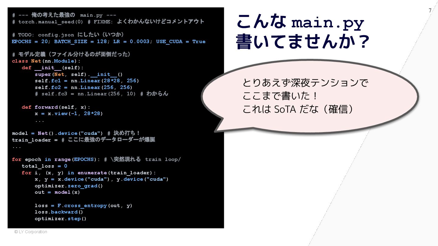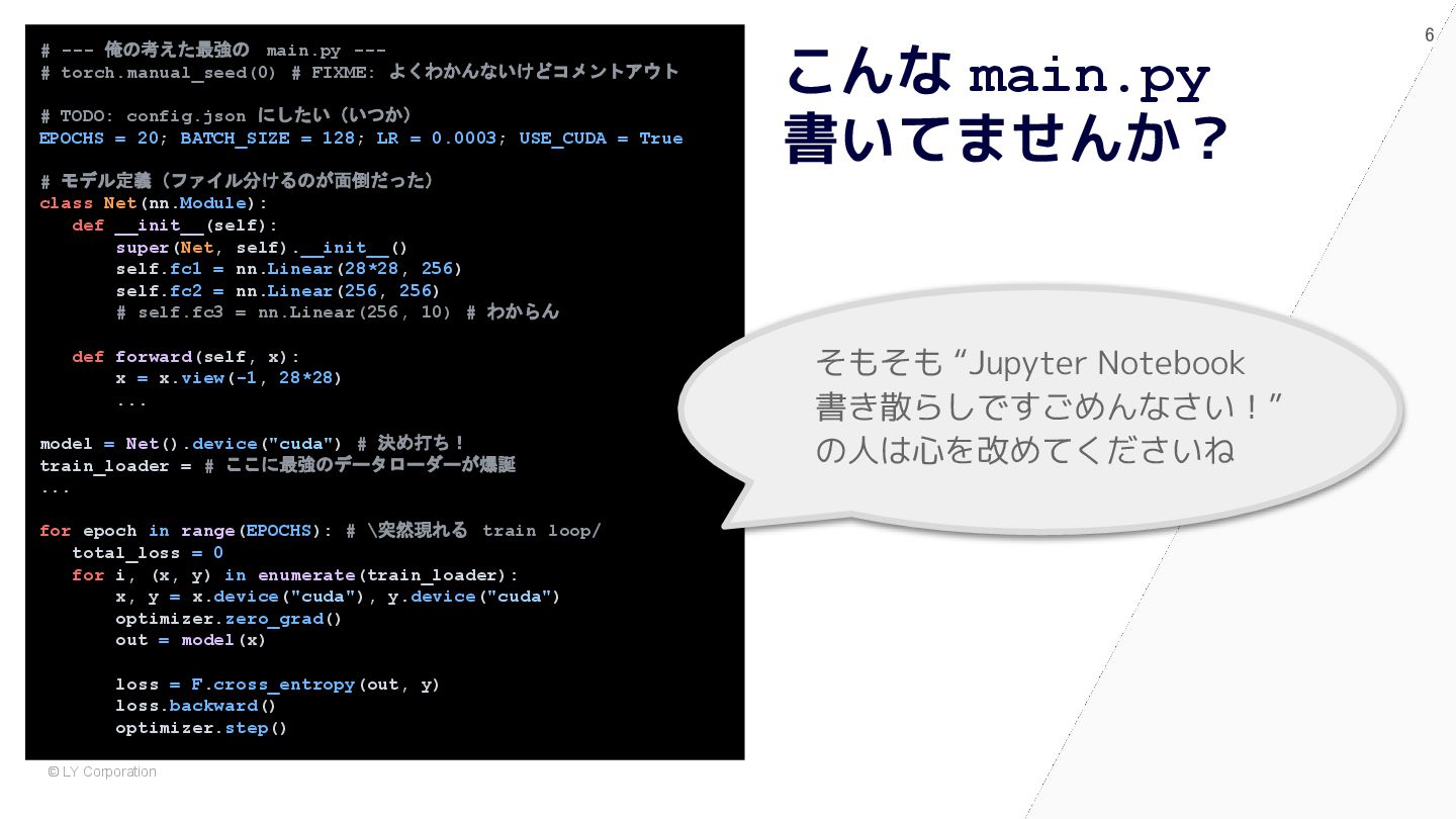 pytest で始めると自然に設計が良くなる # 依存が中に埋まっている model = nn.Sequential(nn.Flatten(), nn.Linear(784, 10)) optimizer = optim.Adam(model.parameters(), lr=1e-3) dataset = MNIST(train=True, transform=transforms.ToTensor()) train_loader = DataLoader(dataset, batch_size=64, shuffle=True) for epoch in range(5): for x, y in train_loader: optimizer.zero_grad() loss = nn.functional.cross_entropy(model(x), y) loss.backward() optimizer.step() @pytest.fixture def dataset() -> Dataset: return MNIST(train=True, transform=transforms.ToTensor()) @pytest.fixture def model() -> nn.Module: return nn.Sequential(nn.Flatten(), nn.Linear(784, 10)) def train(model: nn.Module, loader: DataLoader) -> float: opt = torch.optim.Adam(model.parameters(), lr=1e-3) for x, y in loader: opt.zero_grad() loss = F.cross_entropy(model(x), y) loss.backward(); opt.step() return loss.item() def test_train_smoke(model: nn.Module, dataset: Dataset): loader = DataLoader(dataset, batch_size=64, shuffle=True) loss = train(model, loader) assert loss < 10 ✅ After:pytest スタイル (依存が明示され、構造が見える) 🧨 Before:main.py スタイル (手続き的・密結合)