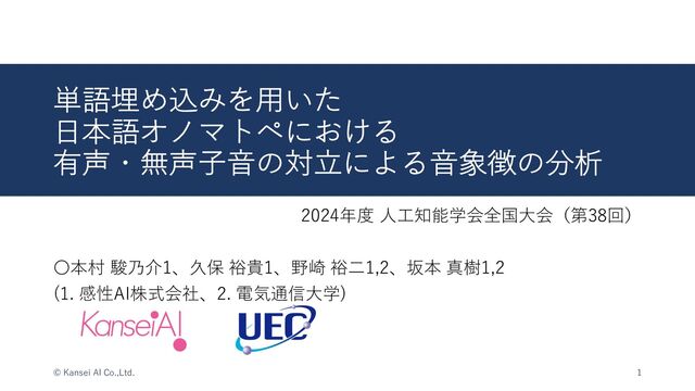 サクサク, キラキラ, … % = ザクザク, ギラギラ, … A = 軽い B = 重い ( サクサク, 軽い , 重い = )*+,-∈/ cos サクサク, 軽い − )*+,4∈5 cos(サクサク, 重い) ( ザクザク, 軽い , 重い = )*+,-∈/ cos ザクザク, 軽い − )*+,4∈5 cos(ザクザク, 重い) ⼤ ⼤ ⼩ ⼩ ⇒正の値 ⇒負の値 89:; !, %, :, < = = >∈? ((サクサク, 軽い , 重い ) − = @∈A ( ザクザク, 軽い , 重い ⇒正の値 89:; !, %, :, < = = >∈? ((B, :, <) − = @∈A ( C, :, < ( D, :, < = )*+,-∈/ cos D, ⃗ + − )*+,4∈5 cos(D, F) 無声オノマトペが軽い、有声オノマトペが重い場合、WEAT値は正の値