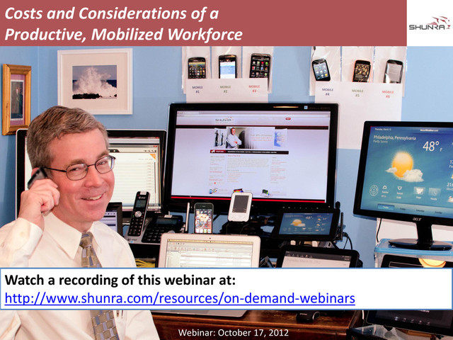 According to the iPass 2010 Mobile Workforce Report, employees with mobile devices work an extra 240 hours per year, or an extra SIX weeks. Mobile devices make it possible for workers to be connected anywhere and anytime, increasing the expectation for worker productivity. However, the benefits of this increased productivity could be offset by increased IT costs, security breaches and other mobile pitfalls such as poor app performance, service provider data limits and infrastructure capacity. Listen to this 30-minute interview with Dave Berg, Sr. Director of Product Management at Shunra, as he shares the lessons he’s learned about the costs and considerations that must be taken into account when mobilizing your workforce. This webinar is for anyone interested in learning about considerations for organizations mobilizing enterprise apps or devices to employees.