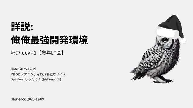 詳説: 俺俺最強開発環境 埼京.dev #1【忘年LT会】 Date: 2025-12-09 Place: ファインディ株式会社オフィス Speaker: しゅんそく