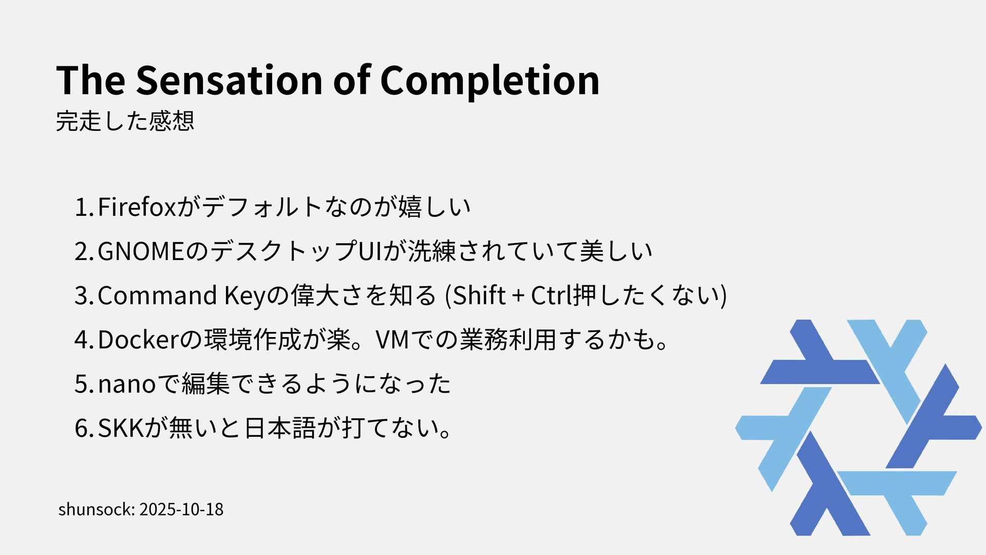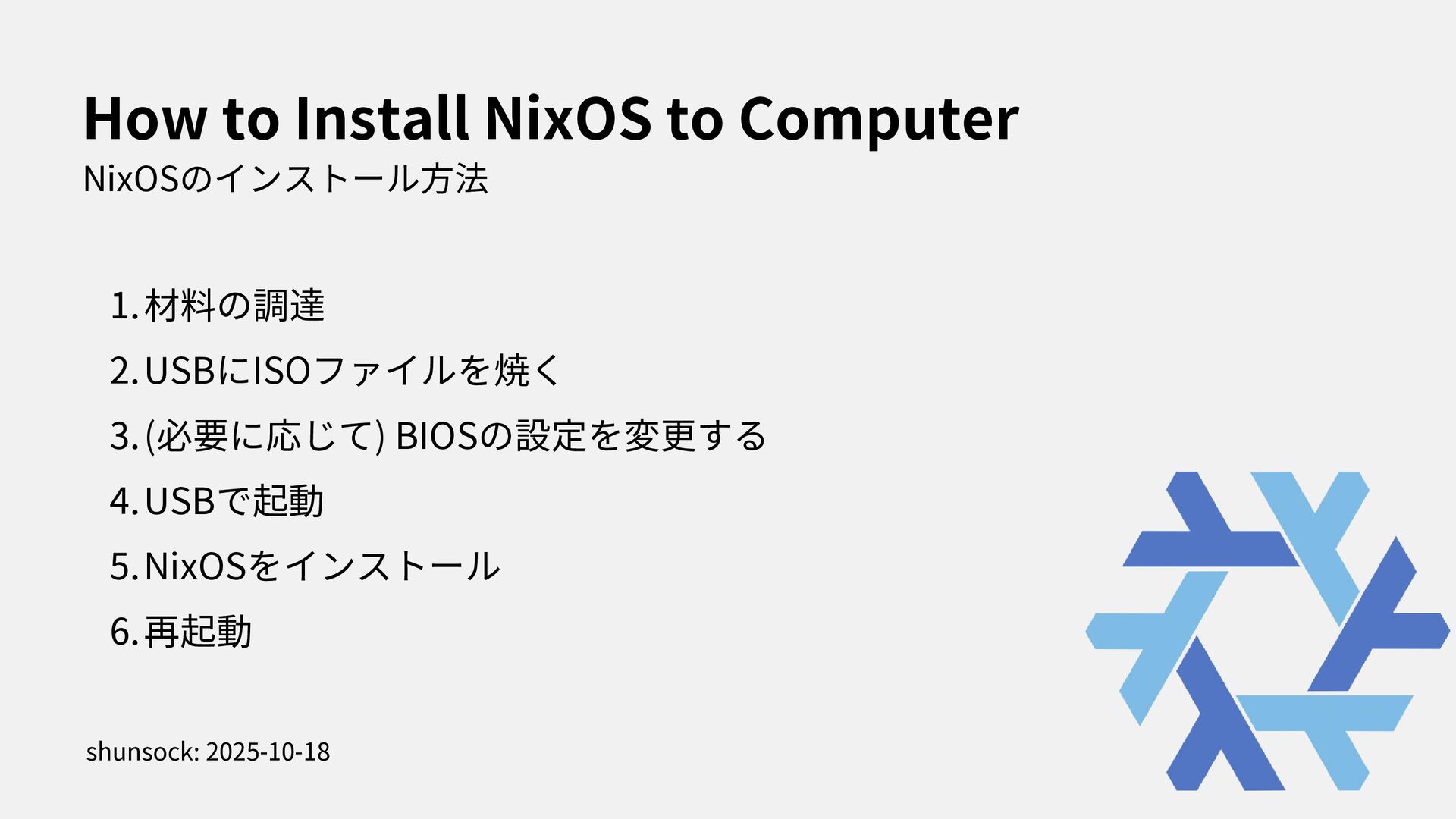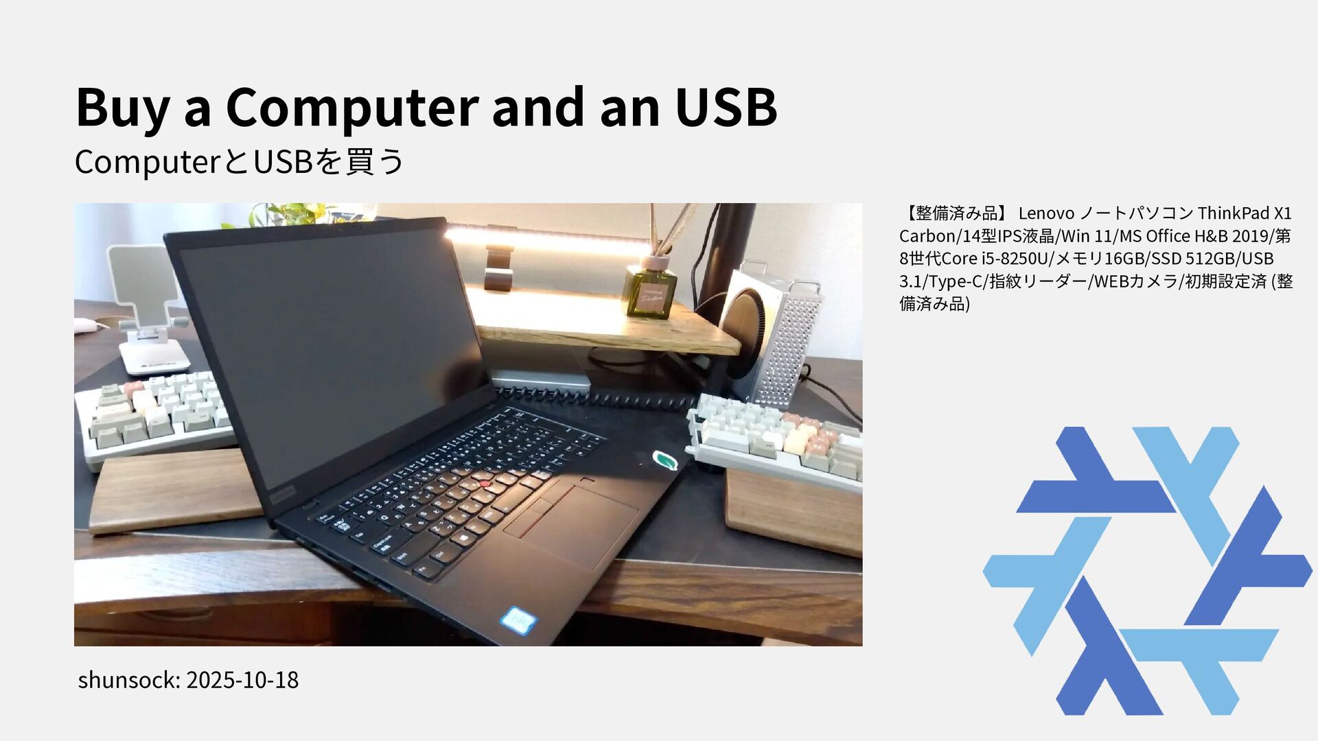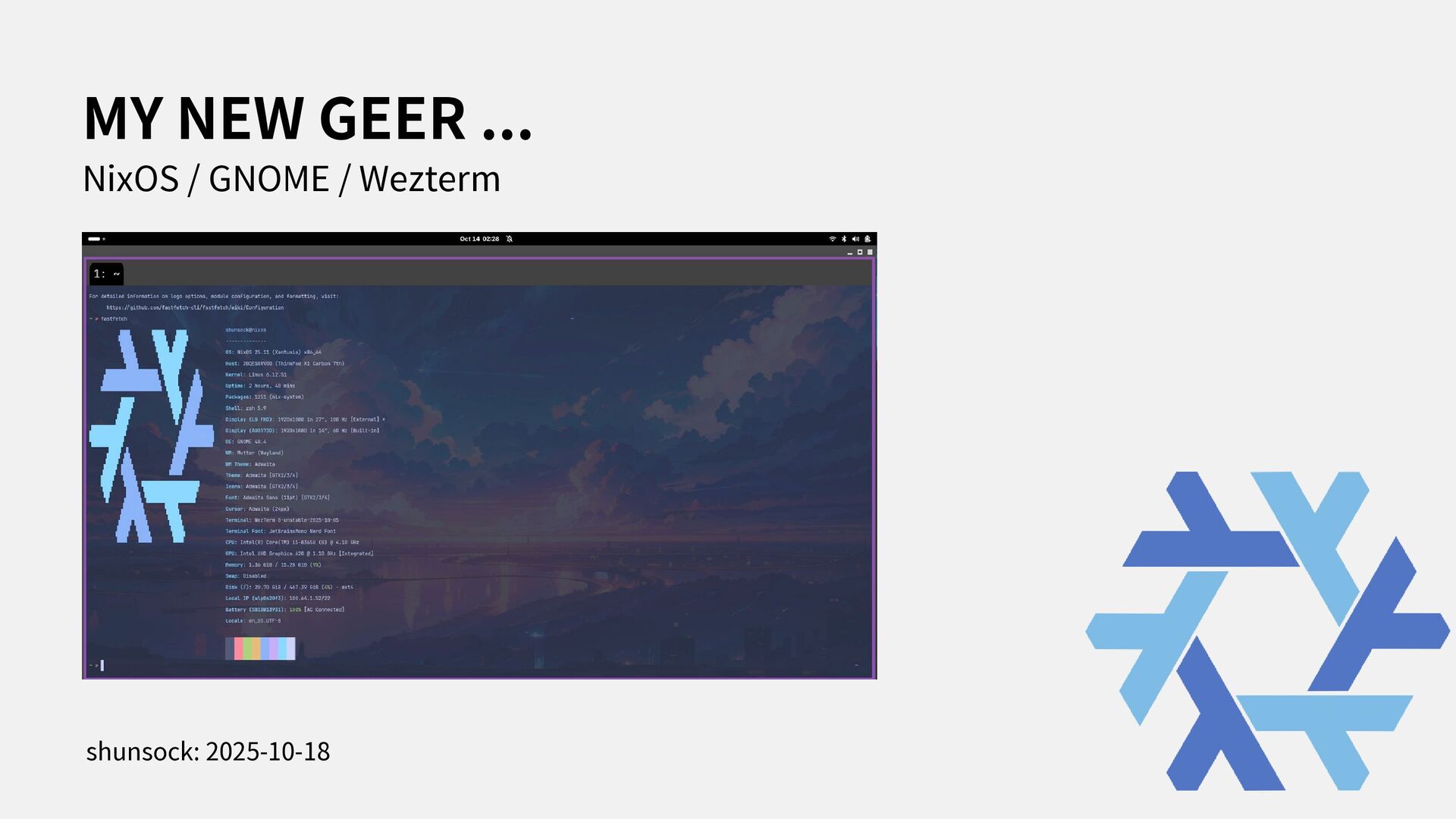 I stated to use NixOS with Thinkpad X1. In this presentation, i spoke about how to install NixOS to Thinkpad and my feeling through using my first Linux Laptop.