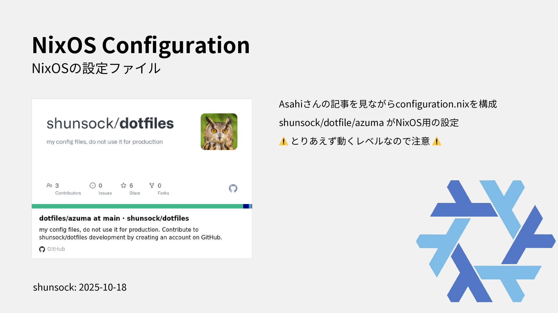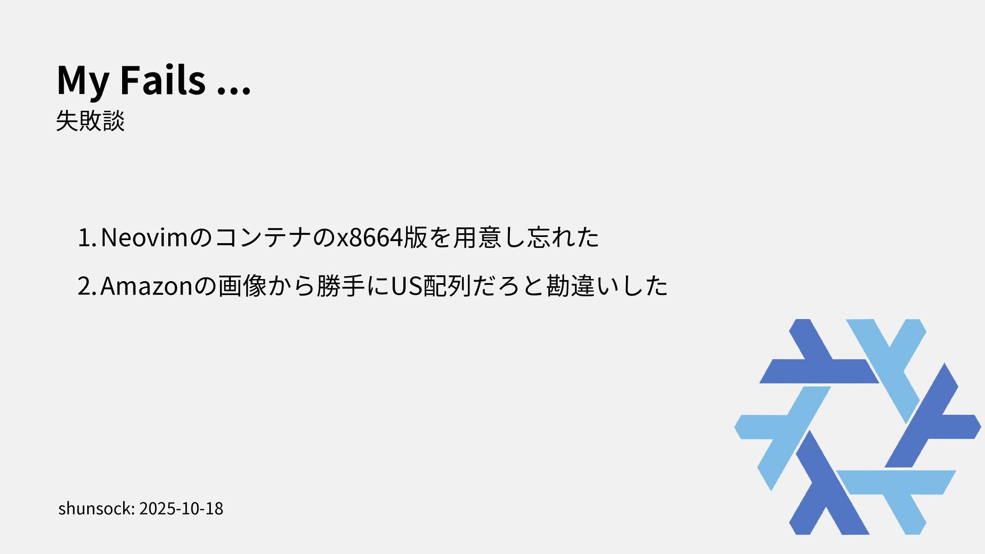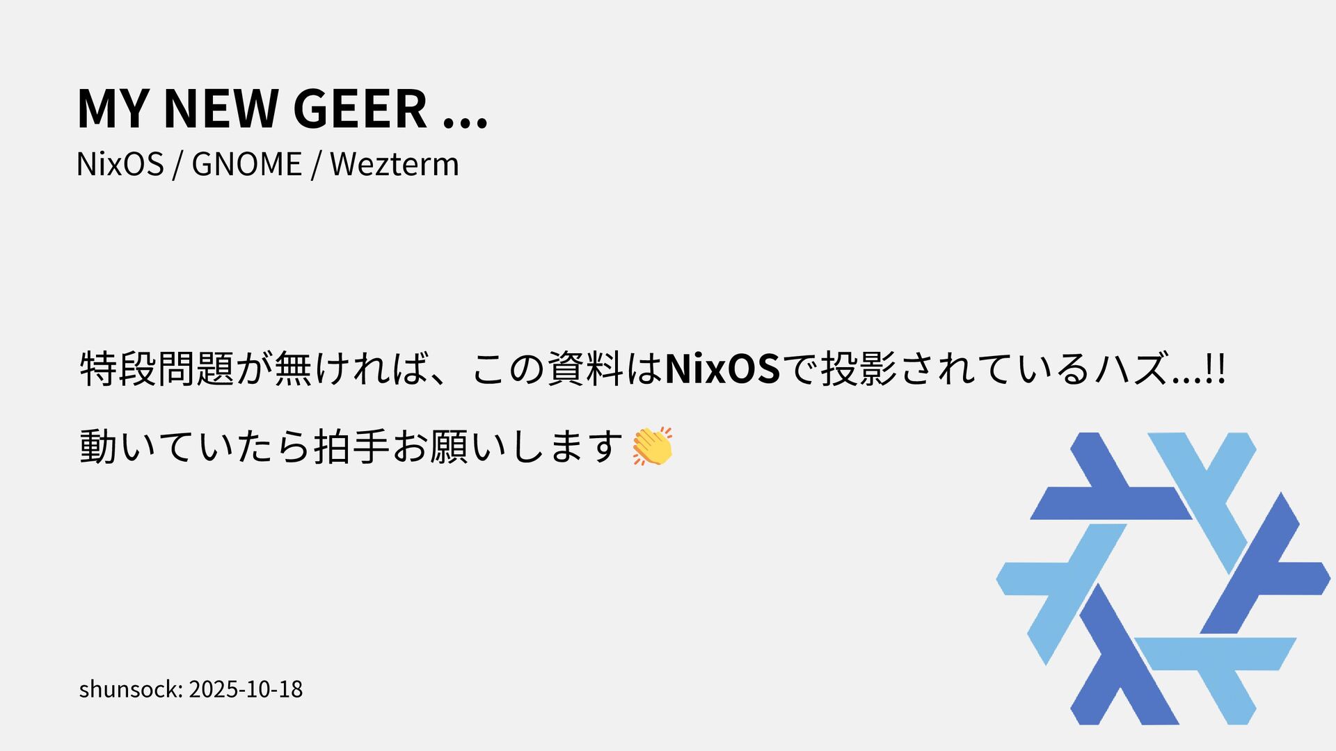 I stated to use NixOS with Thinkpad X1. In this presentation, i spoke about how to install NixOS to Thinkpad and my feeling through using my first Linux Laptop.