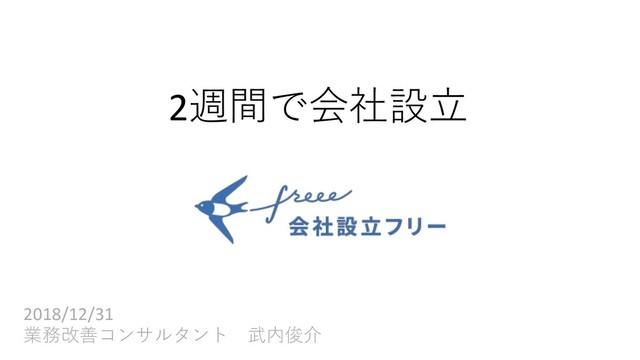 会社設立freeeを使って2週間で会社設立の登記まで完了させました。 昔よりも簡単になったとはいえ、まだまだ煩雑でアナログな手続きの残る会社設立。必要な書類や費用、各手続きにかかる期間などを整理して共有します。 実際にやってみると、会社設立freeeのおかげもあり、面倒ではありますが、そんなに大変ではありませんでした。何よりも、完成した書類がダウンロードでし、そこに判子を押すだけなのはすごく楽です。会社設立はそんなにハードルが高くない、ということがこのスライドで伝われば幸いです。