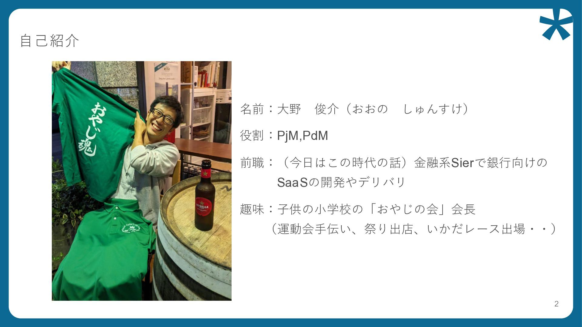 2 自己紹介 名前:大野 俊介(おおの しゅんすけ) 役割:PjM,PdM 前職:(今日はこの時代の話)金融系Sierで銀行向けの SaaSの開発やデリバリ 趣味:子供の小学校の「おやじの会」会長 (運動会手伝い、祭り出店、いかだレース出場・・)