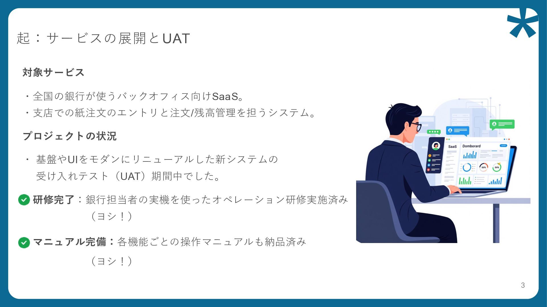 3 起:サービスの展開とUAT 対象サービス ・全国の銀行が使うバックオフィス向けSaaS。 ・支店での紙注文のエントリと注文/残高管理を担うシステム。 プロジェクトの状況 ・ 基盤やUIをモダンにリニューアルした新システムの 受け入れテスト(UAT)期間中でした。 研修完了:銀行担当者の実機を使ったオペレーション研修実施済み
