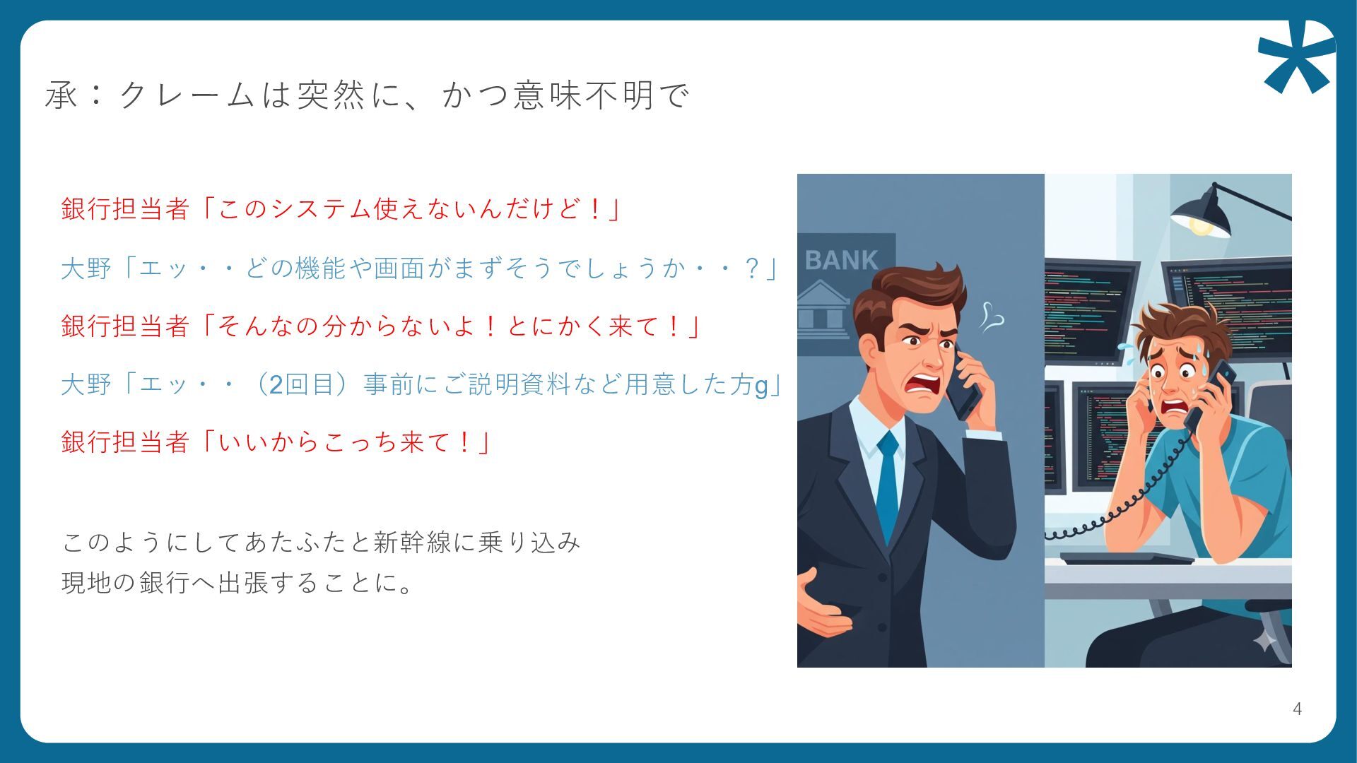4 承:クレームは突然に、かつ意味不明で 銀行担当者「このシステム使えないんだけど!」 大野「エッ・・どの機能や画面がまずそうでしょうか・・?」 銀行担当者「そんなの分からないよ!とにかく来て!」 大野「エッ・・(2回目)事前にご説明資料など用意した方g」 銀行担当者「いいからこっち来て!」 このようにしてあたふたと新幹線に乗り込み 現地の銀行へ出張することに。