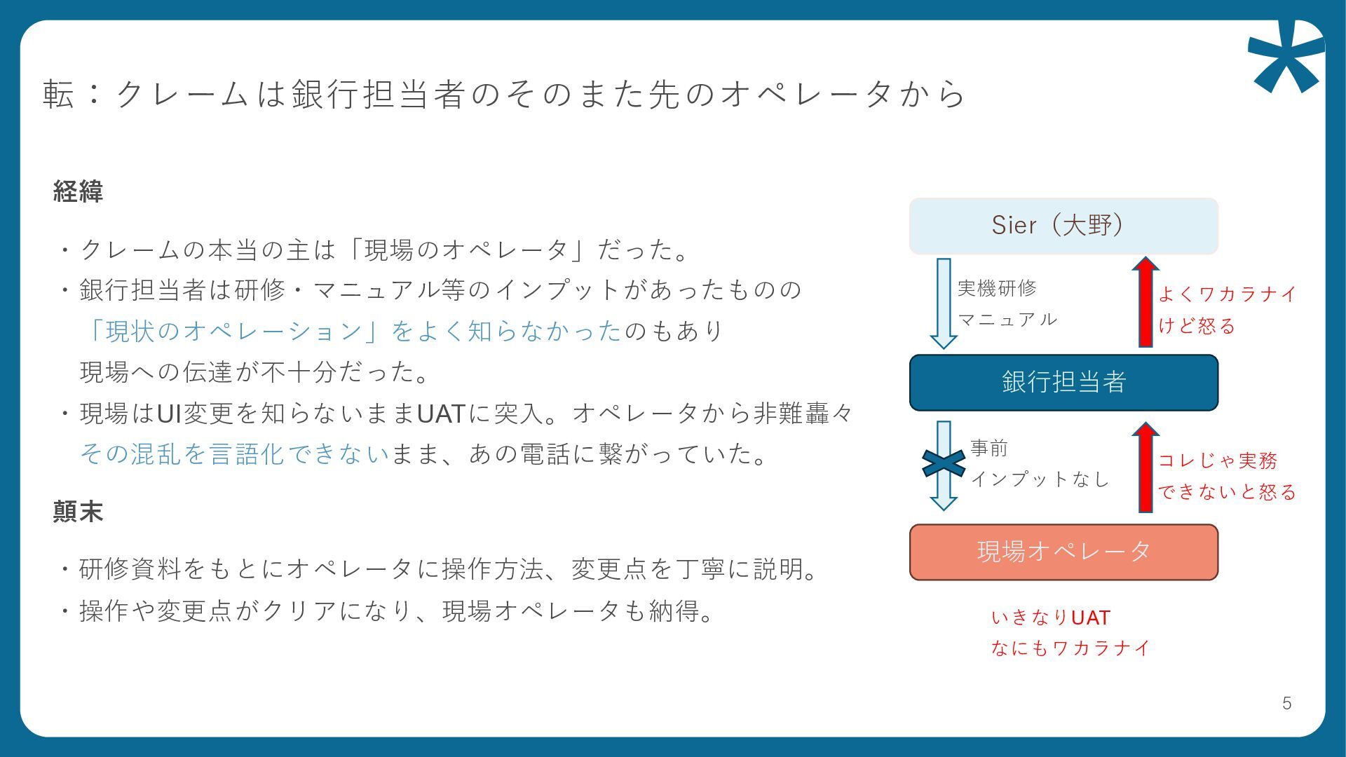 5 転:クレームは銀行担当者のそのまた先のオペレータから 経緯 ・クレームの本当の主は「現場のオペレータ」だった。 ・銀行担当者は研修・マニュアル等のインプットがあったものの 「現状のオペレーション」をよく知らなかったのもあり 現場への伝達が不十分だった。 ・現場はUI変更を知らないままUATに突入。オペレータから非難轟々 その混乱を言語化できないまま、あの電話に繋がっていた。 顛末