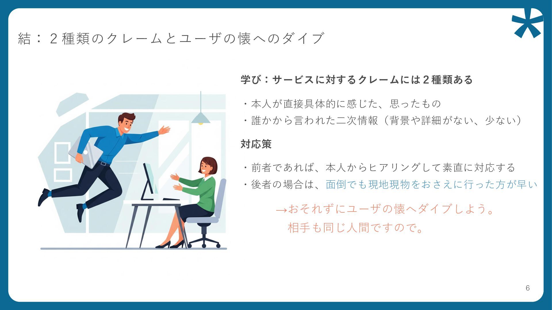6 結:2種類のクレームとユーザの懐へのダイブ 学び:サービスに対するクレームには2種類ある ・本人が直接具体的に感じた、思ったもの ・誰かから言われた二次情報(背景や詳細がない、少ない) 対応策 ・前者であれば、本人からヒアリングして素直に対応する ・後者の場合は、面倒でも現地現物をおさえに行った方が早い →おそれずにユーザの懐へダイブしよう。 相手も同じ人間ですので。