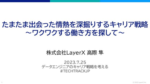 © 2023 LayerX Inc. 1 たまたま出会った情熱を深掘りするキャリア戦略 〜ワクワクする働き方を探して〜 株式会社LayerX 高際 隼