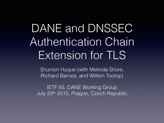 related DNS queries itself: • avoids associated latency penalty. • works around middleboxes that might interfere with attempted DANE/DNSSEC queries. • TLS client can authenticate the record itself without needing access to a validating resolver to which it has a secure connection.