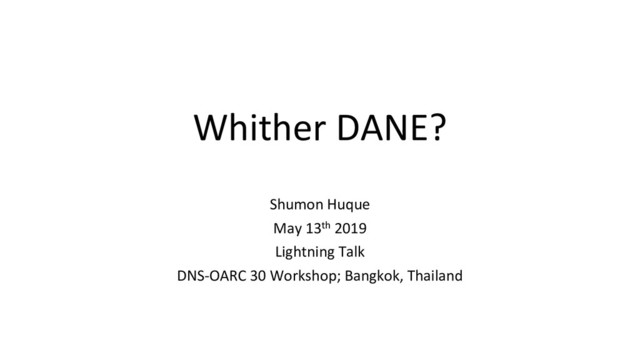 What's going on with DANE? Will it really happen? Status of protocol specifications. Where DANE has had some success. The sad saga of DANE prospects for web applications.