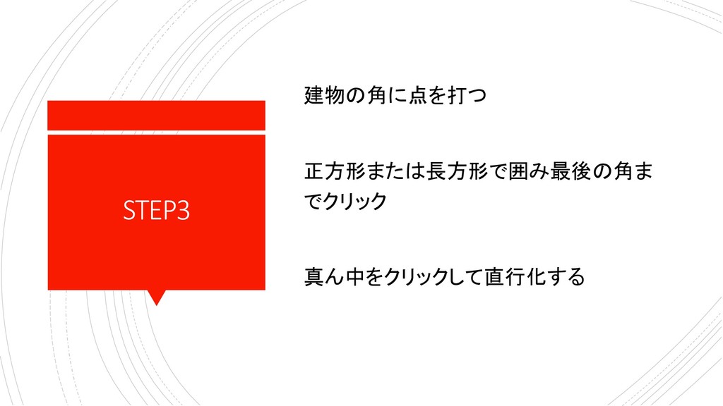 STEP3 建物の角に点を打つ 正方形または長方形で囲み最後の角ま でクリック 真ん中をクリックして直行化する