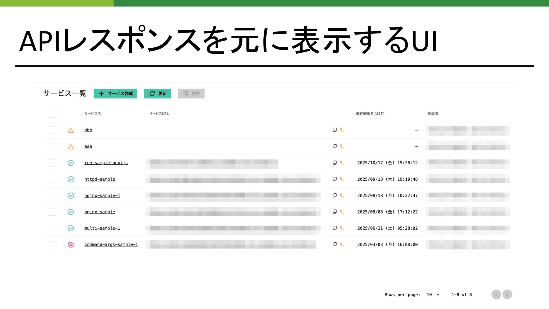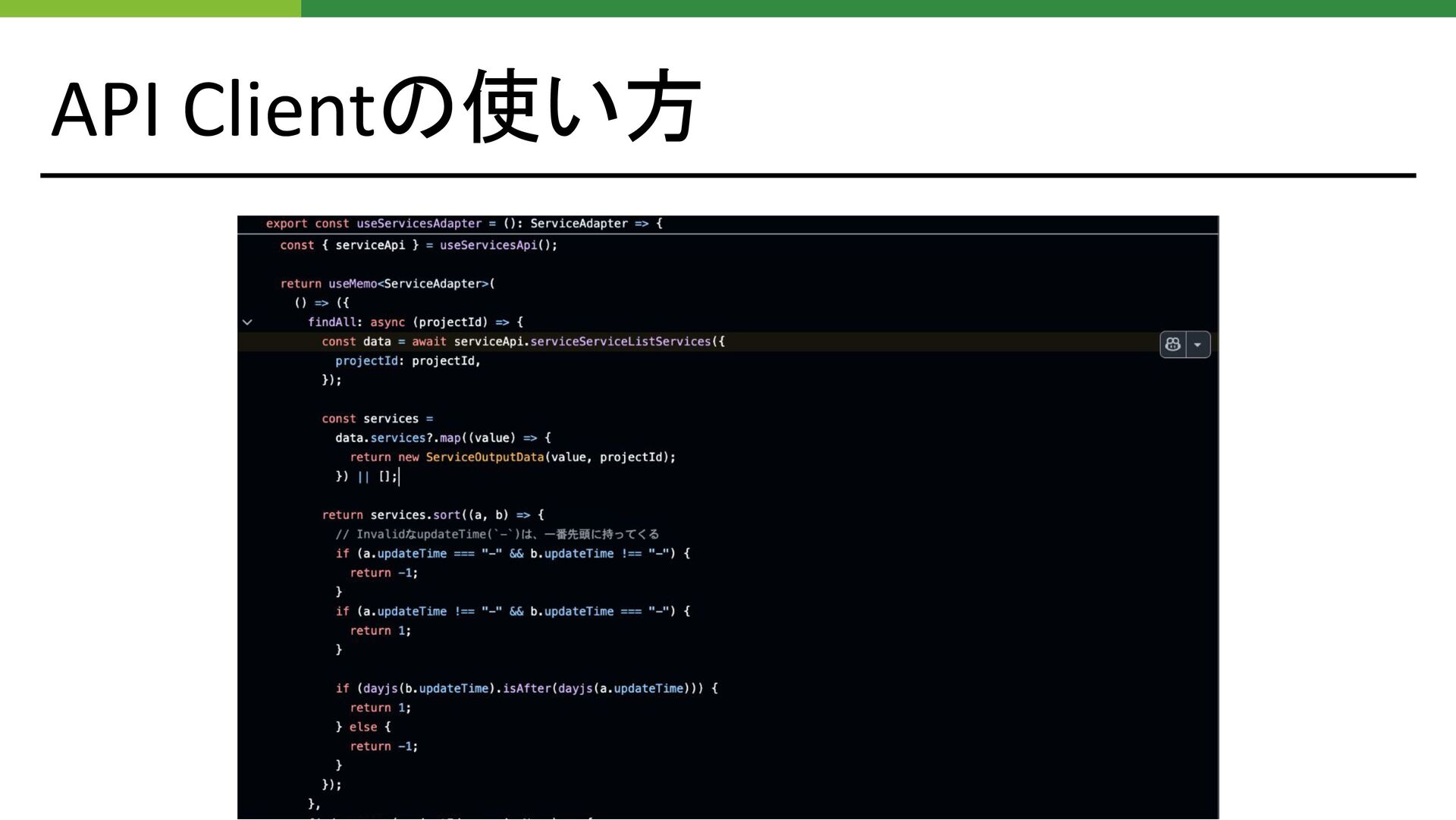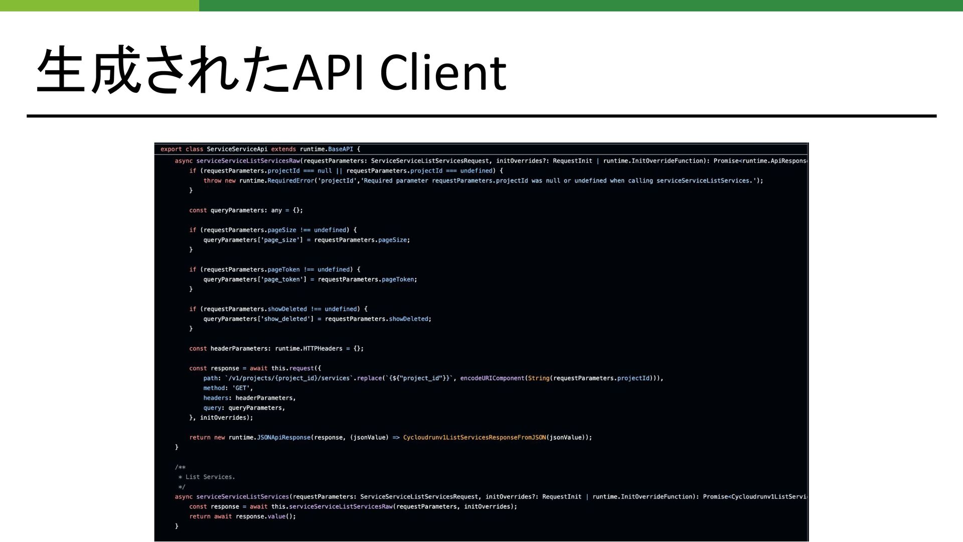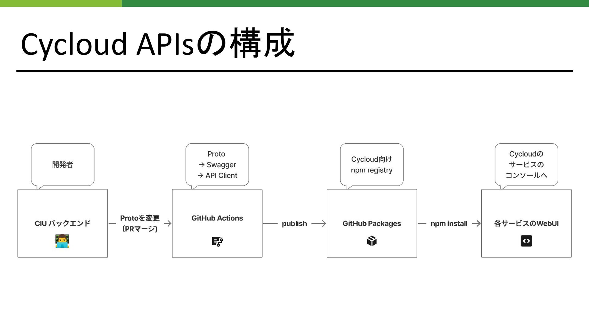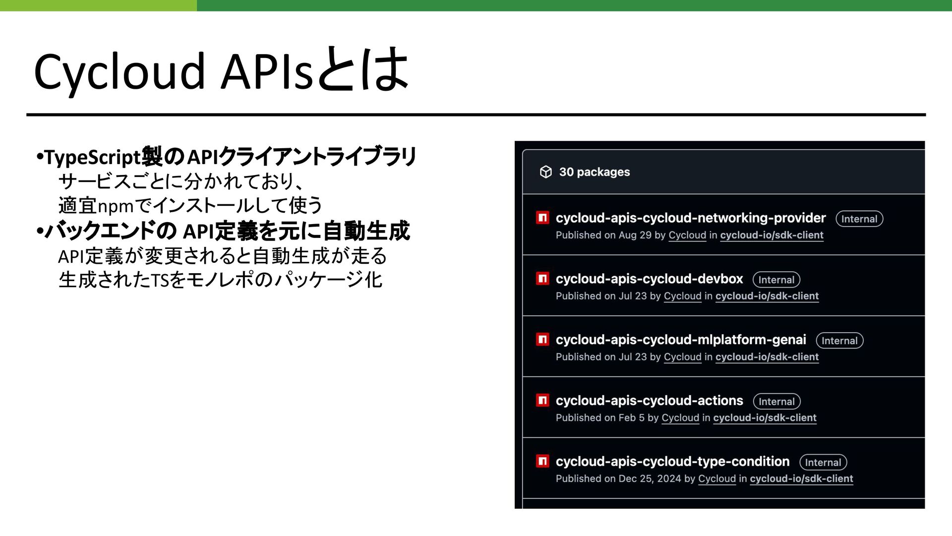 Cycloud APIsとは •TypeScript製のAPIクライアントライブラリ サービスごとに分かれており、 適宜npmでインストールして使う •バックエンドの API定義を元に自動生成 API定義が変更されると自動生成が走る 生成されたTSをモノレポのパッケージ化