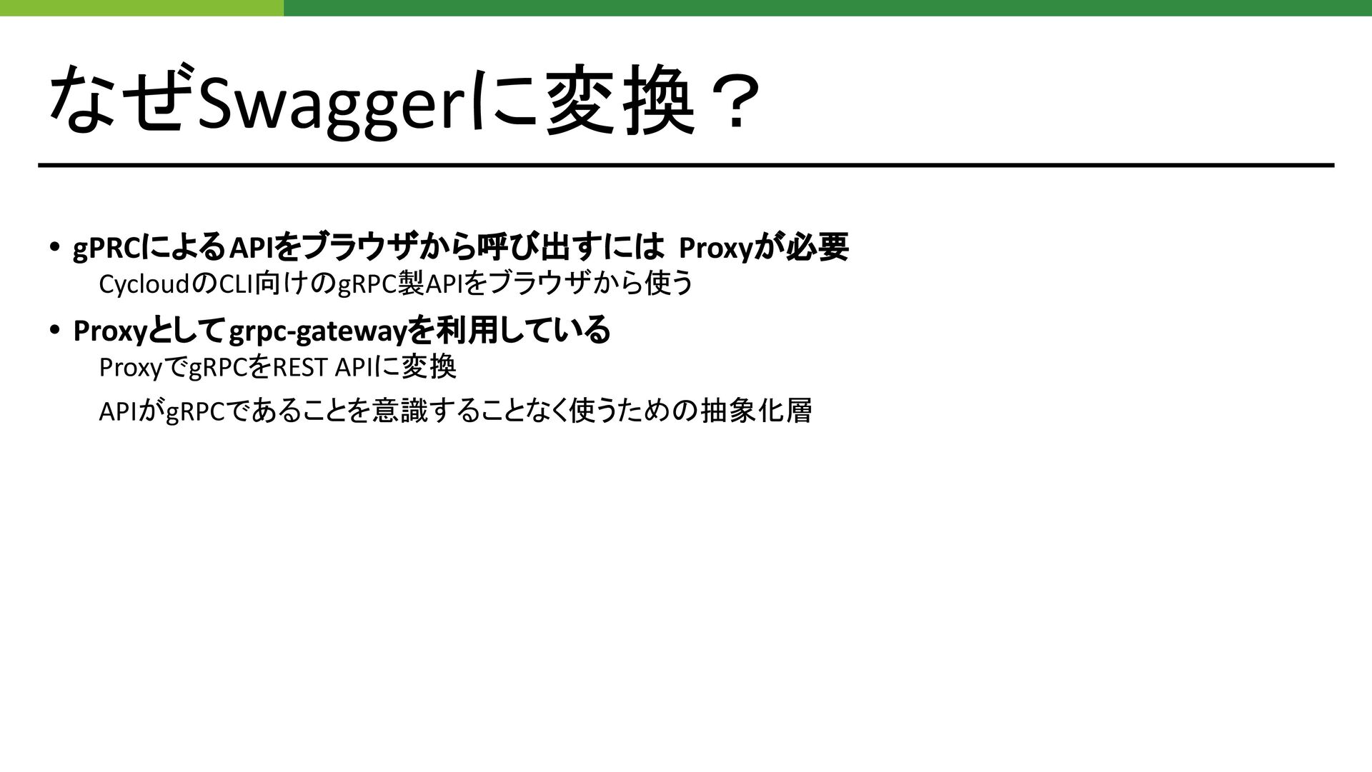 なぜSwaggerに変換? • gPRCによるAPIをブラウザから呼び出すには Proxyが必要 CycloudのCLI向けのgRPC製APIをブラウザから使う • Proxyとしてgrpc-gatewayを利用している ProxyでgRPCをREST APIに変換 APIがgRPCであることを意識することなく使うための抽象化層