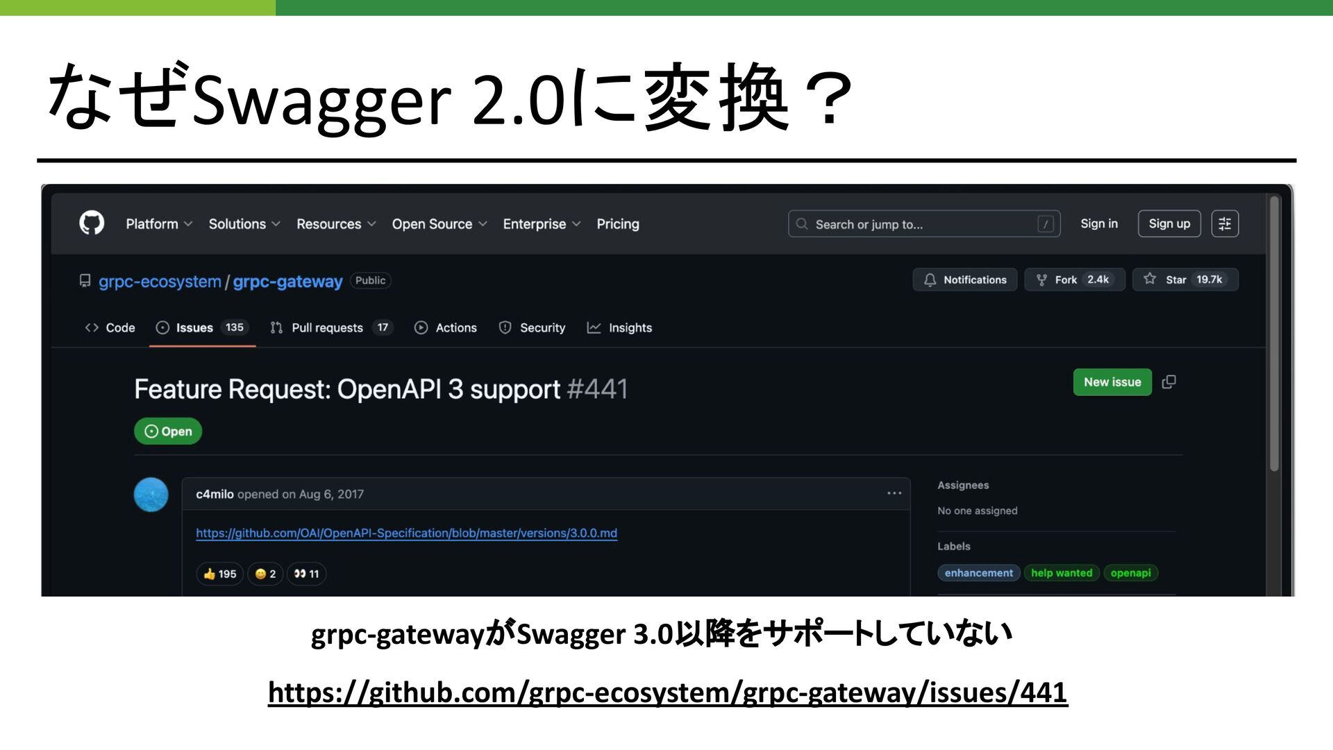 なぜSwagger 2.0に変換? grpc-gatewayがSwagger 3.0以降をサポートしていない https://github.com/grpc-ecosystem/grpc-gateway/issues/441