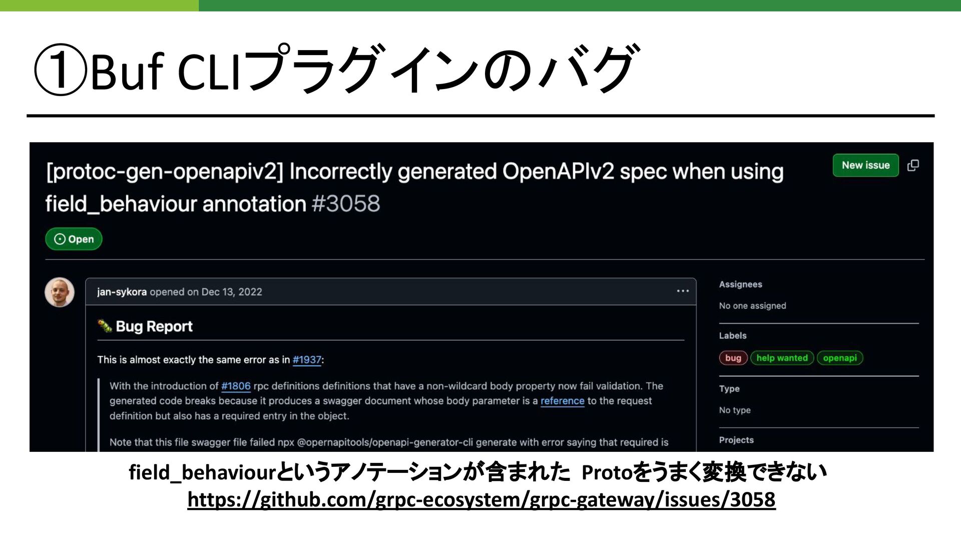 ①Buf CLIプラグインのバグ field_behaviourというアノテーションが含まれた Protoをうまく変換できない https://github.com/grpc-ecosystem/grpc-gateway/issues/3058