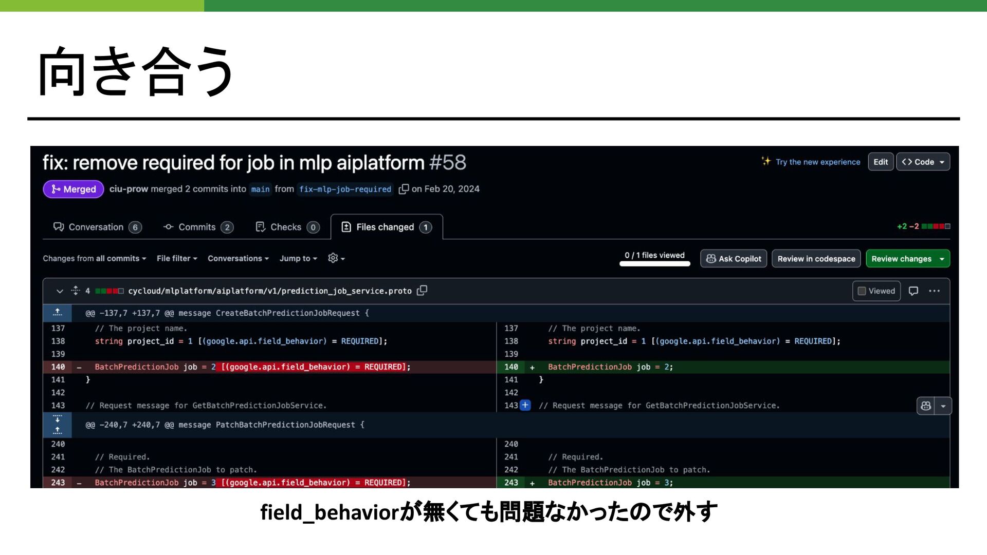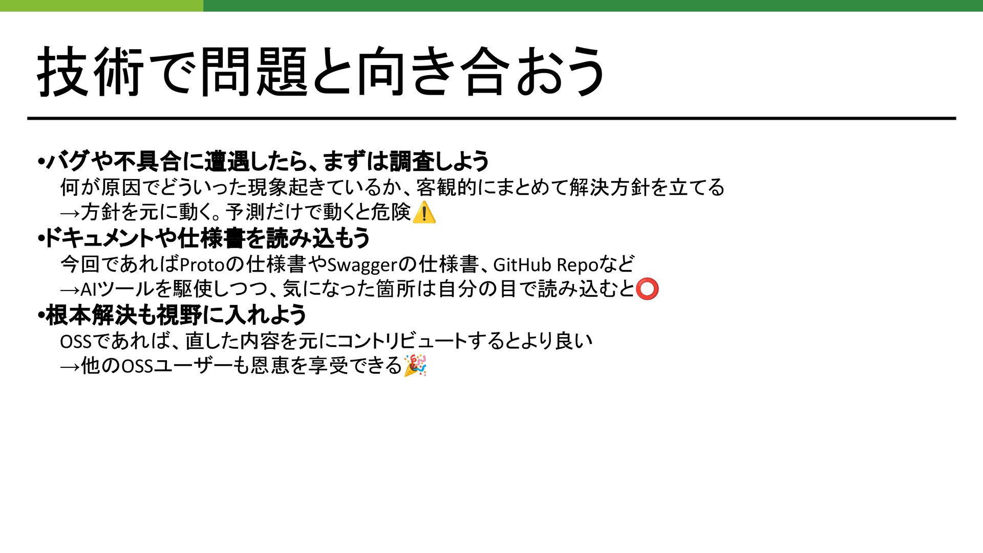 技術で問題と向き合おう •バグや不具合に遭遇したら、まずは調査しよう 何が原因でどういった現象起きているか、客観的にまとめて解決方針を立てる →方針を元に動く。予測だけで動くと危険⚠ •ドキュメントや仕様書を読み込もう 今回であればProtoの仕様書やSwaggerの仕様書、GitHub Repoなど →AIツールを駆使しつつ、気になった箇所は自分の目で読み込むと⭕ •根本解決も視野に入れよう OSSであれば、直した内容を元にコントリビュートするとより良い
