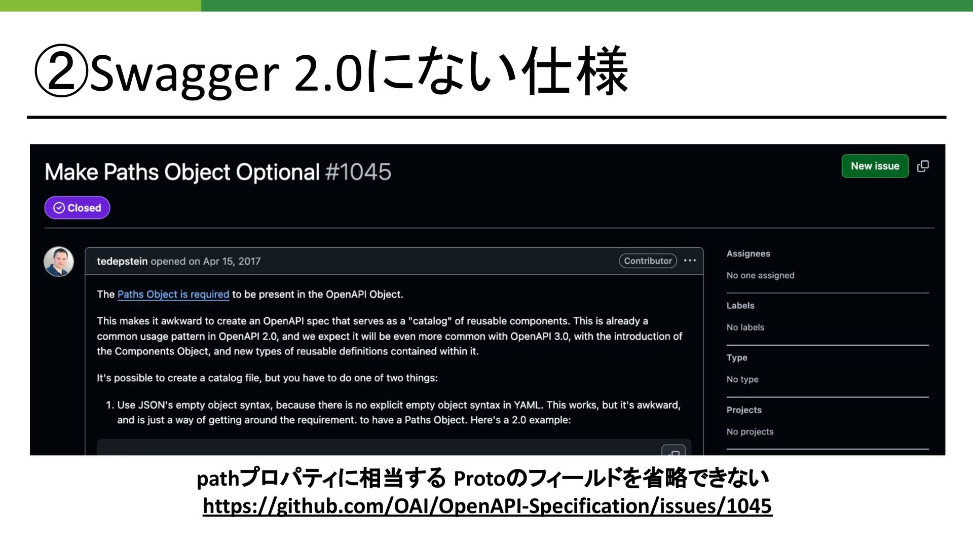 ②Swagger 2.0にない仕様 pathプロパティに相当する Protoのフィールドを省略できない https://github.com/OAI/OpenAPI-Specification/issues/1045
