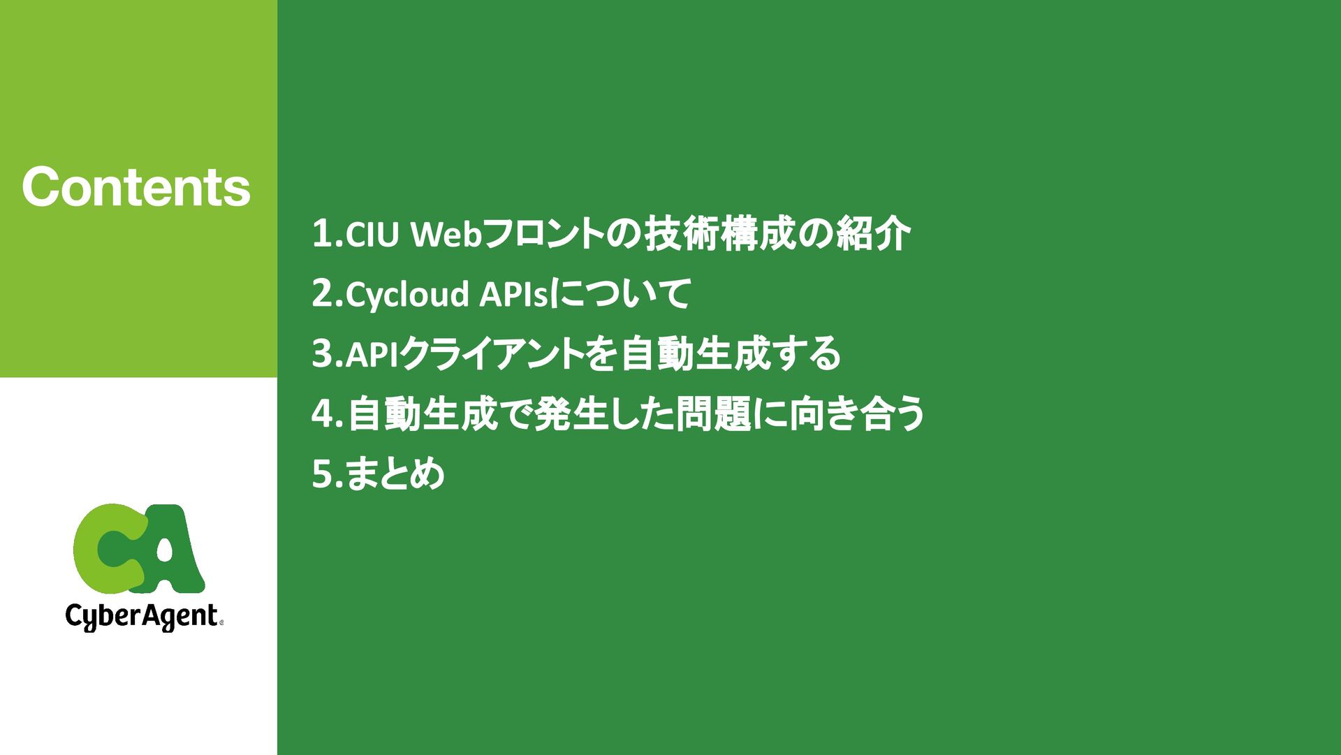 1.CIU Webフロントの技術構成の紹介 2.Cycloud APIsについて 3.APIクライアントを自動生成する 4.自動生成で発生した問題に向き合う 5.まとめ
