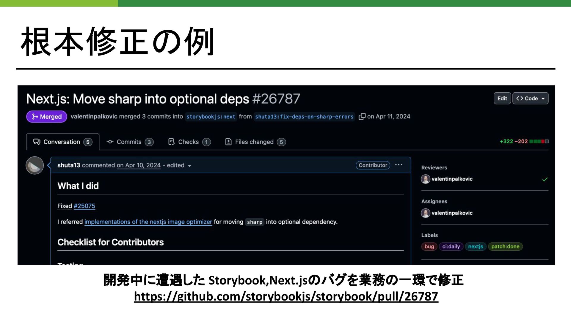 根本修正の例 開発中に遭遇した Storybook,Next.jsのバグを業務の一環で修正 https://github.com/storybookjs/storybook/pull/26787
