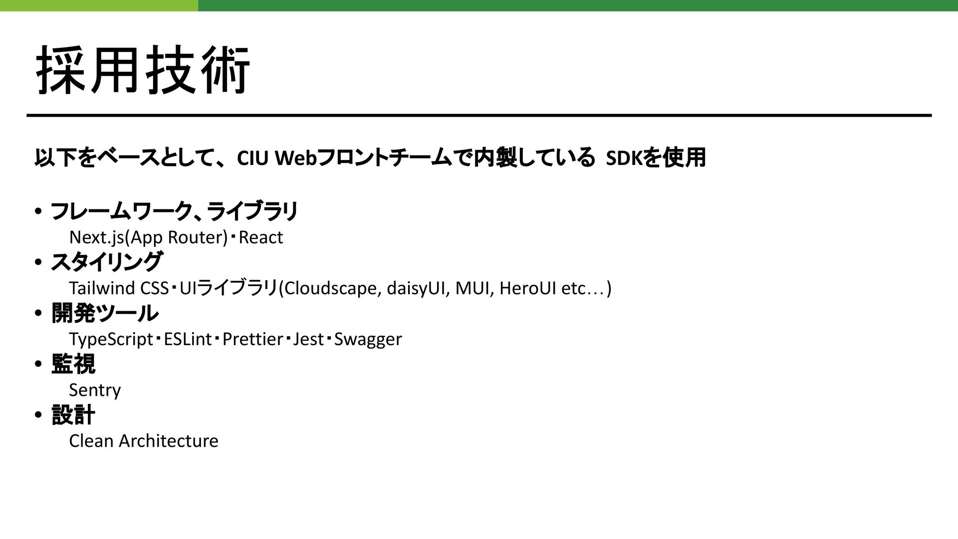 採用技術 以下をベースとして、 CIU Webフロントチームで内製している SDKを使用 • フレームワーク、ライブラリ Next.js(App Router)・React •