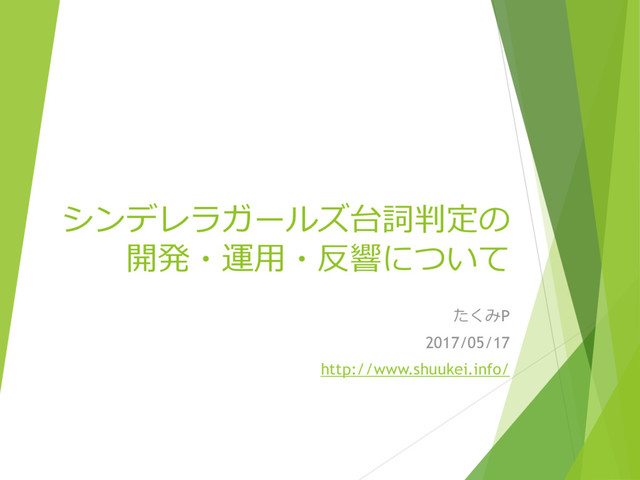 シンデレラガールズ台詞判定の 開発・運用・反響について たくみP 2017/05/17 http://www.shuukei.info/