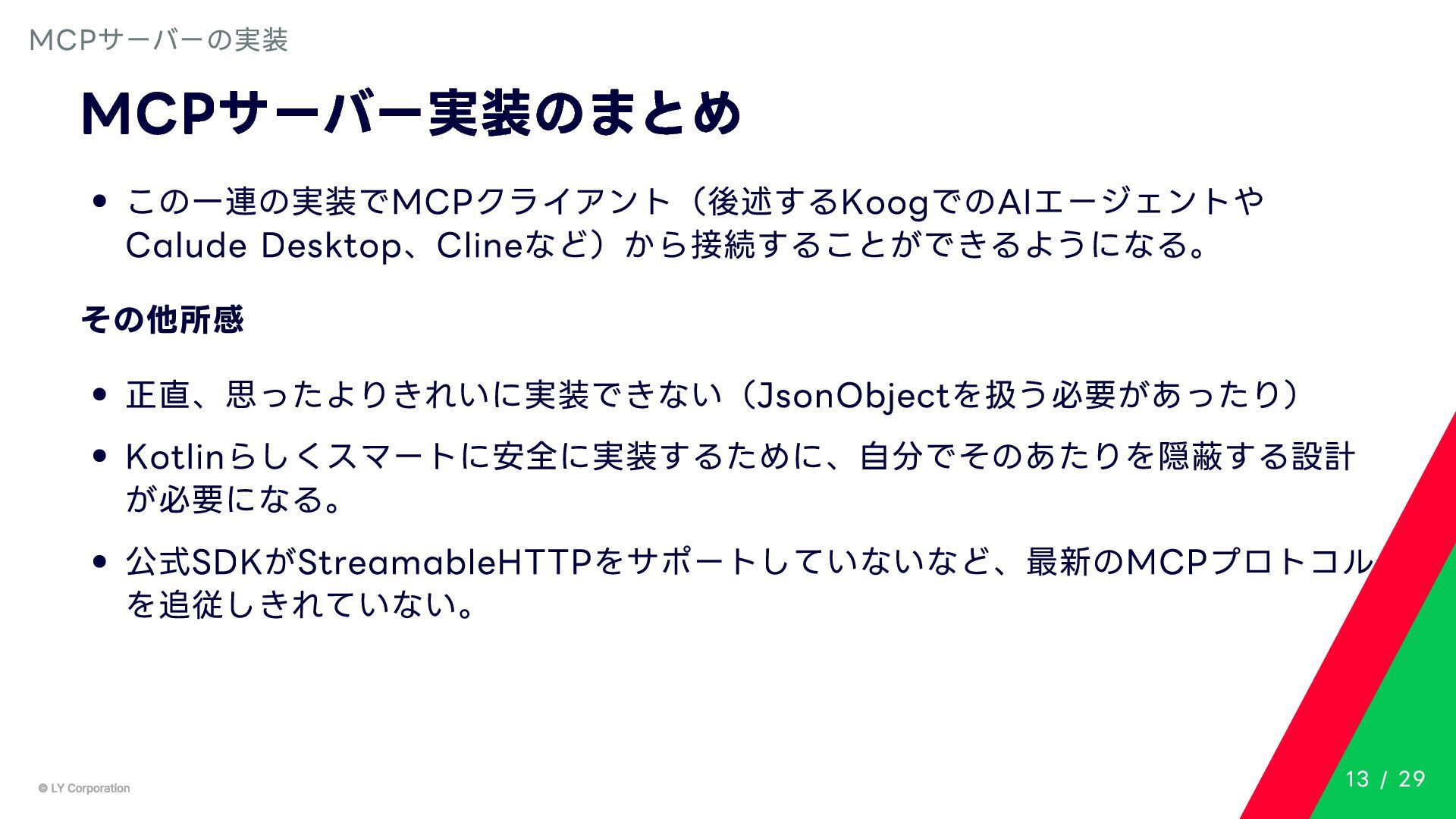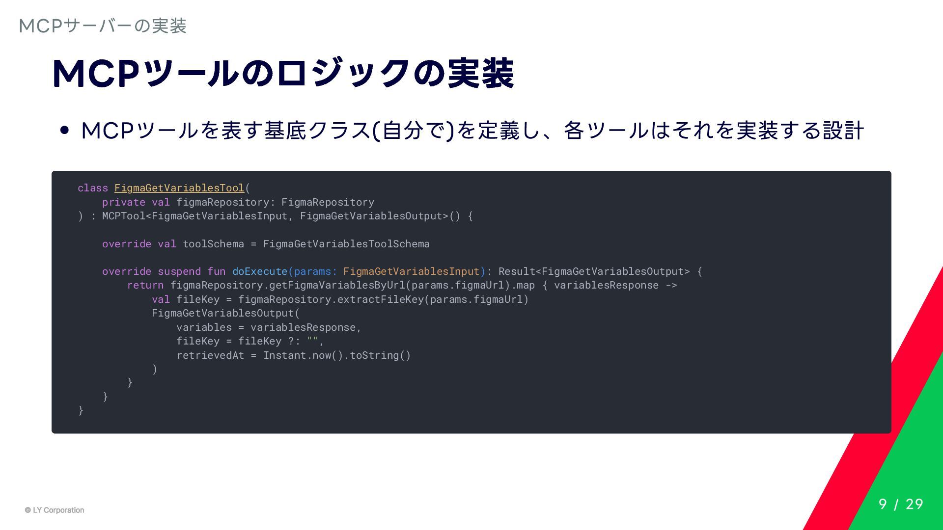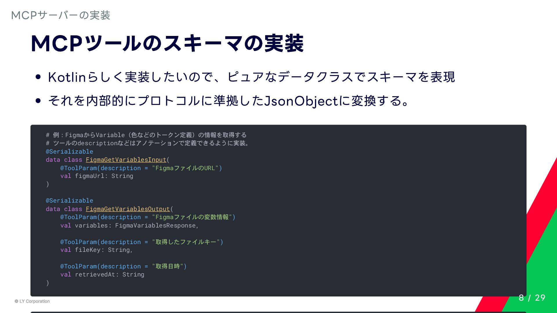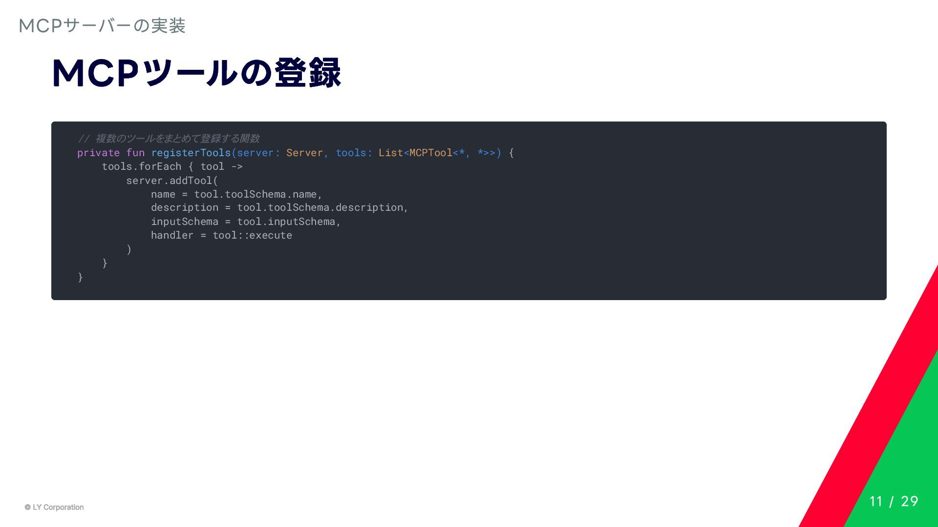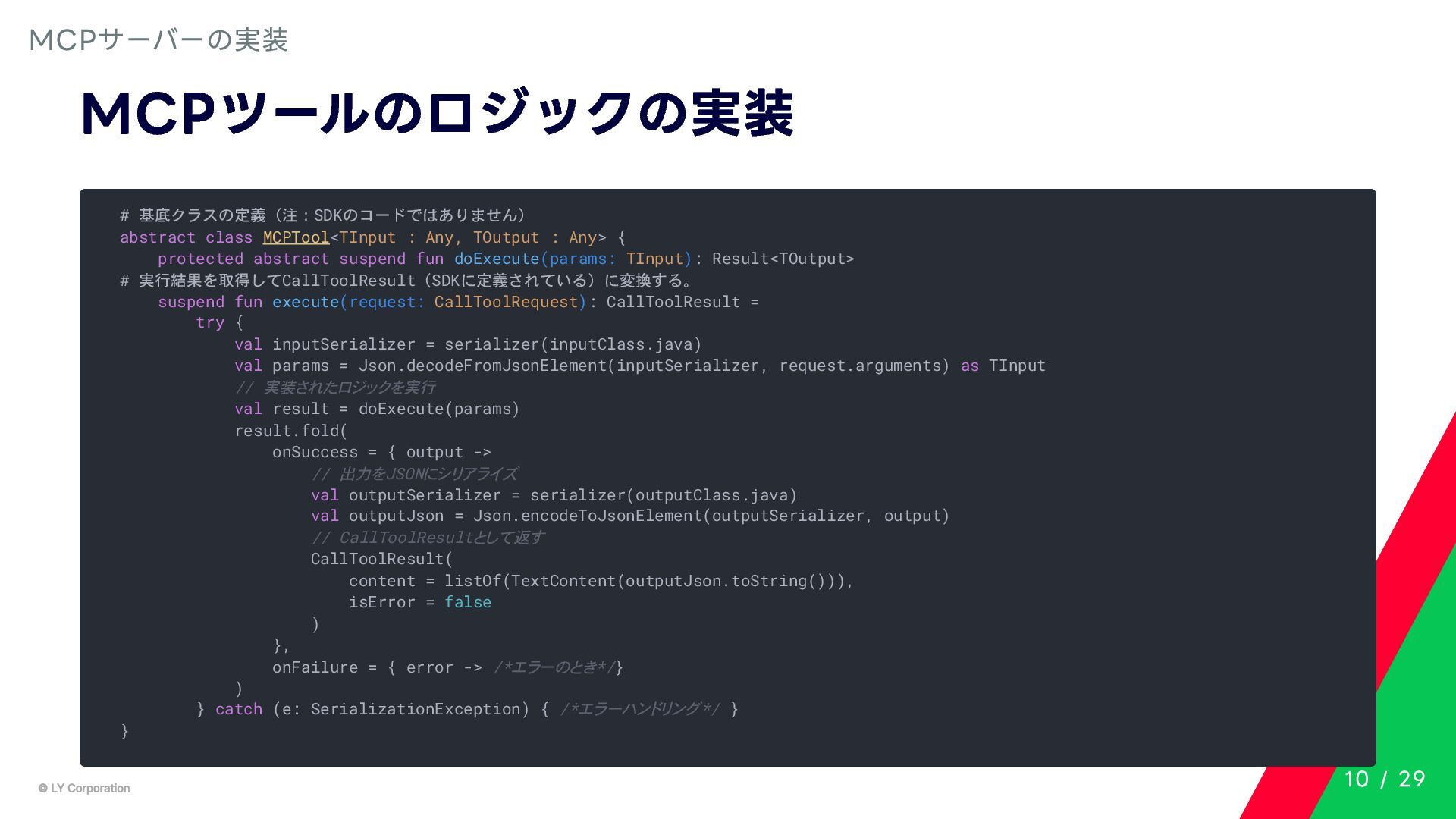 Any> { protected abstract suspend fun doExecute(params: TInput): Result<TOutput> # 実行結果を取得してCallToolResult(SDKに定義されている)に変換する。 suspend fun execute(request: CallToolRequest): CallToolResult = try { val inputSerializer = serializer(inputClass.java) val params = Json.decodeFromJsonElement(inputSerializer, request.arguments) as TInput // 実装されたロジックを実行 val result = doExecute(params) result.fold( onSuccess = { output -> // 出力をJSONにシリアライズ val outputSerializer = serializer(outputClass.java) val outputJson = Json.encodeToJsonElement(outputSerializer, output) // CallToolResultとして返す CallToolResult( content = listOf(TextContent(outputJson.toString())), isError = false ) }, onFailure = { error -> /*エラーのとき*/} ) } catch (e: SerializationException) { /*エラーハンドリング*/ } } MCPサーバーの実装 10 / 29