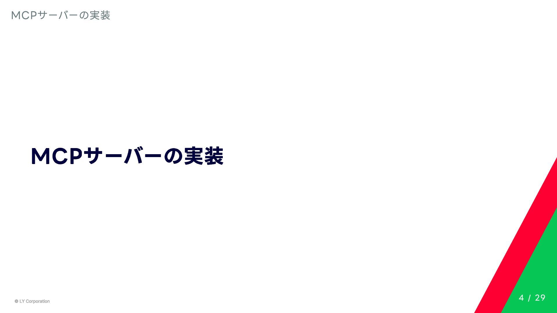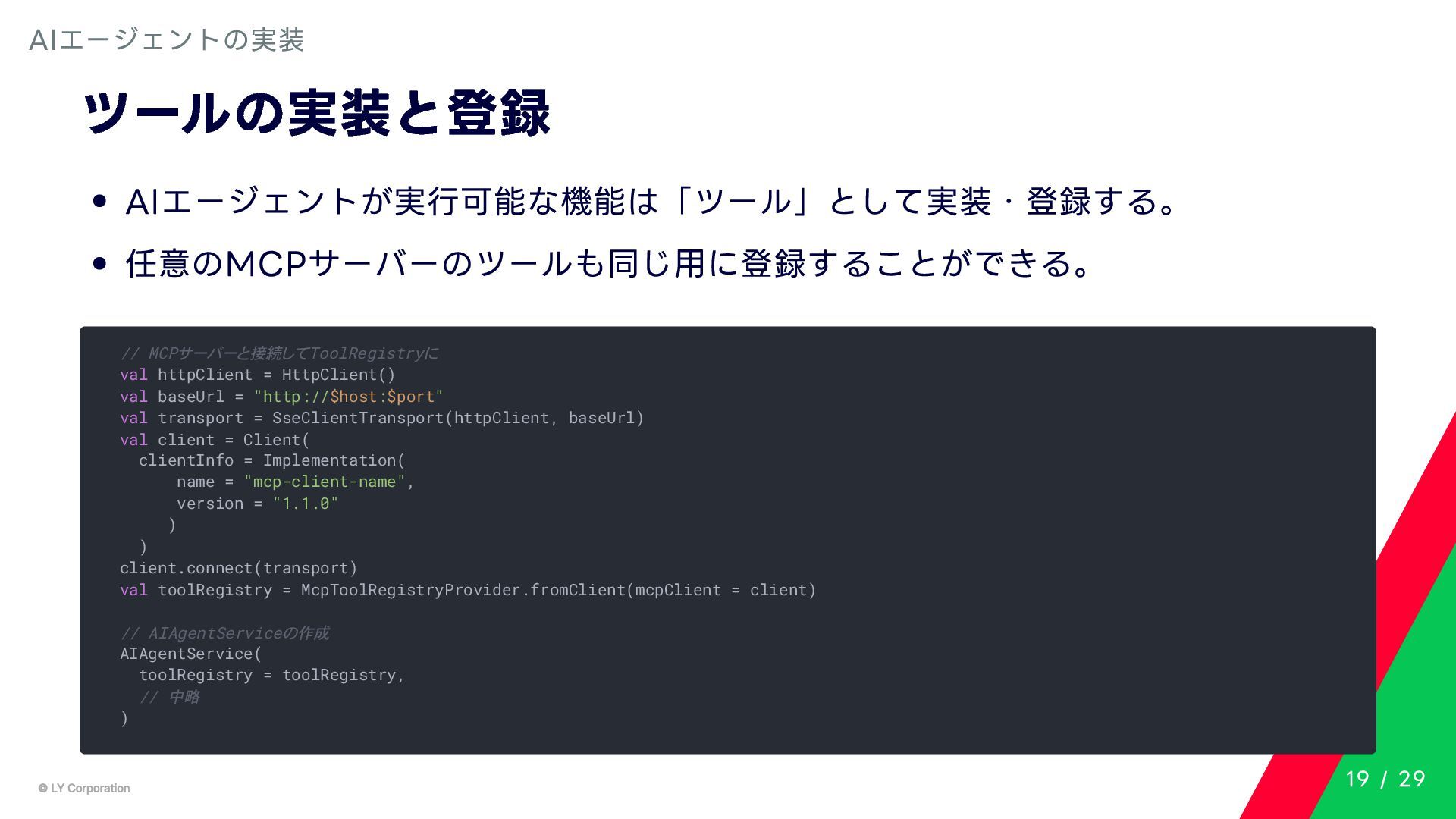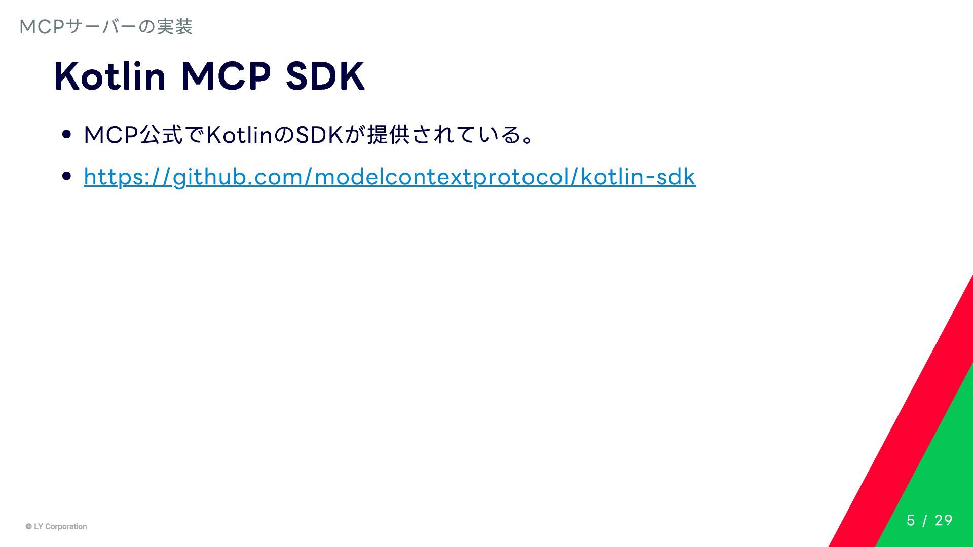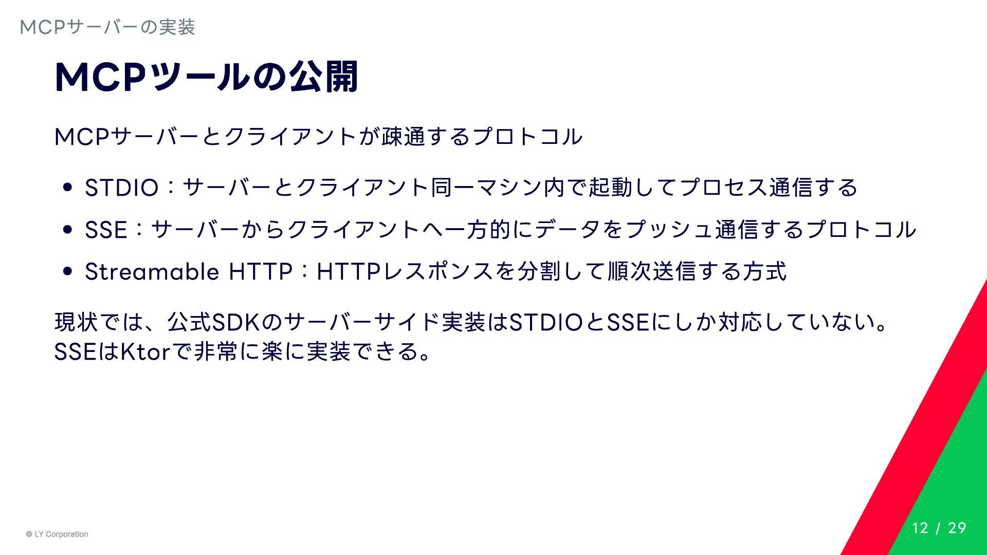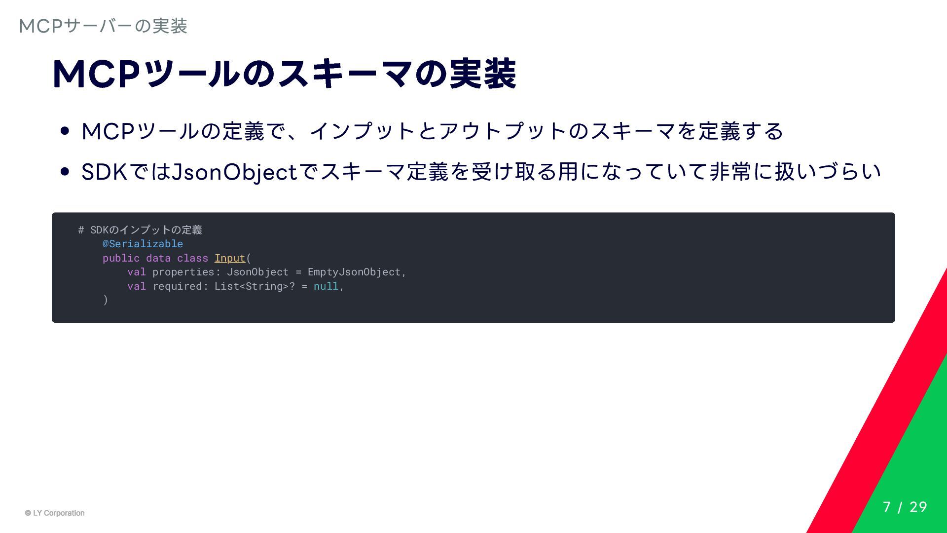 Any> { protected abstract suspend fun doExecute(params: TInput): Result<TOutput> # 実行結果を取得してCallToolResult(SDKに定義されている)に変換する。 suspend fun execute(request: CallToolRequest): CallToolResult = try { val inputSerializer = serializer(inputClass.java) val params = Json.decodeFromJsonElement(inputSerializer, request.arguments) as TInput // 実装されたロジックを実行 val result = doExecute(params) result.fold( onSuccess = { output -> // 出力をJSONにシリアライズ val outputSerializer = serializer(outputClass.java) val outputJson = Json.encodeToJsonElement(outputSerializer, output) // CallToolResultとして返す CallToolResult( content = listOf(TextContent(outputJson.toString())), isError = false ) }, onFailure = { error -> /*エラーのとき*/} ) } catch (e: SerializationException) { /*エラーハンドリング*/ } } MCPサーバーの実装 10 / 29