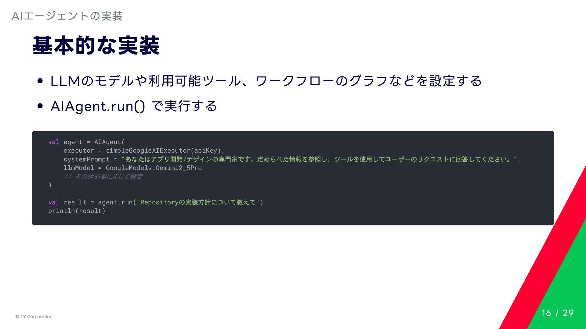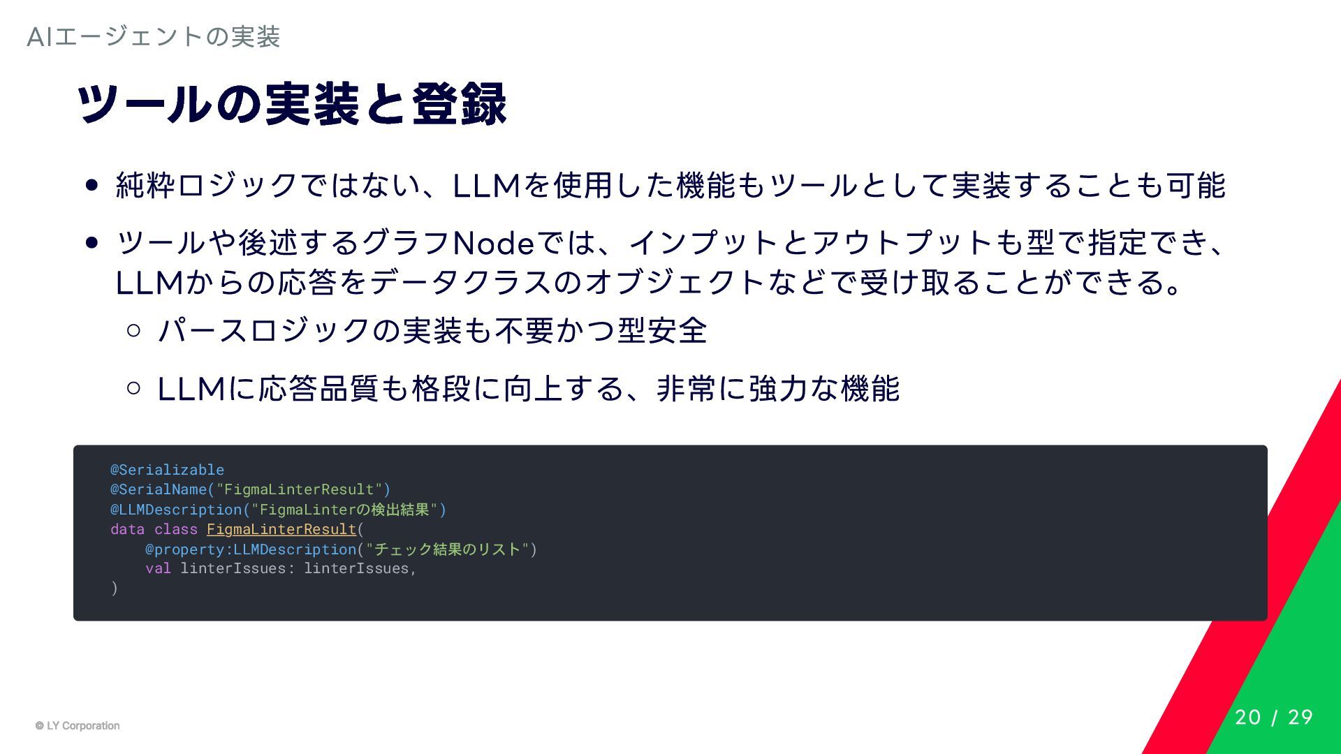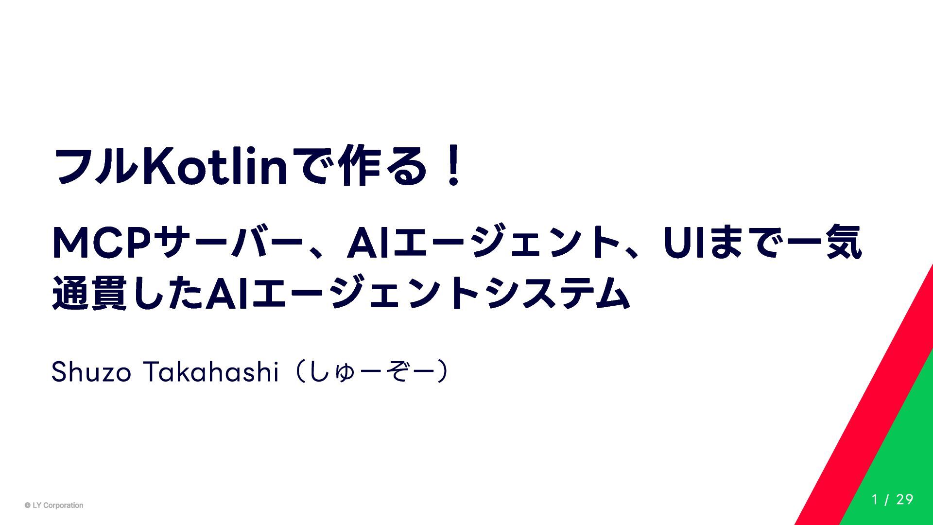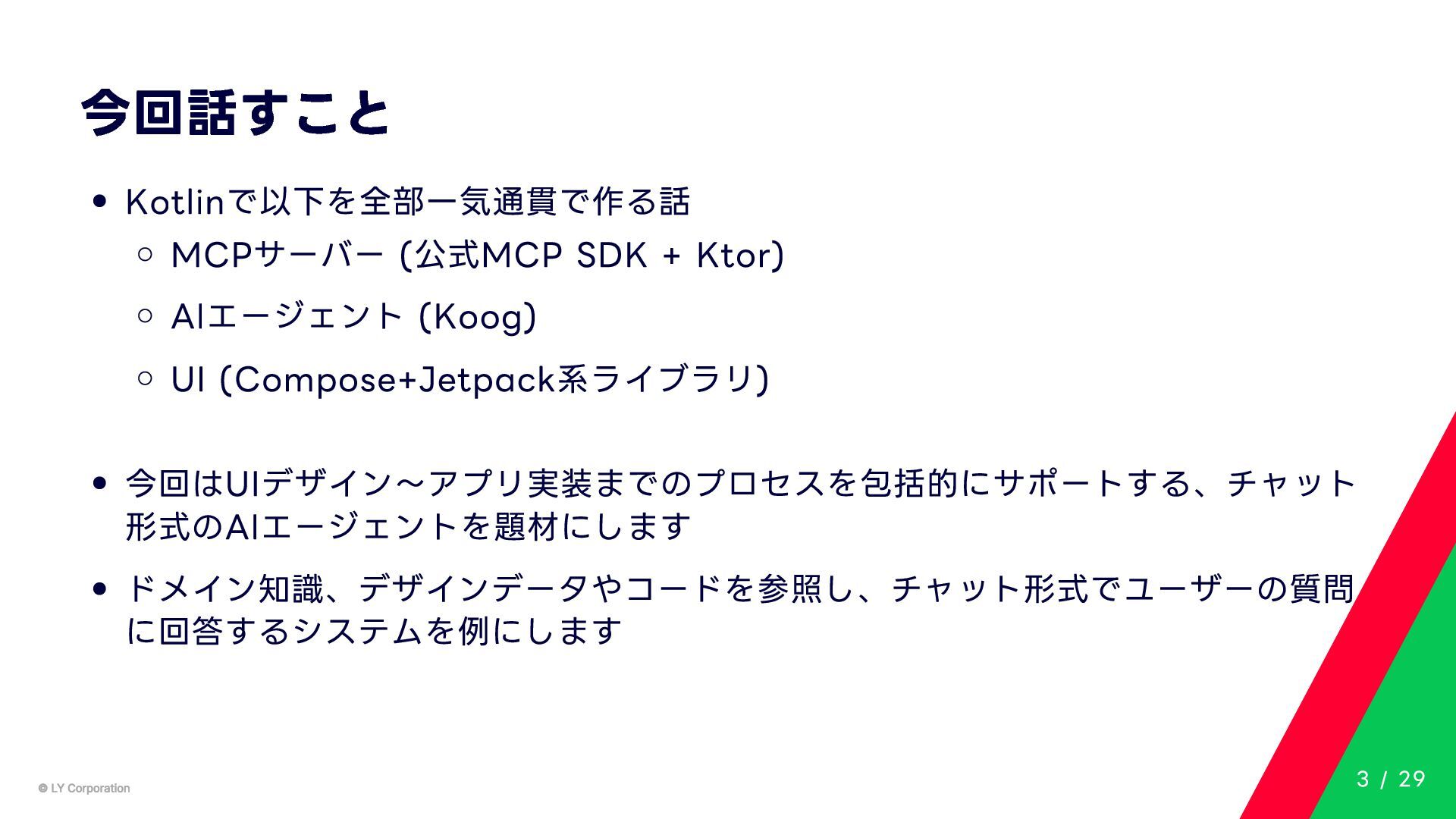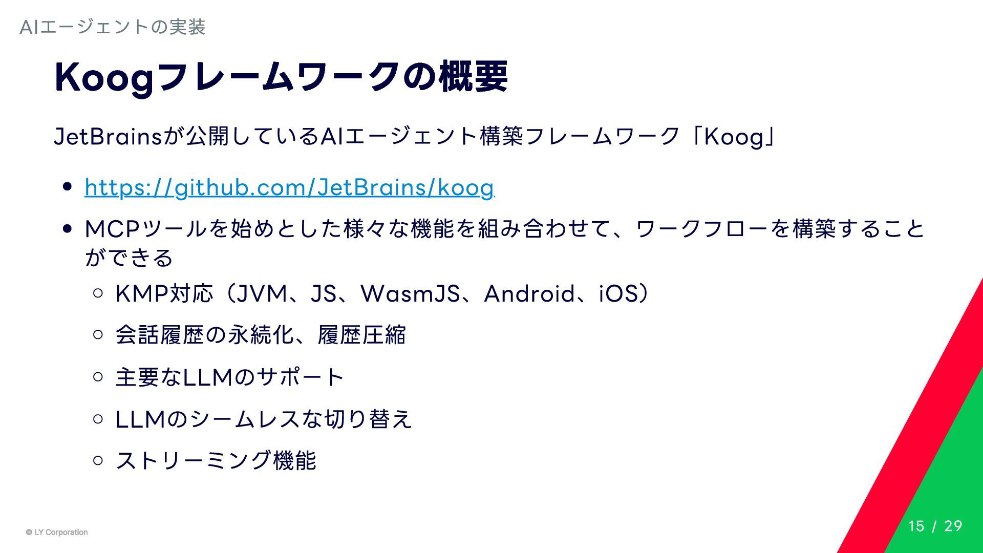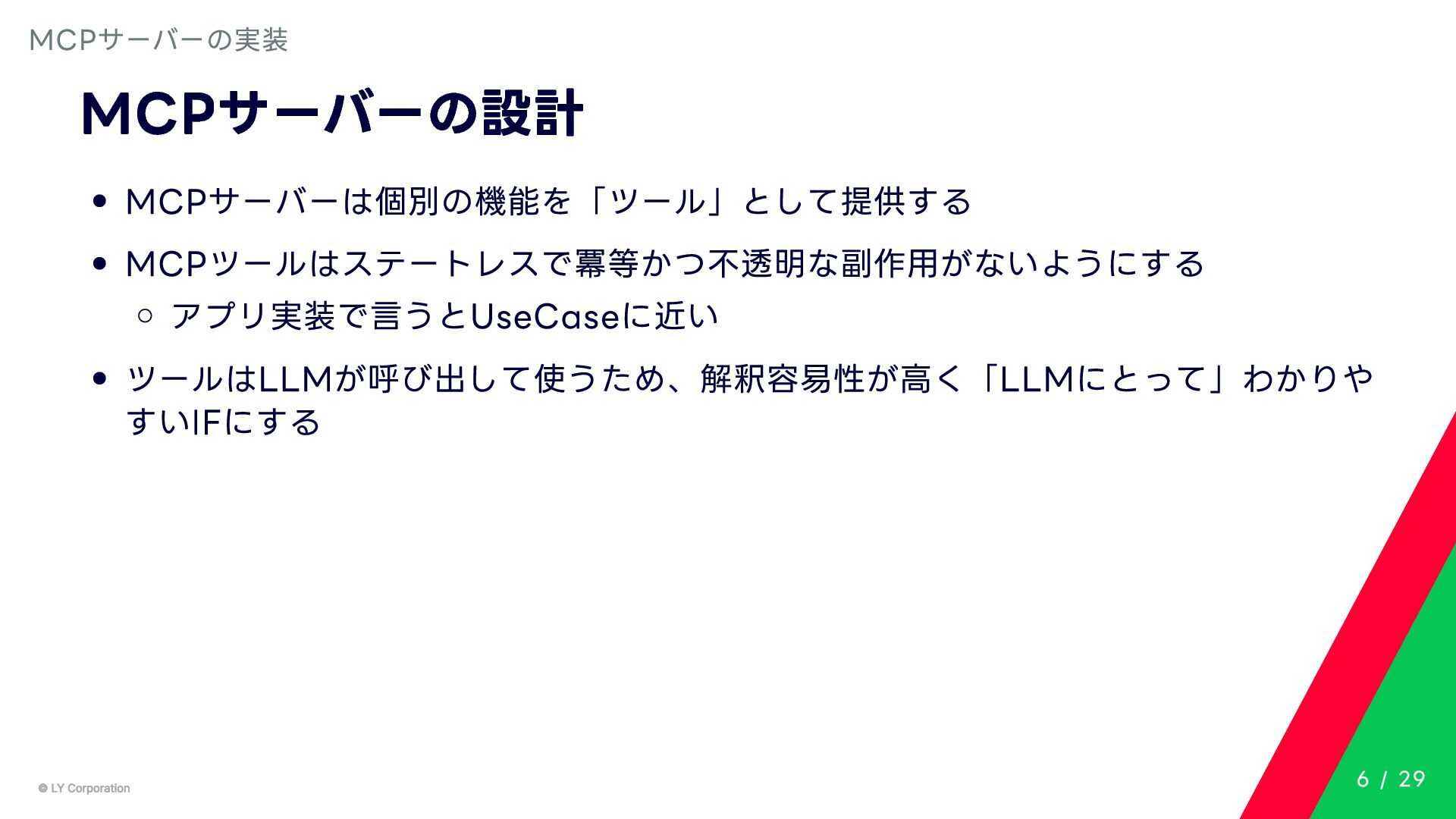 Any> { protected abstract suspend fun doExecute(params: TInput): Result<TOutput> # 実行結果を取得してCallToolResult(SDKに定義されている)に変換する。 suspend fun execute(request: CallToolRequest): CallToolResult = try { val inputSerializer = serializer(inputClass.java) val params = Json.decodeFromJsonElement(inputSerializer, request.arguments) as TInput // 実装されたロジックを実行 val result = doExecute(params) result.fold( onSuccess = { output -> // 出力をJSONにシリアライズ val outputSerializer = serializer(outputClass.java) val outputJson = Json.encodeToJsonElement(outputSerializer, output) // CallToolResultとして返す CallToolResult( content = listOf(TextContent(outputJson.toString())), isError = false ) }, onFailure = { error -> /*エラーのとき*/} ) } catch (e: SerializationException) { /*エラーハンドリング*/ } } MCPサーバーの実装 10 / 29