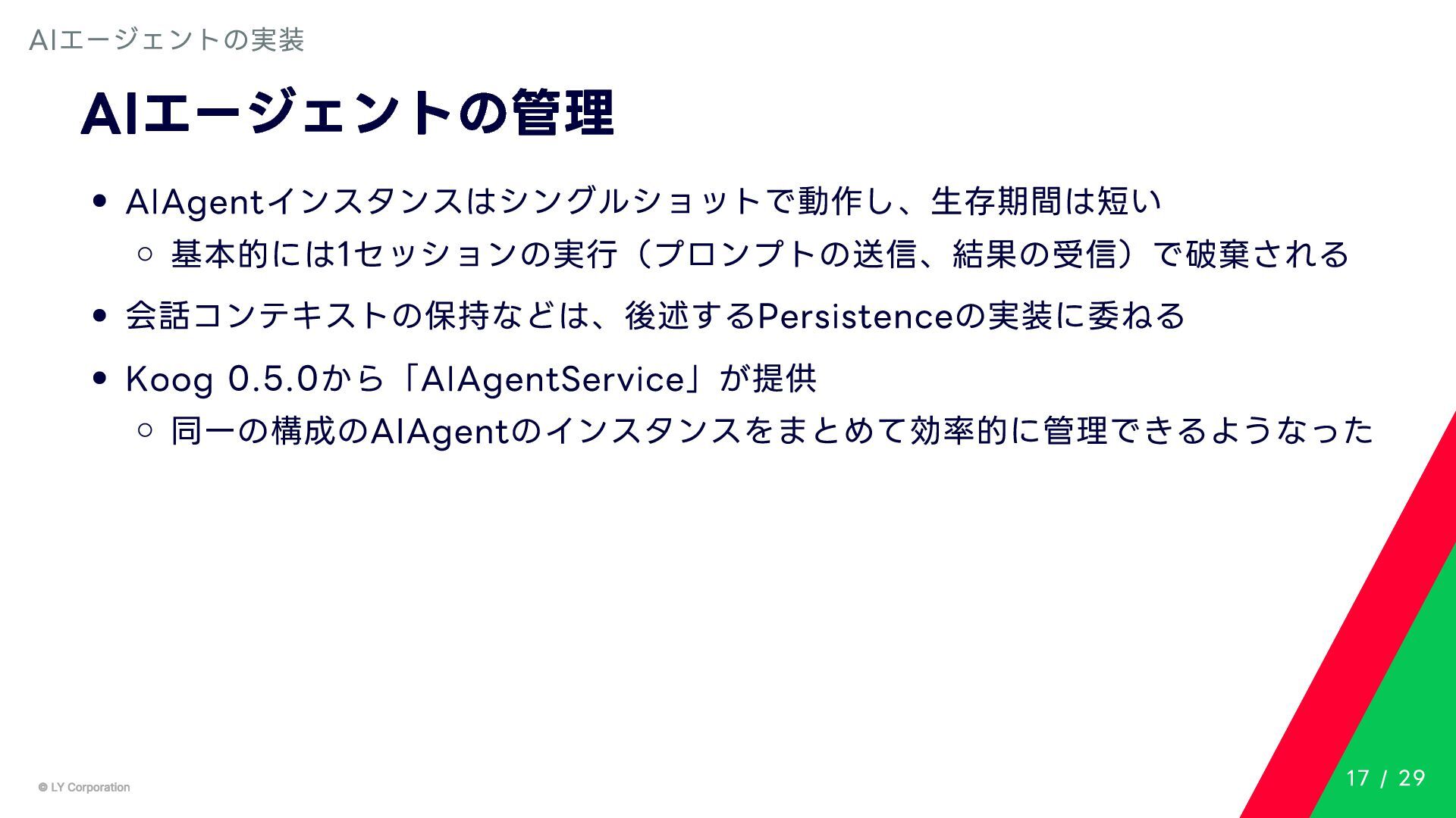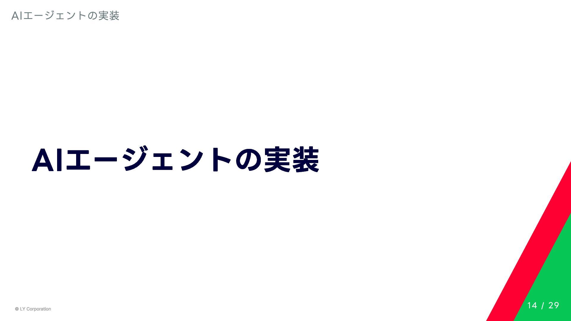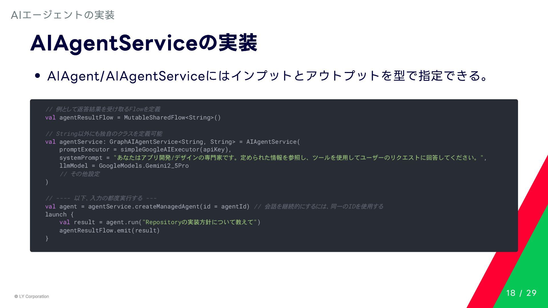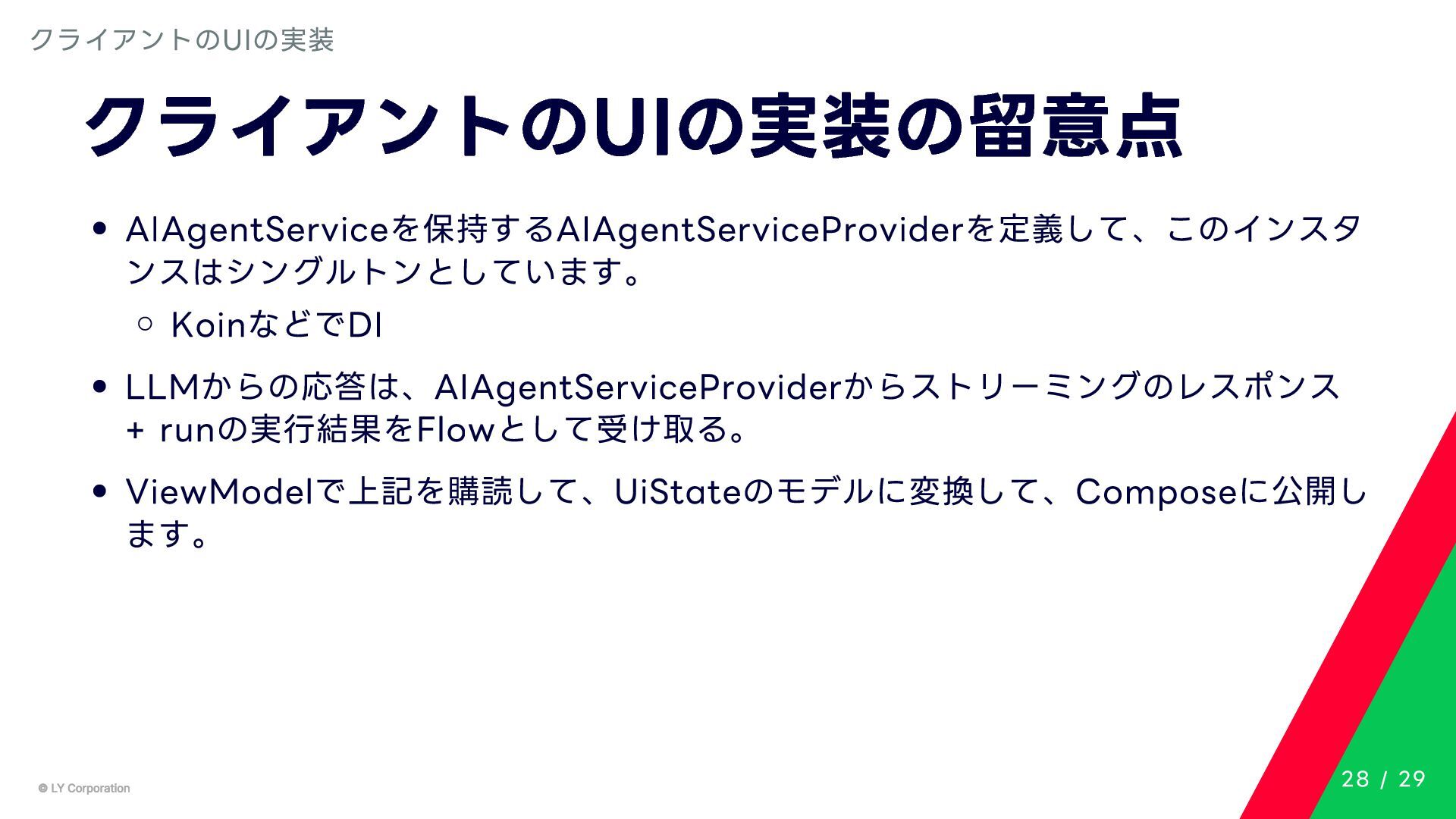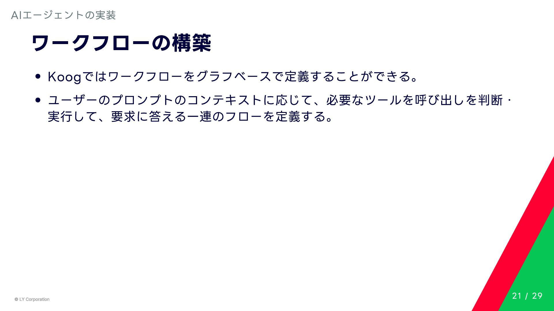 Any> { protected abstract suspend fun doExecute(params: TInput): Result<TOutput> # 実行結果を取得してCallToolResult(SDKに定義されている)に変換する。 suspend fun execute(request: CallToolRequest): CallToolResult = try { val inputSerializer = serializer(inputClass.java) val params = Json.decodeFromJsonElement(inputSerializer, request.arguments) as TInput // 実装されたロジックを実行 val result = doExecute(params) result.fold( onSuccess = { output -> // 出力をJSONにシリアライズ val outputSerializer = serializer(outputClass.java) val outputJson = Json.encodeToJsonElement(outputSerializer, output) // CallToolResultとして返す CallToolResult( content = listOf(TextContent(outputJson.toString())), isError = false ) }, onFailure = { error -> /*エラーのとき*/} ) } catch (e: SerializationException) { /*エラーハンドリング*/ } } MCPサーバーの実装 10 / 29
