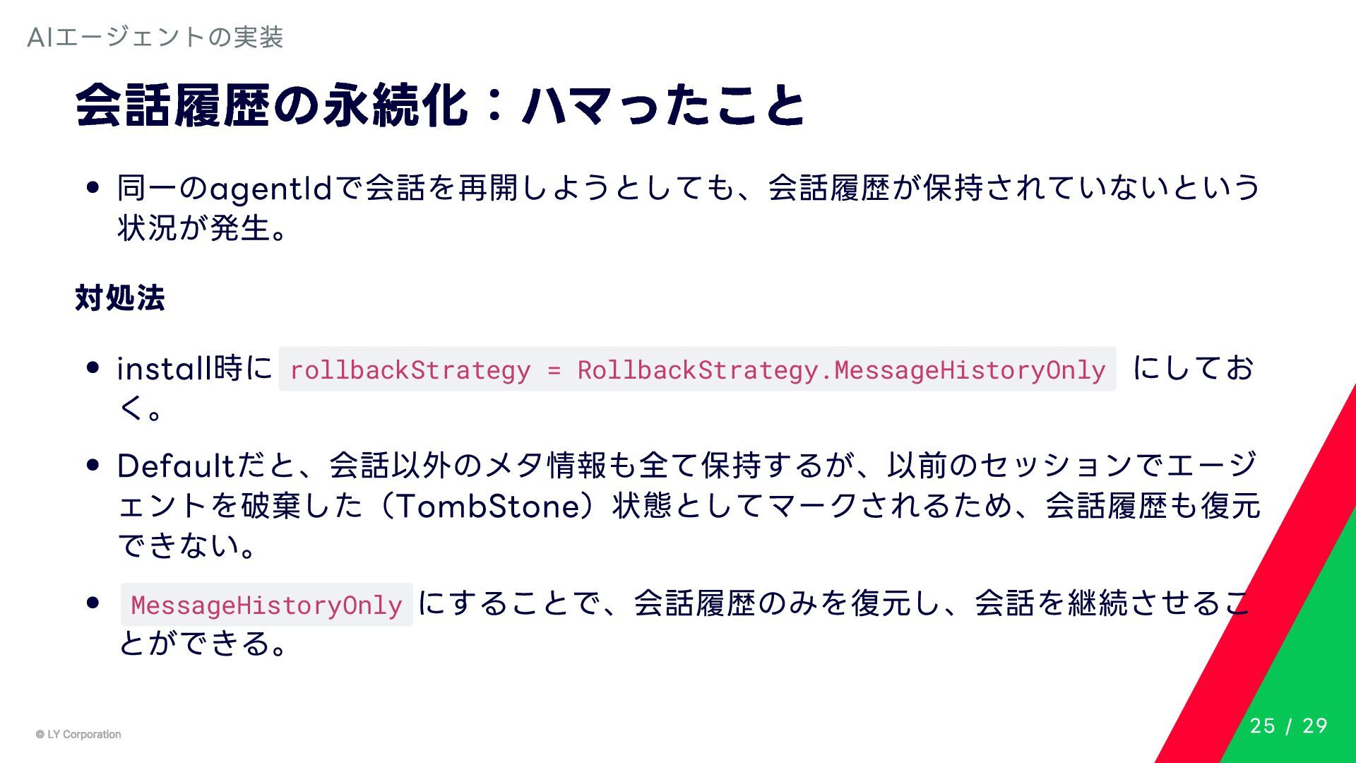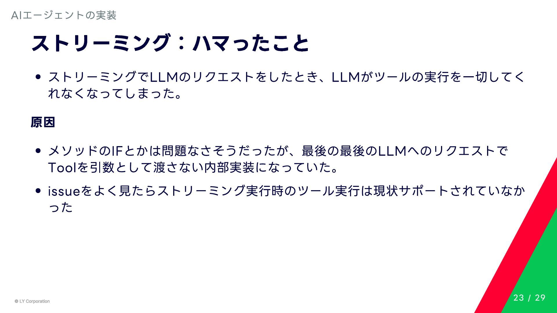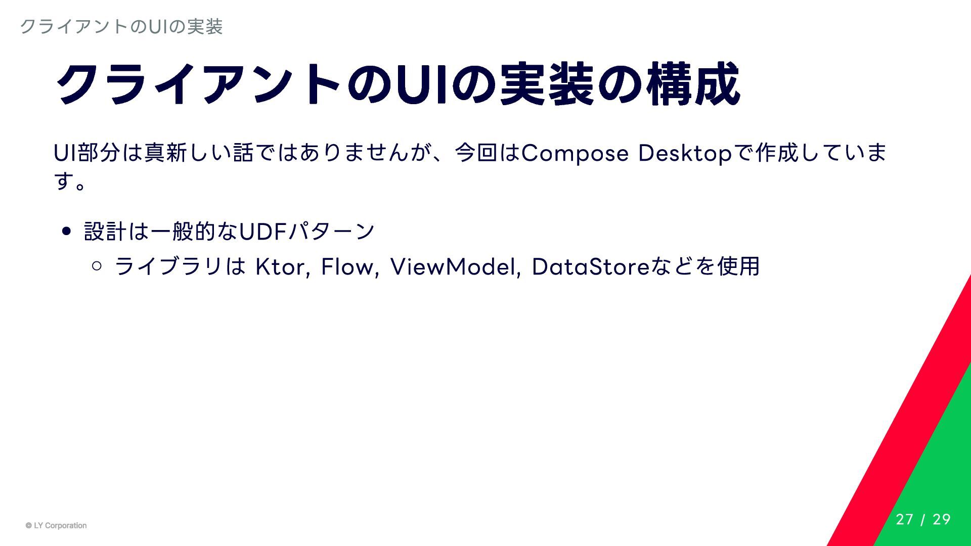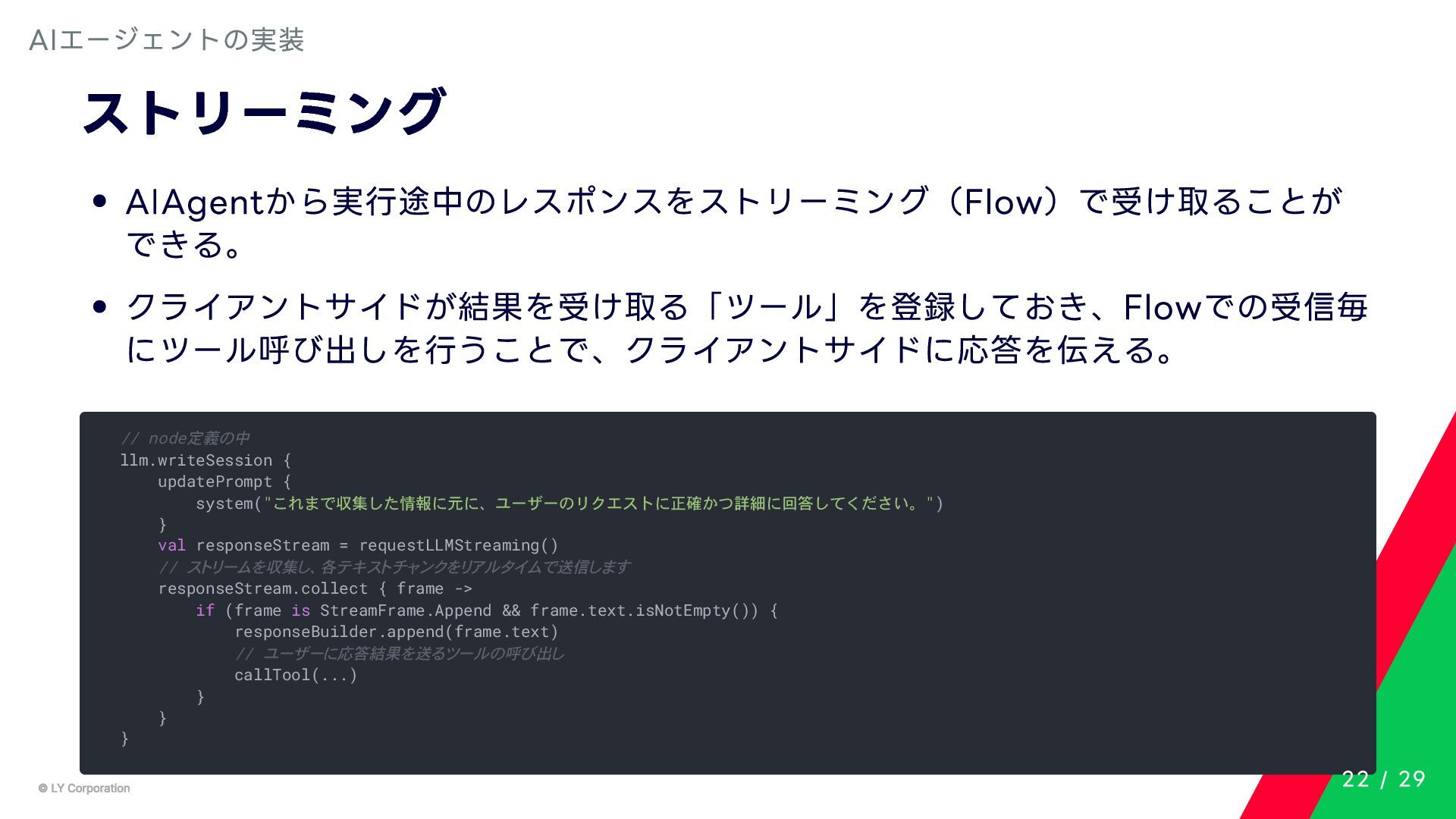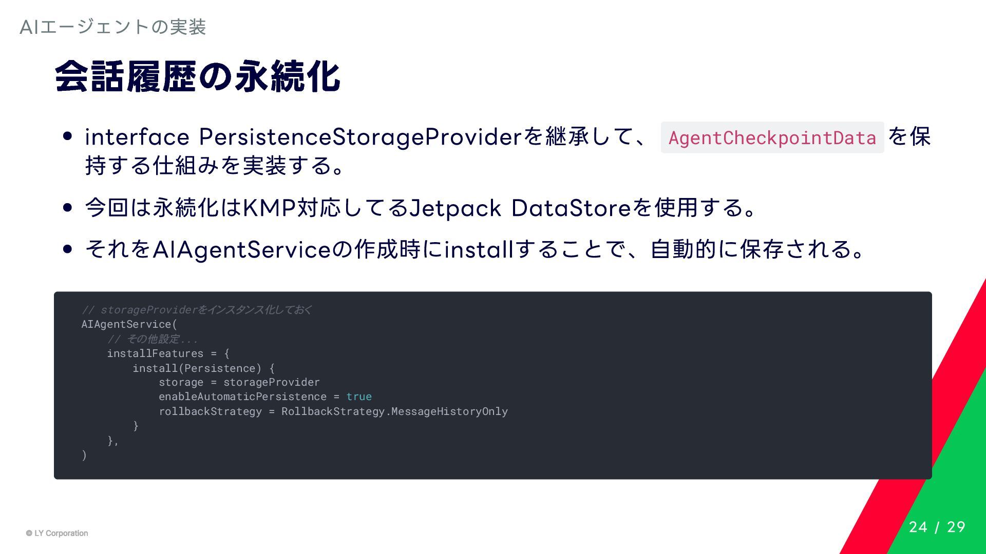 Any> { protected abstract suspend fun doExecute(params: TInput): Result<TOutput> # 実行結果を取得してCallToolResult(SDKに定義されている)に変換する。 suspend fun execute(request: CallToolRequest): CallToolResult = try { val inputSerializer = serializer(inputClass.java) val params = Json.decodeFromJsonElement(inputSerializer, request.arguments) as TInput // 実装されたロジックを実行 val result = doExecute(params) result.fold( onSuccess = { output -> // 出力をJSONにシリアライズ val outputSerializer = serializer(outputClass.java) val outputJson = Json.encodeToJsonElement(outputSerializer, output) // CallToolResultとして返す CallToolResult( content = listOf(TextContent(outputJson.toString())), isError = false ) }, onFailure = { error -> /*エラーのとき*/} ) } catch (e: SerializationException) { /*エラーハンドリング*/ } } MCPサーバーの実装 10 / 29