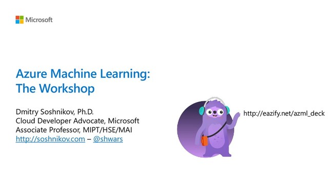 (slightly outdated): • The best way to start with Azure ML using VS Code • Using Azure ML for Hyperparameter Optimization • Training GAN to Produce Art • Training BERT Question Answering with DeepPavlov ❶ ❷ Try it out: http://github.com/CloudAdvocacy/AzureMLStarter