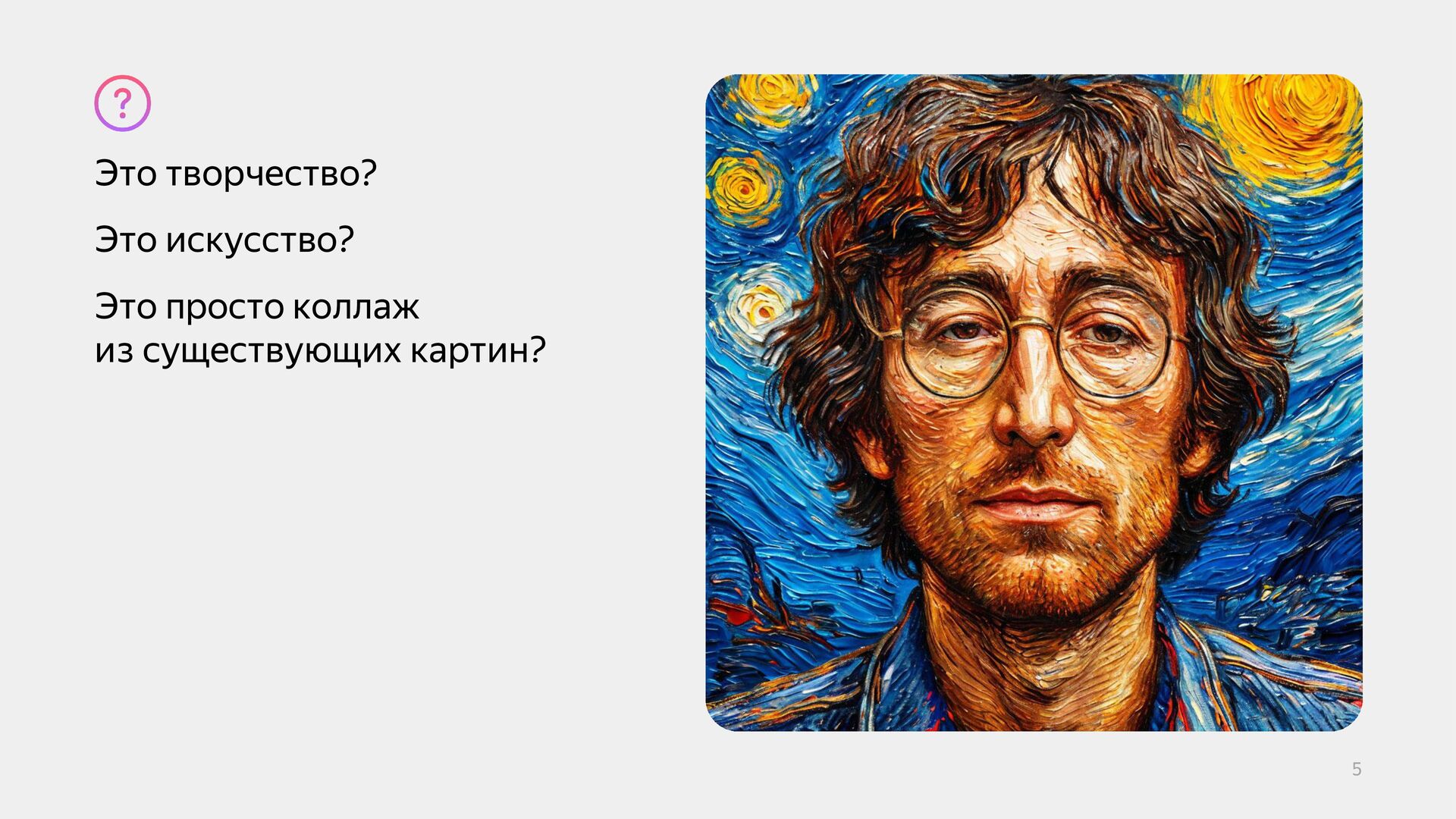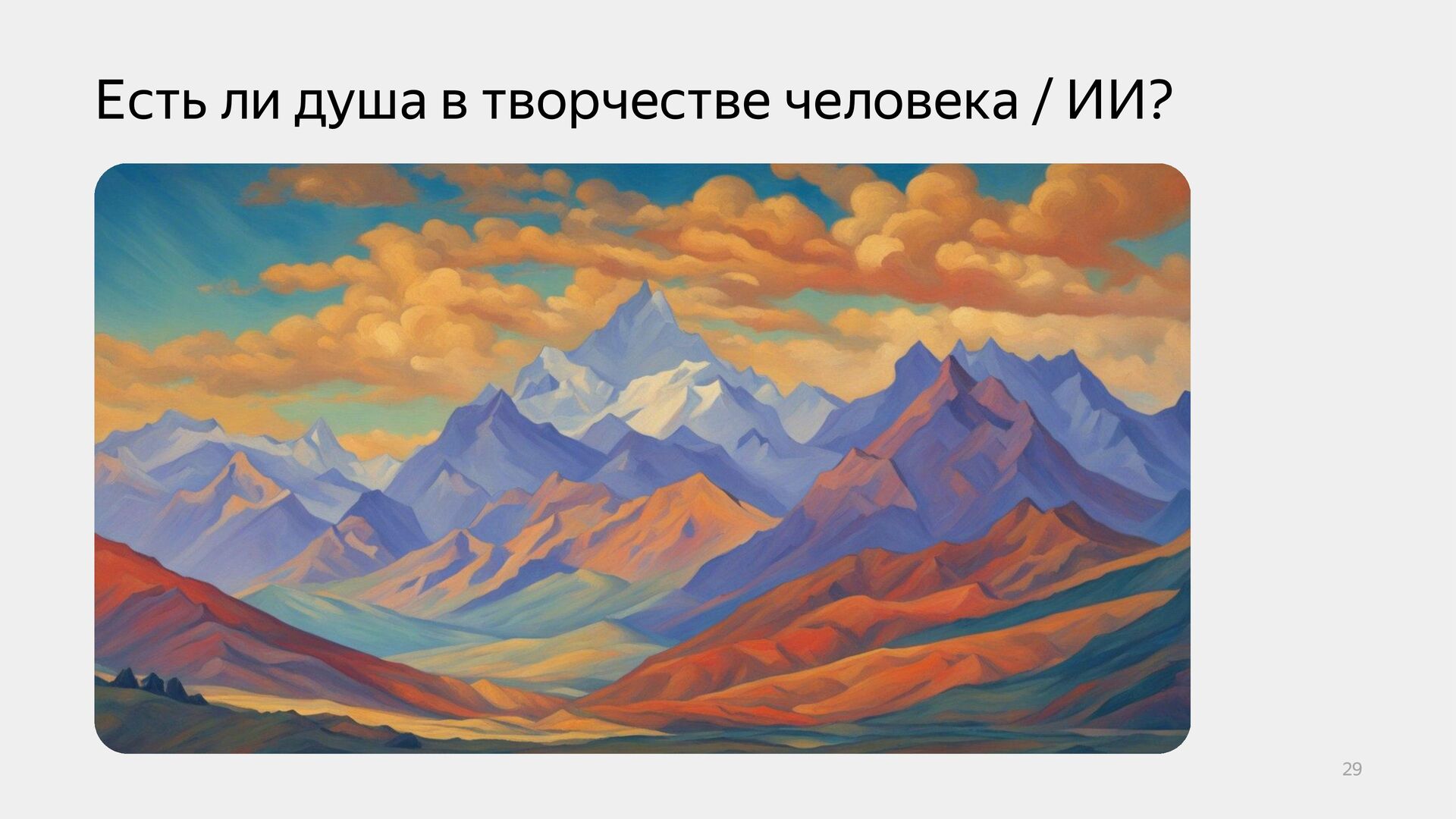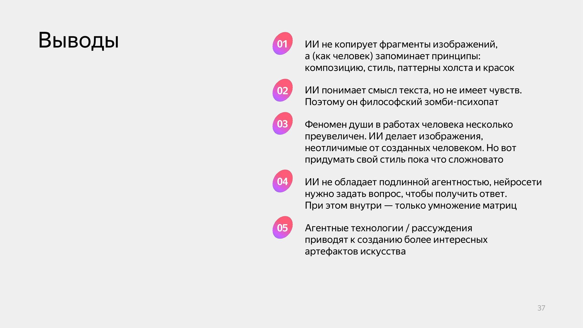запоминает принципы: композицию, стиль, паттерны холста и красок ИИ понимает смысл текста, но не имеет чувств. Поэтому он философский зомби-психопат Феномен души в работах человека несколько преувеличен. ИИ делает изображения, неотличимые от созданных человеком. Но вот придумать свой стиль пока что сложновато ИИ не обладает подлинной агентностью, нейросети нужно задать вопрос, чтобы получить ответ. При этом внутри — только умножение матриц Агентные технологии / рассуждения приводят к созданию более интересных артефактов искусства