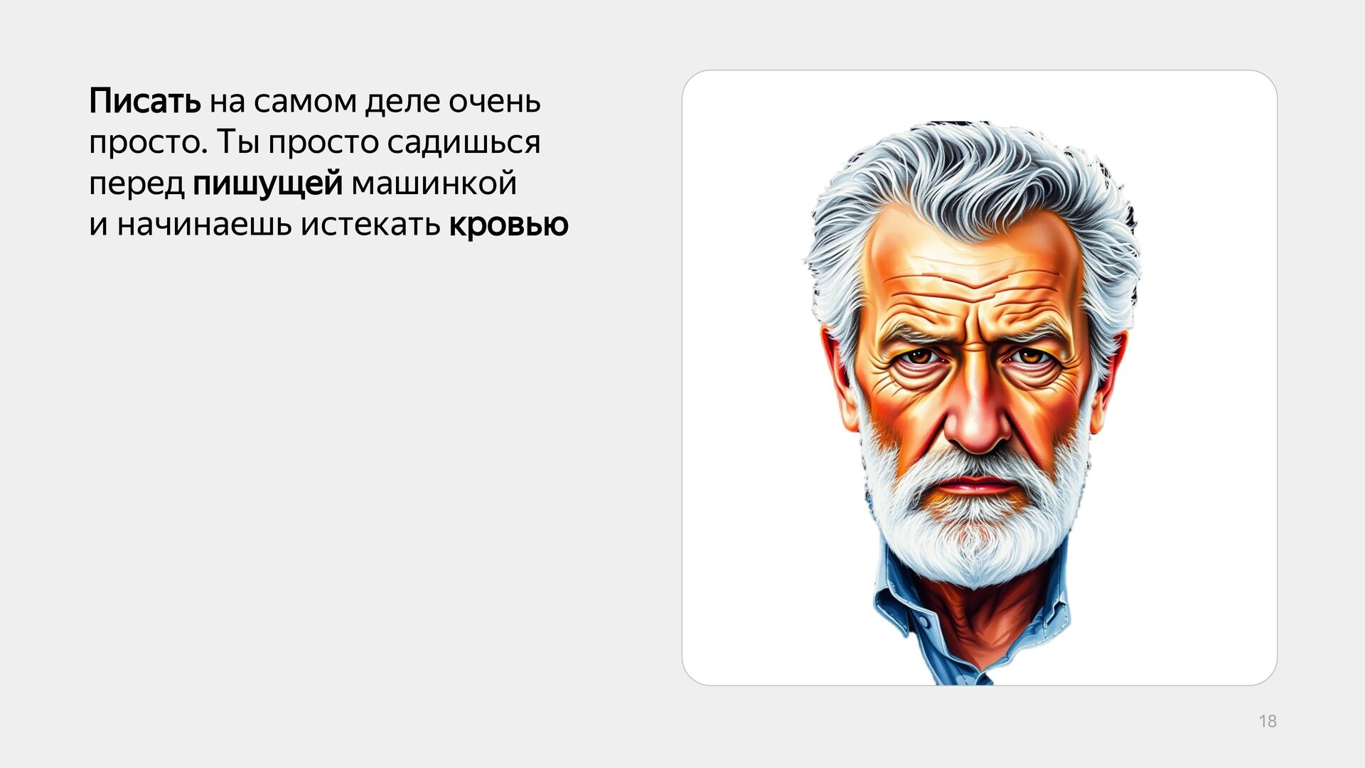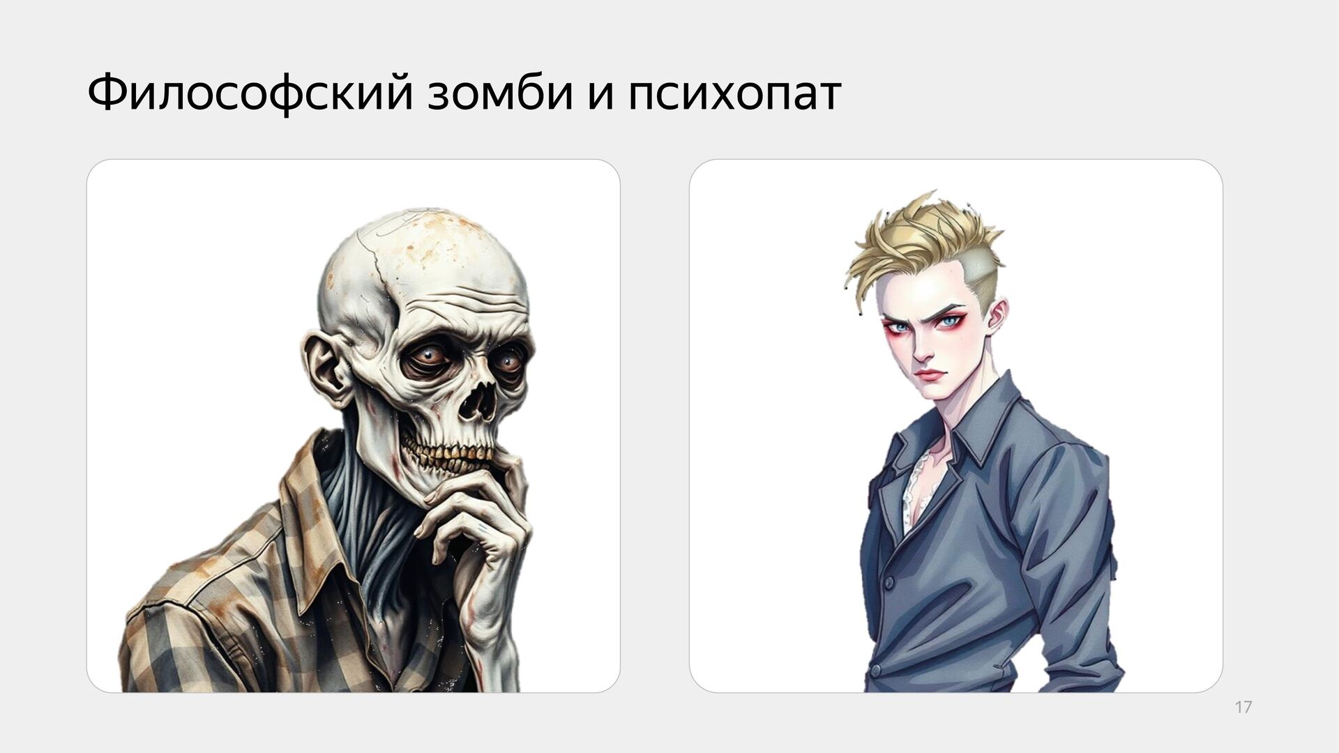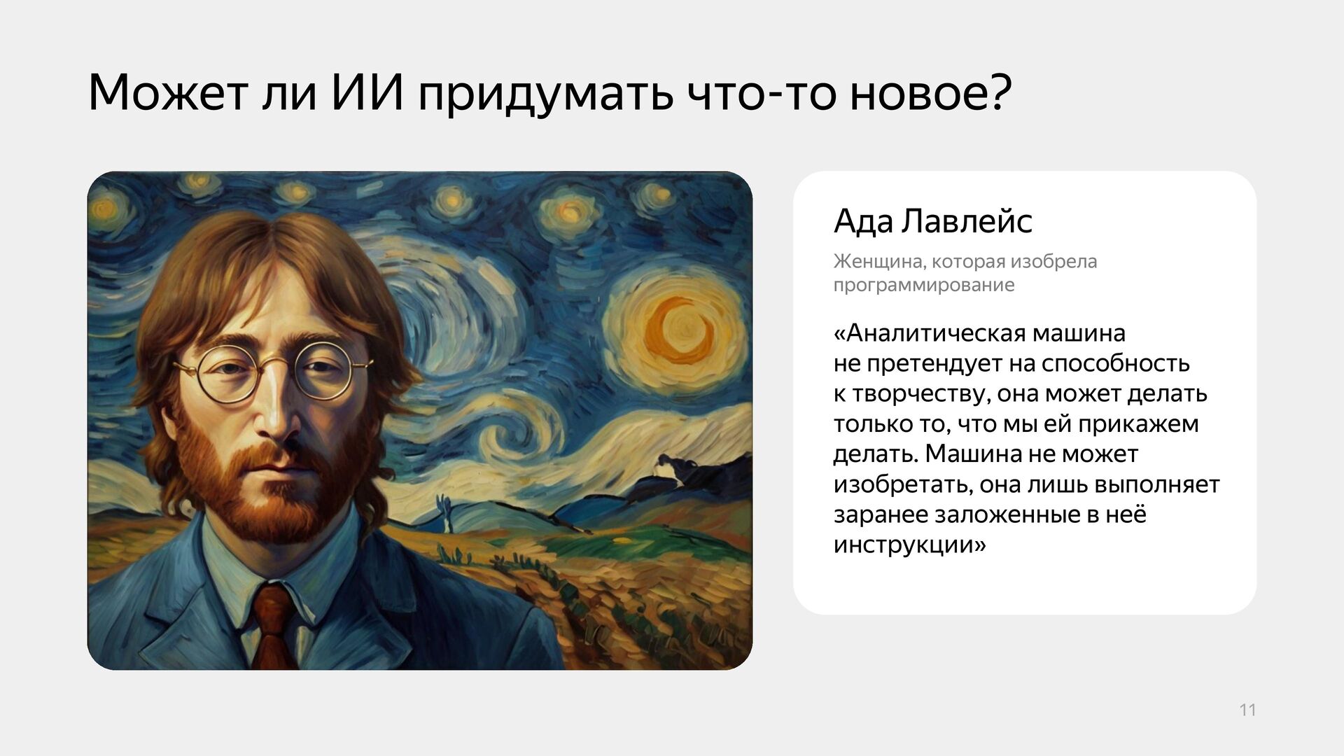 запоминает принципы: композицию, стиль, паттерны холста и красок ИИ понимает смысл текста, но не имеет чувств. Поэтому он философский зомби-психопат Феномен души в работах человека несколько преувеличен. ИИ делает изображения, неотличимые от созданных человеком. Но вот придумать свой стиль пока что сложновато ИИ не обладает подлинной агентностью, нейросети нужно задать вопрос, чтобы получить ответ. При этом внутри — только умножение матриц Агентные технологии / рассуждения приводят к созданию более интересных артефактов искусства
