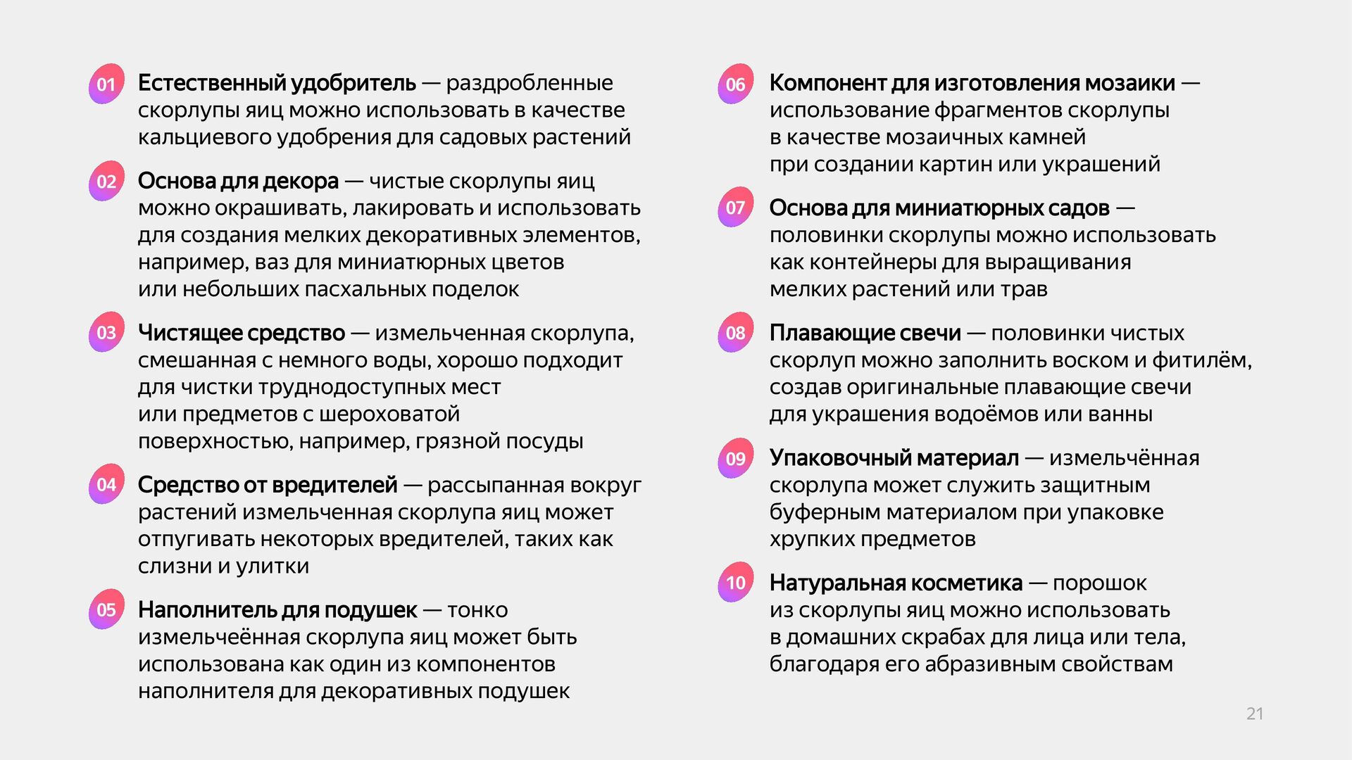 качестве кальциевого удобрения для садовых растений Основа для декора — чистые скорлупы яиц можно окрашивать, лакировать и использовать для создания мелких декоративных элементов, например, ваз для миниатюрных цветов или небольших пасхальных поделок Чистящее средство — измельченная скорлупа, смешанная с немного воды, хорошо подходит для чистки труднодоступных мест или предметов с шероховатой поверхностью, например, грязной посуды Средство от вредителей — рассыпанная вокруг растений измельченная скорлупа яиц может отпугивать некоторых вредителей, таких как слизни и улитки Наполнитель для подушек — тонко измельчеённая скорлупа яиц может быть использована как один из компонентов наполнителя для декоративных подушек Компонент для изготовления мозаики — использование фрагментов скорлупы в качестве мозаичных камней при создании картин или украшений Основа для миниатюрных садов — половинки скорлупы можно использовать как контейнеры для выращивания мелких растений или трав Плавающие свечи — половинки чистых скорлуп можно заполнить воском и фитилём, создав оригинальные плавающие свечи для украшения водоёмов или ванны Упаковочный материал — измельчённая скорлупа может служить защитным буферным материалом при упаковке хрупких предметов Натуральная косметика — порошок из скорлупы яиц можно использовать в домашних скрабах для лица или тела, благодаря его абразивным свойствам